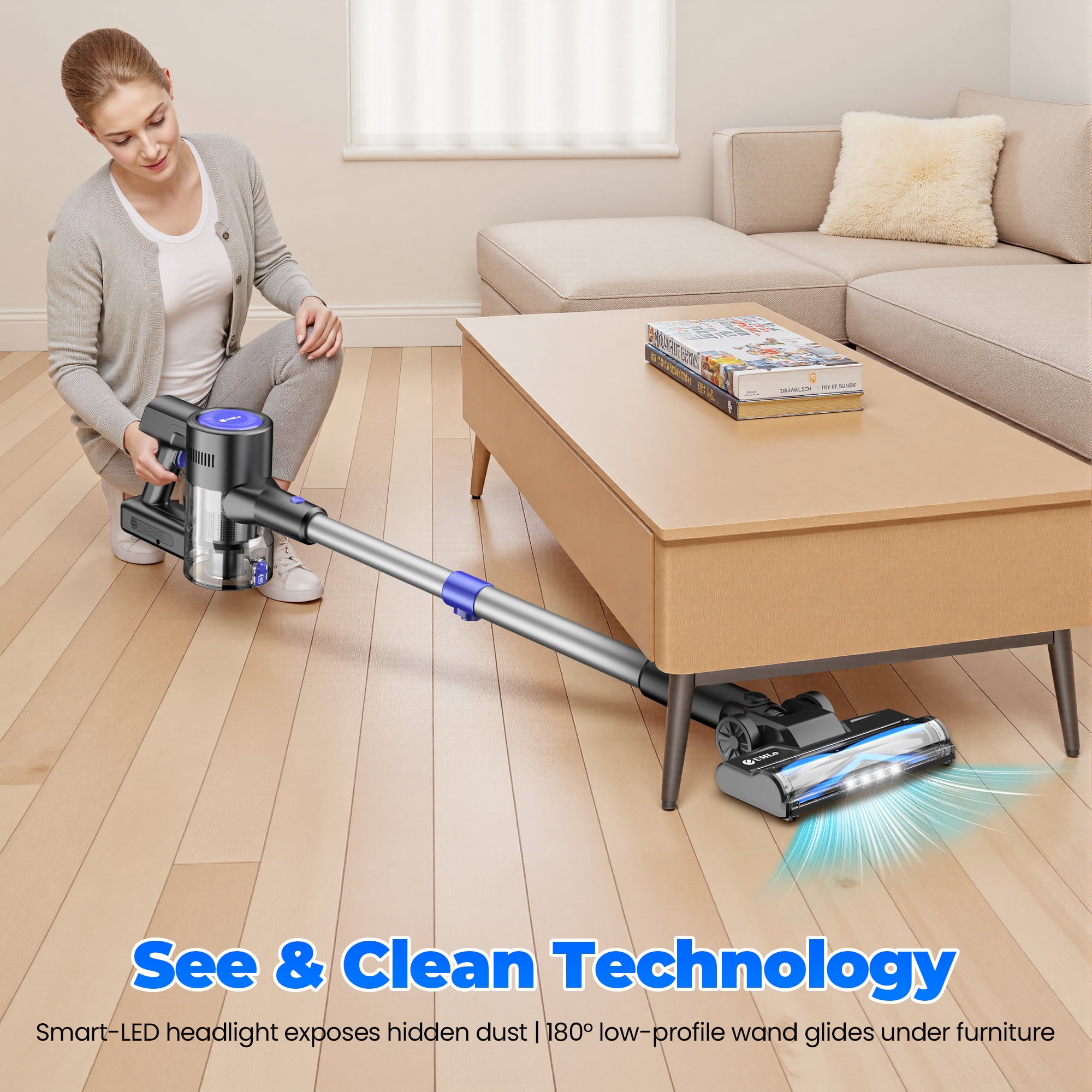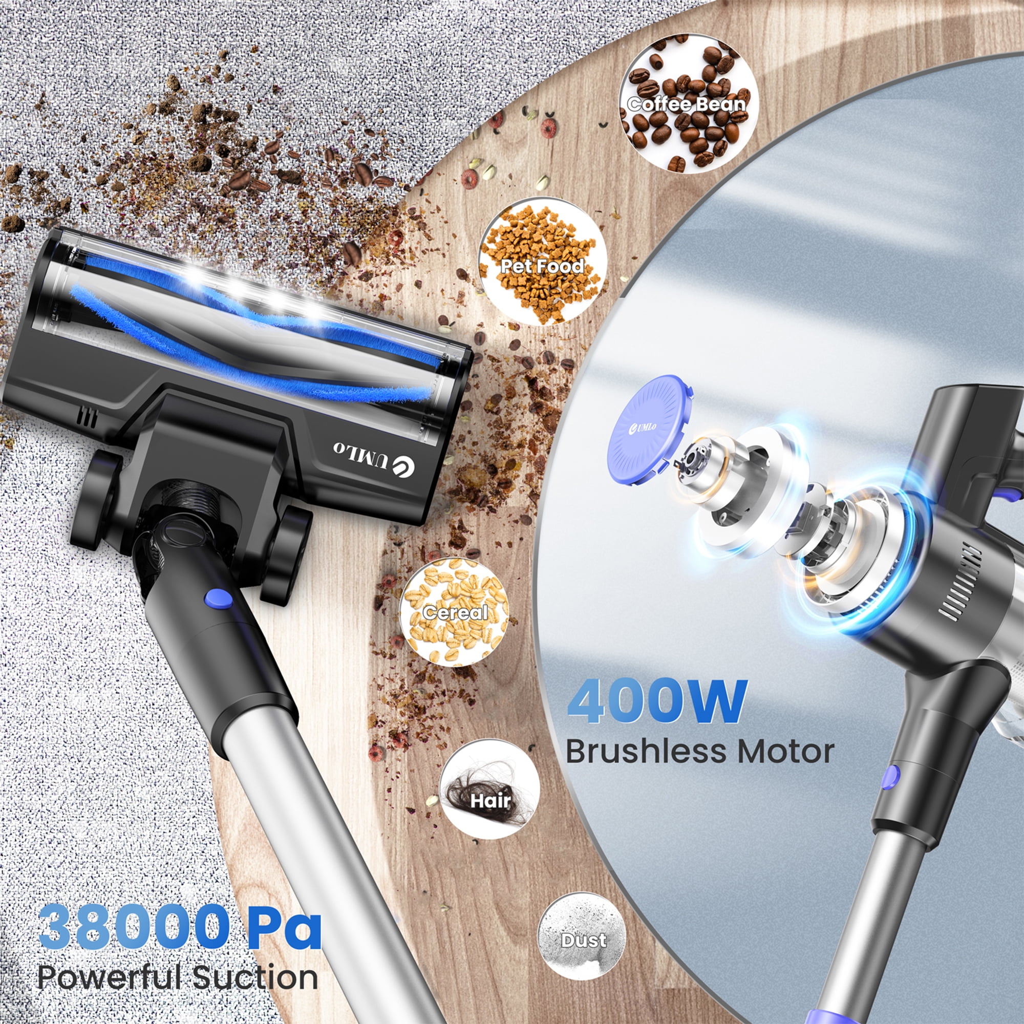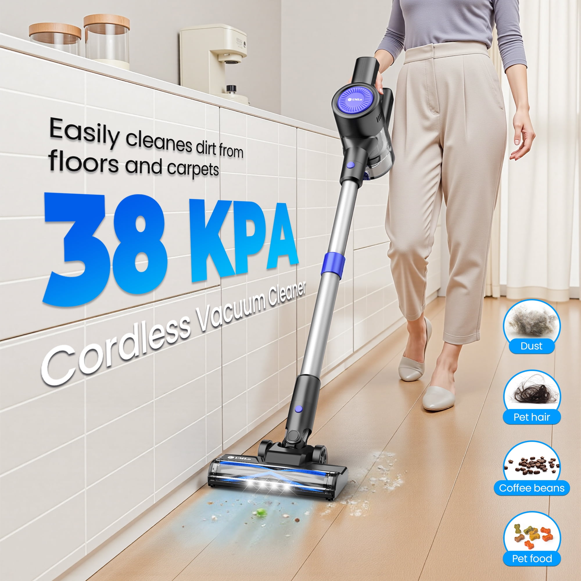 ✔ 400W Brushless Motor Power The UMLo cordless vacuum cleaner is an absolute powerhouse! This amazing little machine has a high-performance 400W brushless motor that delivers an impressive 38Kpa of strong suction on max mode! We’ve made sure you’re never left in a sticky situation with three different suction modes (20KPA/38KPA) to choose from. Not only are they super helpful, but they also help save power! ✔ 50-Min Extended Runtime This wonderful battery-operated vacuum cleaner is equipped with a 6-cell 2200 mAh large-capacity rechargeable battery, which provides impressive runtime. This amazing portable vacuum is so reliable! It can last up to 50 minutes on min mode and 20 minutes on max mode, so you can clean your entire home without interruption. ✔ Flexible LED Motorized Floor Brush Head The LED headlights on the floor brush are really handy for seeing into dark corners and tracking down dust, debris, and hair under furniture. They’re also great for getting into all those hard-to-reach corners under furniture and beds to get rid of all that dust! The flexible 180° sideways rotation and 90° up and down rotation are perfect for reaching those tricky spots. ✔ Convenient Accessory Attachments The cordless vacuum cleaner comes with handy brush heads and telescopic stick, so you can get the job done easily and efficiently. The great thing about these accessories is that you can combine them in all kinds of different ways. Making you clean stairs,curtains,windowsills,sofas,beds, cars, RVs, and other hard-to-reach places with ease! This helpful vacuum will take care of all your daily cleaning needs on multiple surfaces, including hardwood floors, carpets, and pet hair or food. ✔ Touch Screen & LED Display You’ll love the large touch screen LED control panel! It’s super easy to show the battery level, suction modes of the stick vacuum. This design is more convenient and trouble-free compared with traditional button operation, so you can get on with your clean time without any fuss! ✔ 99.99% Efficiency Filtration System UMLo cordless stick vacuum cleaner has a 5-stage high-efficiency filtration system and washable HEPA filters that can capture up to 99.99% of microscopic fine particles as small as 0.1 microns. Home c ordless vacuum cleaner is so safe and friendly to families with babies, elders, pets. Technical Specifications: Battery: 6*2500mAh lithium-ion battery Suction: 38Kpa strong cordless vacuum cleaner Filtration Method: 6-stage purification filtration (Washable) Runing Time: Max 60 minutes Dust Cup: 1L large capacity & One key dust removal Floor Brush: 180°+ 90° rotation degree & 4 LED lights Other Brush Heads: 2 in 1 brush and crevice brush Storage Way: Wall hanging & Upright Cleaning Ways: 2 Ways Charging Time: 4-5 hours Noise Level: ≤60dB Cleaning Range: 180㎡(1937.50 square feet) Recommended Use: Carpet, Hard wood,Marble, Tile Package Included: 1 x S500 Cordless Vacuum Cleaner 1 x Rotatable Brush Head 1 x Wall Bracket 2 x Hepa Filter 1 x 2 in 1 Brush 1 x Crevice Nozzle 1 x Adjustable Metal Tube 1 x Power Adapter 1 x Instruction Manual The UMLo cordless vacuum cleaner performs excellently at home on kitchen floors, sofas, And throughout the house, as well as in the car. It’s a perfect gift for families or friends with pets or kids.