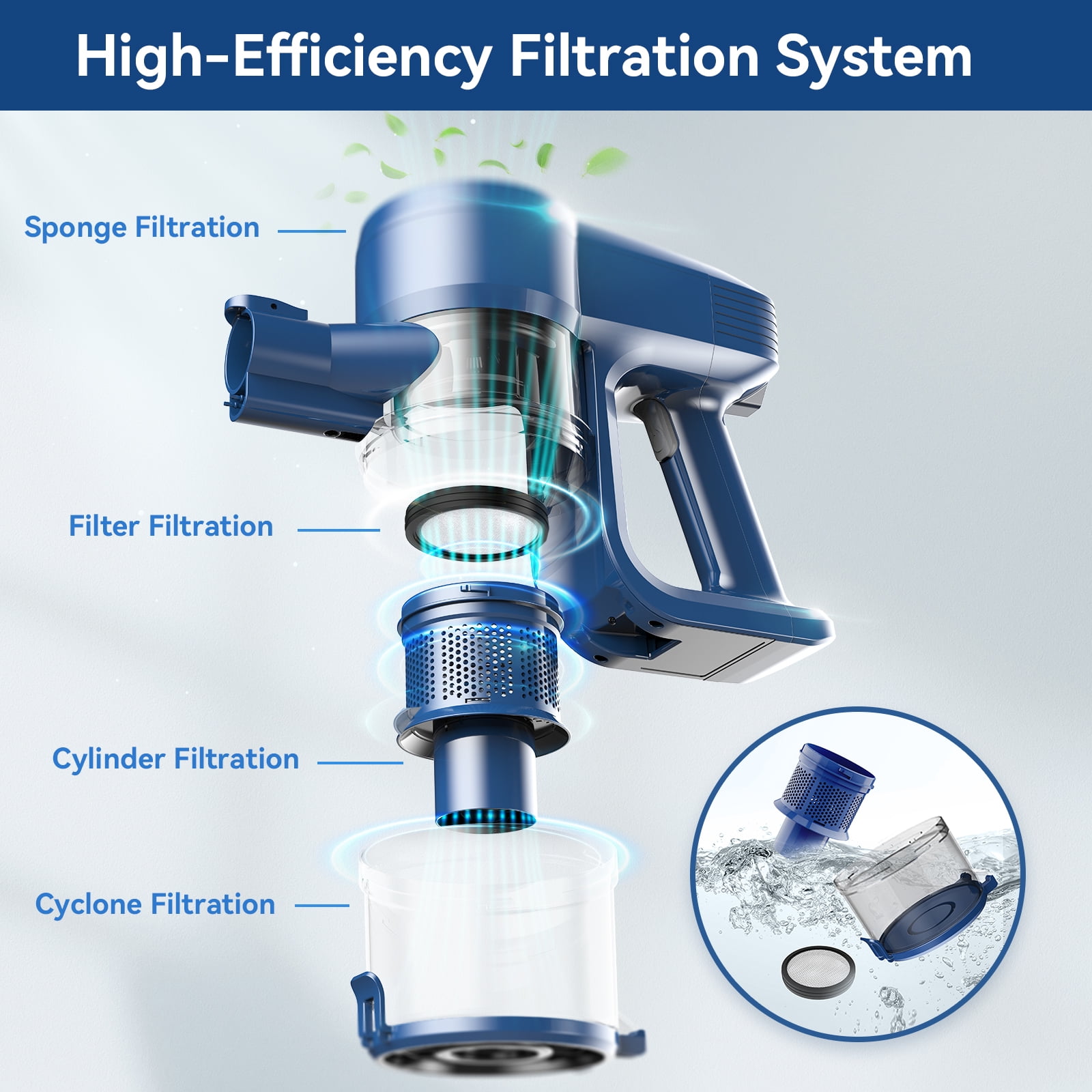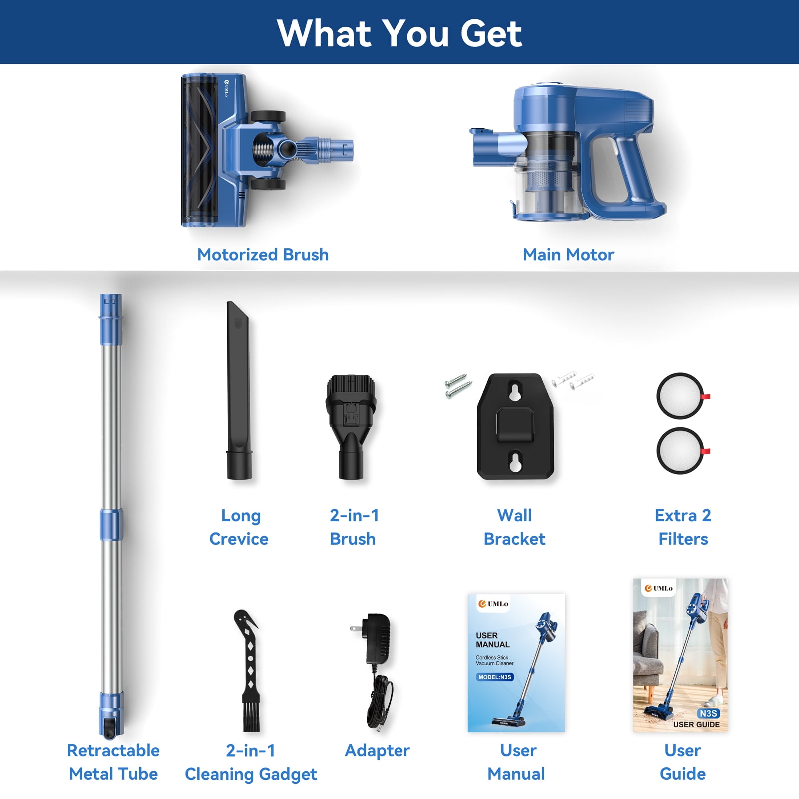 Why choose UMLo Cordless Stick Vacuum Cleaner N3S Blue? UMLo N3S New Cordless Stick Vacuum Cleaner offers an upgraded motor and 2 suction modes, quickly picks up pet hair, debris, dusts from multi surfaces. UMLo Stick Rechargeable Vacuum Cleaner builts in a 6 cell 2200 mAh large capacity battery provides 40 mins running time on standard mode and 20 mins on max mode, allowing you to clean your entire home with a single charge. This Cordless Stick Vacuum Cleaner is equipped with a 4-stage high-efficiency filtration system and a washable HEPA filter that can capture up to 99.99% of microscopic fine particles as small as 0.1 microns. This ensures cleaner air and prevents secondary pollution. The Hardwood Floor Vacuum Cleaner features a V-shaped 2-in-1 brush roller that is ideal for hard floors and short-pile carpets. Flexible 180° swivels sideways and 90° up and down let you clean the house in all directions. Equipped with the V-shaped design roller brush, it can reduce the hair tangles, and the dirt on both sides is concentrated to the middle when the vacuum cleaner is working. It is more effective for dust collection and cleaning. The main motor weighs only 2.2 pounds, less than the weight of a bottle of 1L water. The Vacuum Cleaners for home is extremely lightweight and easy to operate with one hand. It comes with multiple accessories and an extendable tube, making it versatile enough to clean any surface, from floors and carpets to cars, furniture, curtains, and sofas. With the retractable metal tube, you can easily adjust the Vacuum Cleaner from 31.5” to 41.4”. It can easily reach different height choices to quickly clean the stairs, bookshelf, or dust on the ceiling. Note: The package also includes two extra filters as a backup. Regular cleaning and replacement of the filter helps maintain the powerful suction of the vacuum cleaner cordless.