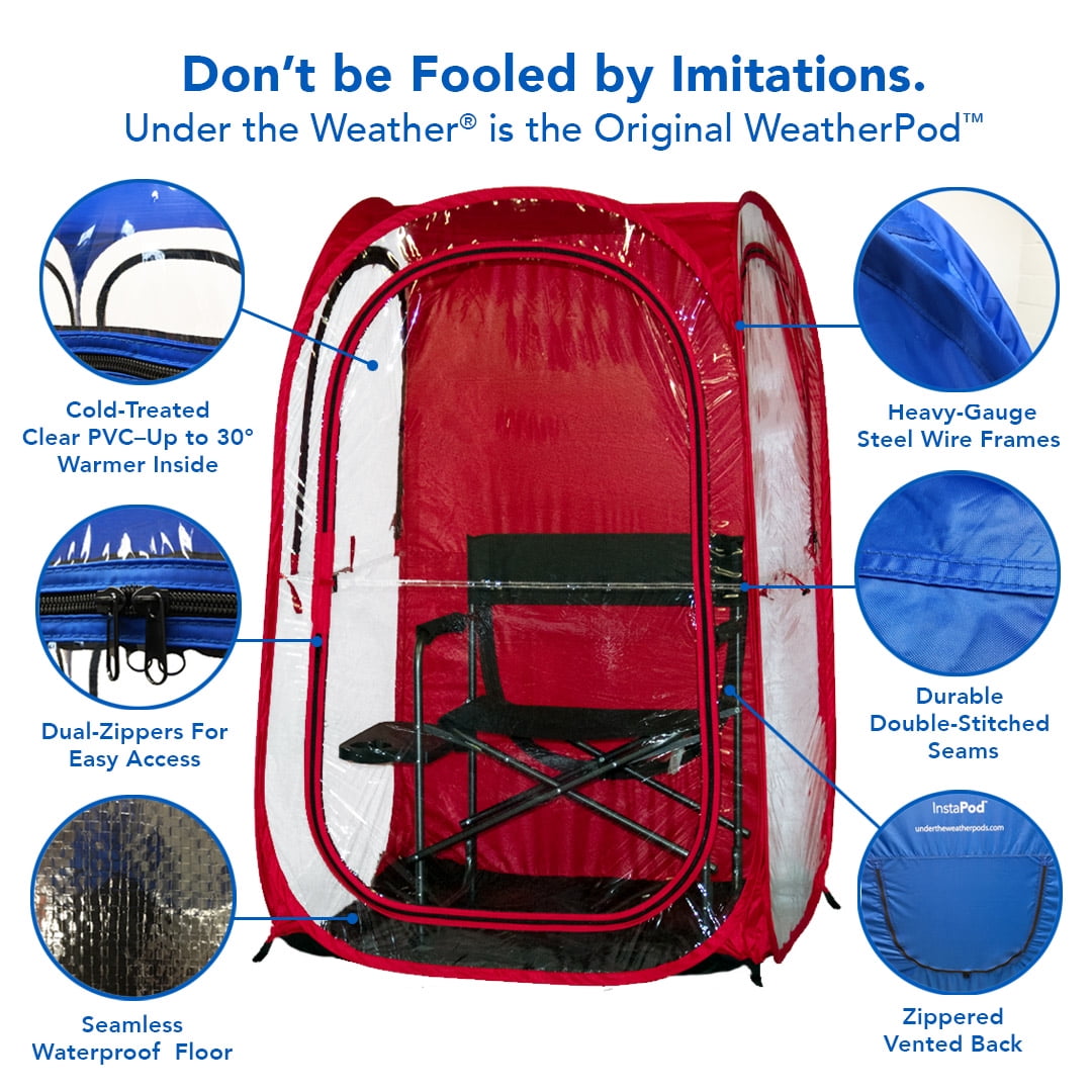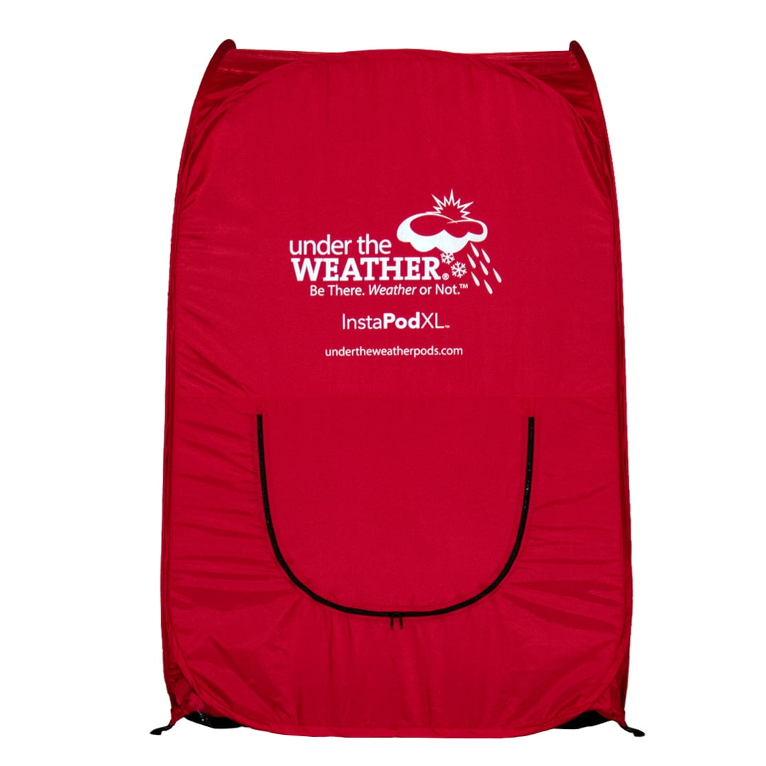 Under the Weather InstaPod Stay Warm & Dry Weather Pod, Red, XL Large 1-person Pod with extra legroom Modular design: Connect two Pods at a time under one roof Sized for big and tall Extra room for coolers or gear Fully enclosed to block cold, wind, and precipitation Up to 35° warmer inside than outside UPF 50 sun protection Fits one adult, folding camp chair comfortably Pops open and folds in seconds! No assembly required Patented weather-resistant design