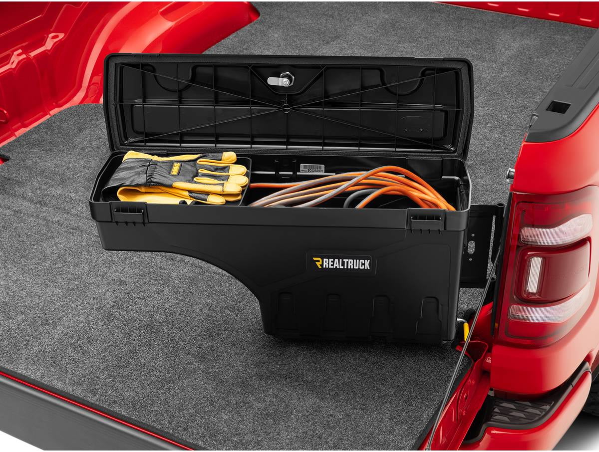 FITMENT | Compatible with 2002 – 2024 Dodge Ram 1500, 2003-20 2500/3500, Passenger Side (Without RamBox) TRUCK BED COVER COMPATIBLE | The UnderCover SwingCase maintains a 3-inch clearance from the truck bed & works with virtually all tonneau covers: soft, hard, folding, and rolling. ULTIMATE ACCESSIBILITY | This toolbox swings out nearly 180° towards you for easy access from the tailgate & swings back into a locking position over the wheel well for maximum bed access. SECURE STORAGE SOLUTION | The SwingCase has a key-lockable lid & can hold up to 75 lbs. of cargo. It features an organizational tray, as well as a moisture seal to help keep contents dry & protected against the elements. QUICK INSTALLATION | This toolbox is simple to install, requiring no special tools. SwingCase is backed by a 1-year guarantee & by UnderCover’s customer support team, making it the ultimate storage solution.