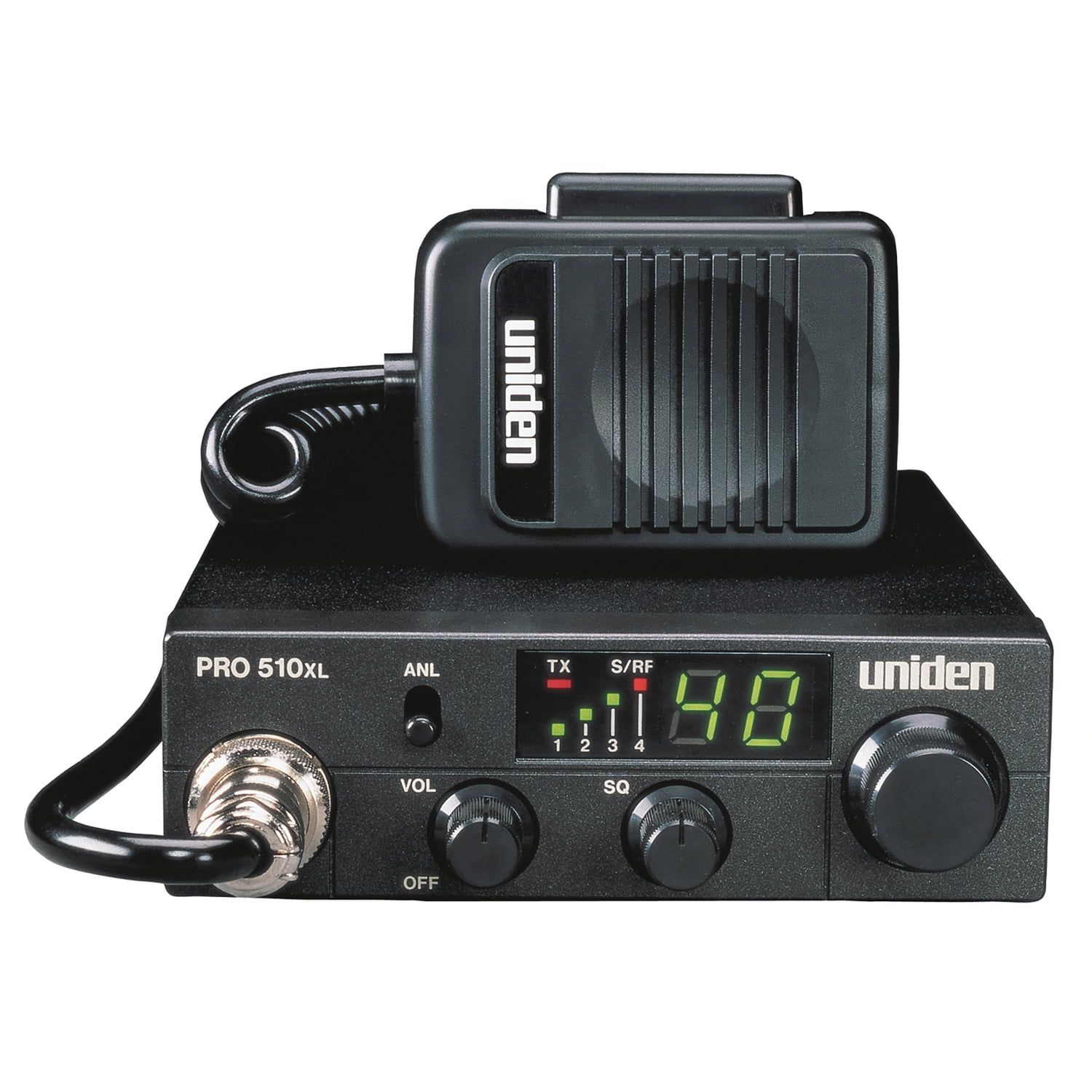 As part of Uniden’s Professional Series, the PRO510XL Bearcat CB radio offers high-performance 40-channel operation in a compact, ultra-mobile radio. This model operates on any of the 40 AM frequencies authorized by the FCC, and its S/RF meter and red-lit LED indicators help you monitor activity at a glance. A built-in noise limiter and ANL switch and squelch control fine-tune performance and eliminate noise, and the front-positioned microphone has an extra-long, coiled cord for convenient use.