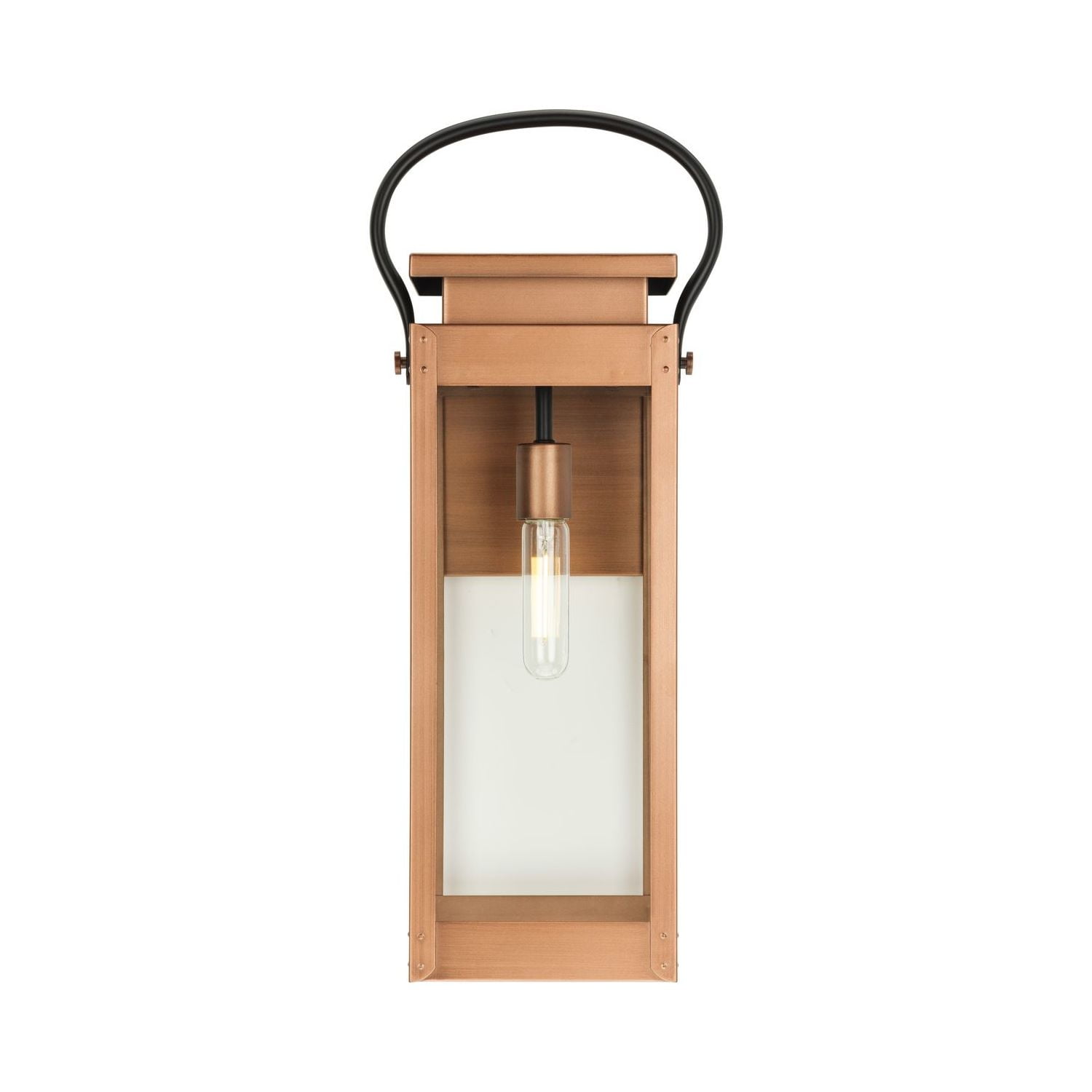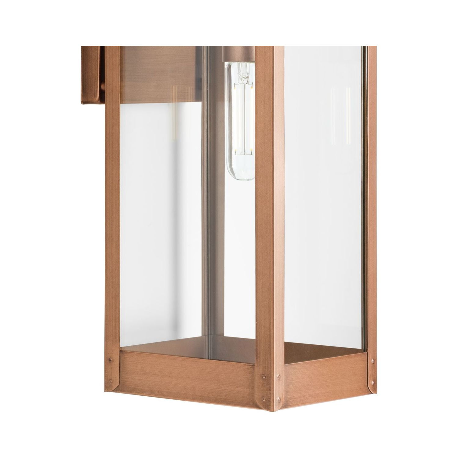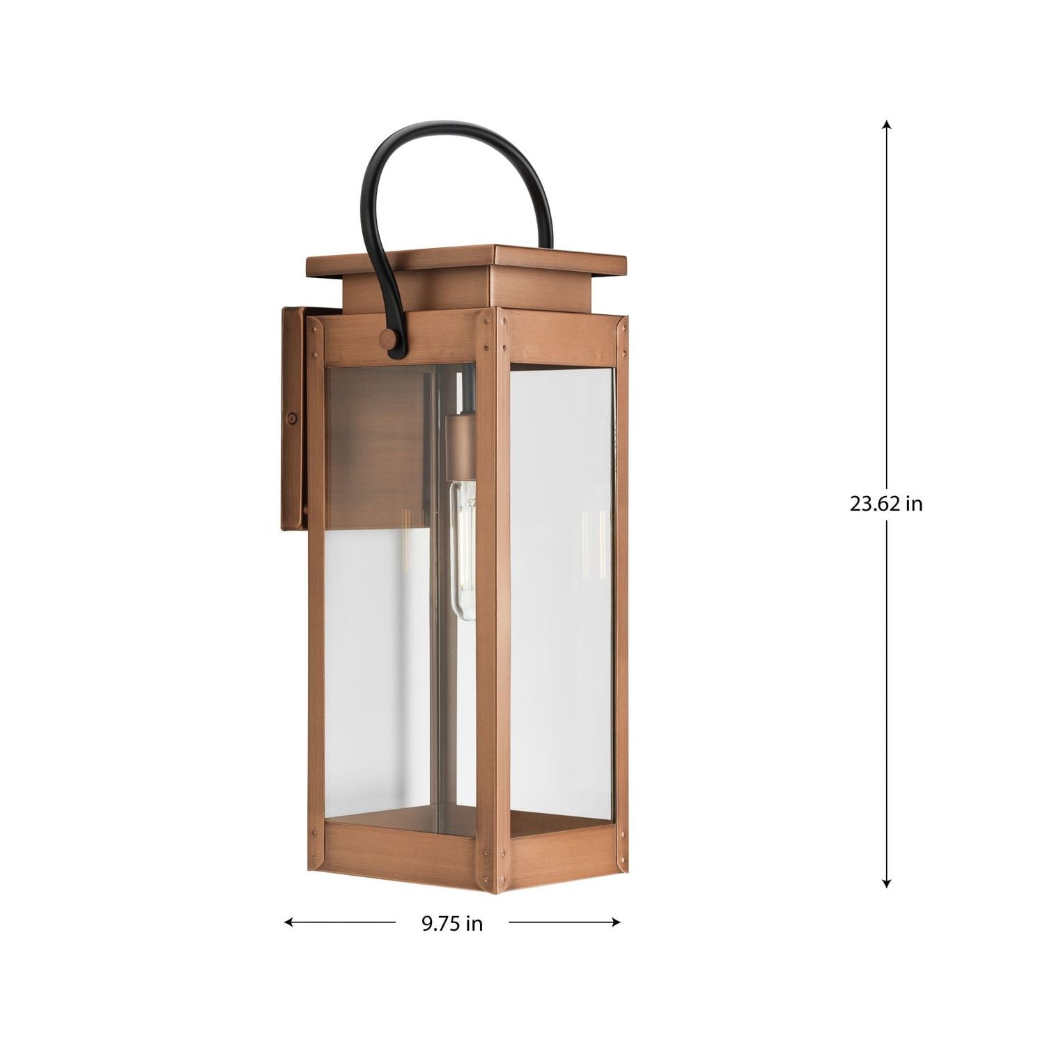 Add curb appeal to your home with the gas lantern inspired Union Square large wall lantern ideal for any porch, patio, deck, entryway, or garage. The fixture’s angular frame and clear glass shade accent vintage electric, urban industrial and farmhouse exteriors The light is coated in an antique copper finish, highlighting the flat clear glass panels and a black strap detail Open bottom design allows easy access to replace lamp. Constructed from steel to ensure a long product lifespan Measures 9.75 in. width by 23.62 in. height, extends 8 in. Use (1) 100-Watt maximum medium base bulb, or LED equivalent, that is sold separately. Certifications: cCSAus Wet Location listed, fixture can be used in outdoor settings or covered outdoor rooms where water may be present Warranty: Our 1-Year Limited Warranty guarantees your complete satisfaction with your purchase and includes professional after-sales customer service support Includes installation instructions and mounting hardware for a quick, easy installation