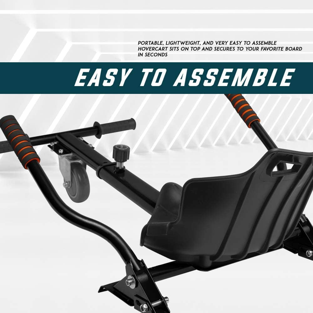 Universal Fitting – The hovercart works with most standard sized Hoverboards. You can adjust the length to best fit for your riding position. Flexible Straps – With extra straps come in the package, you can quickly and easily attached the Hoverboard seat attachment to any size Hoverboard in a few minutes. Adjustable Frame Length – Adjustable the frame length to extend the foot pedals pedals from the Hoverboard to best fit your riding position. Ergonomic seating contours to your legs and back for ultimate comfort. Soft Grip Handle – This go carts for kids and adult comes with foam padded comfortable grip handles which provide a comfortable handling experience while you are driving the hover kart. Easy to Assemble – Turning your Hoverboard into a go kart. Assemble all the seat and parts you will be enjoying the Hoverboard go-kart in no time.