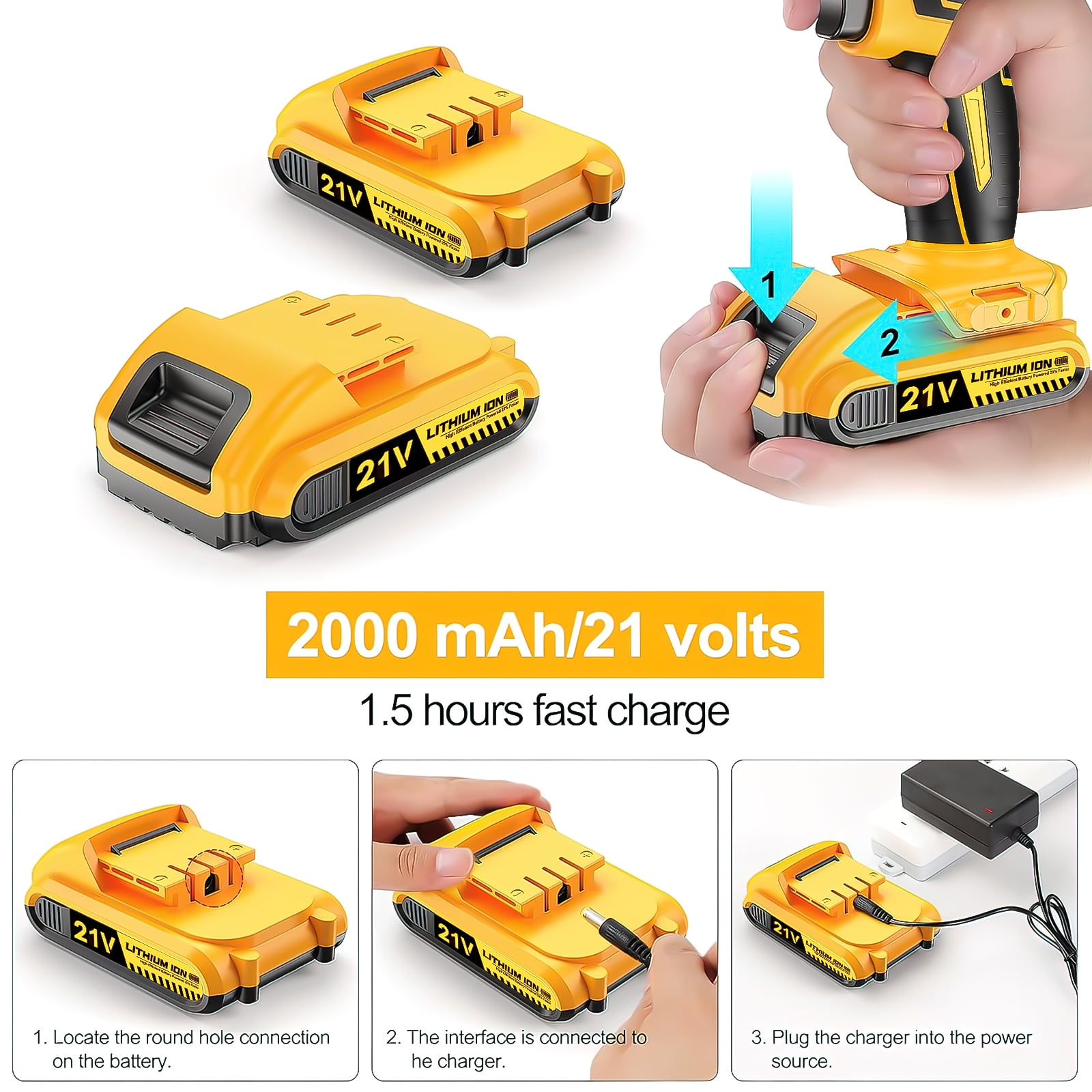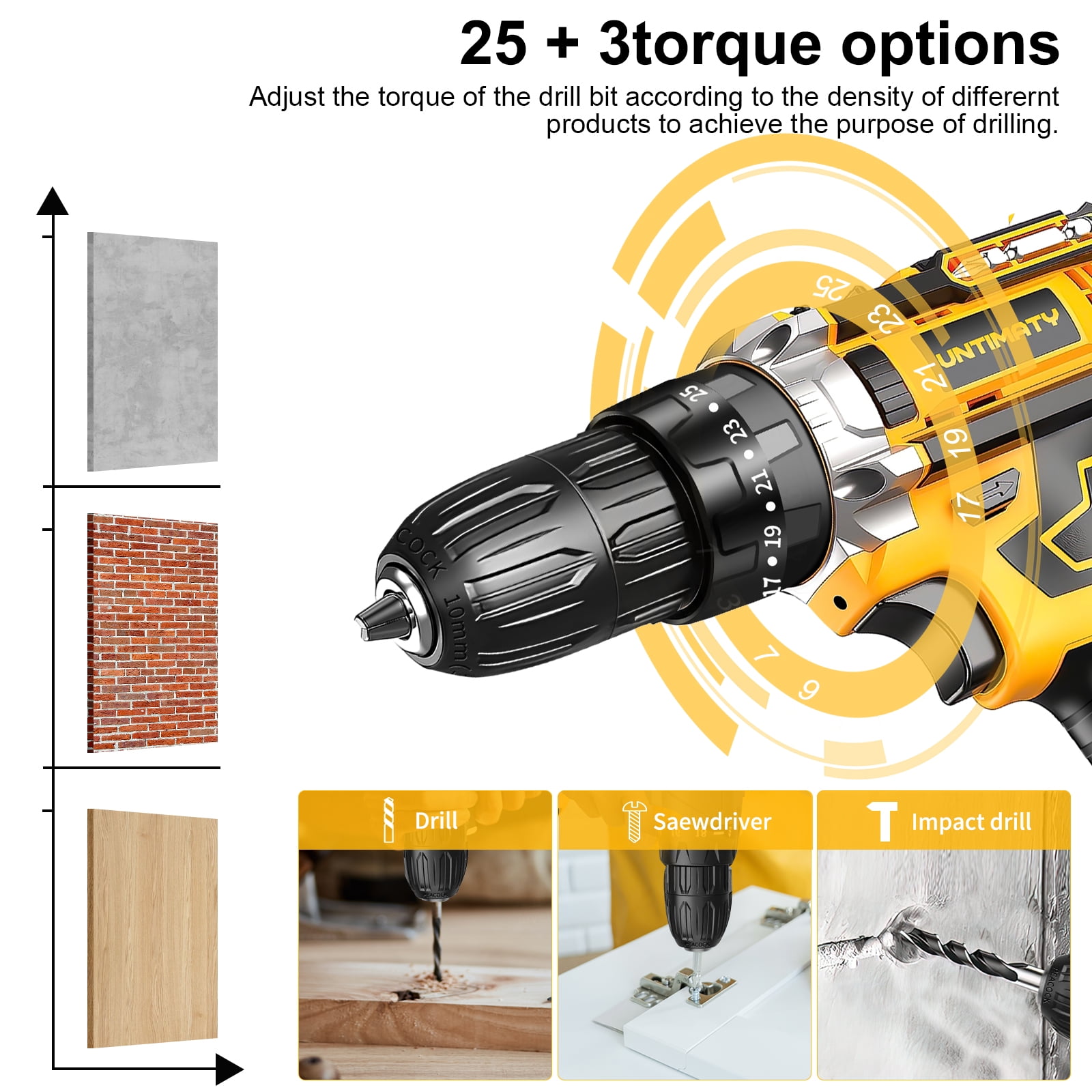 Boost your DIY game with the UNTIMATY 21V Cordless Drill, designed for ease and efficiency. Quick to charge, with a durable battery, it’s perfect for all your drilling needs. A true workhorse, ready to take on any home project with power and precision. Get yours and start transforming your space like a pro! 【High Efficiency Battery】 Equipped with 2000mAh lithium-ion batteries and a power level display, the UNTIMATY 21V drill ensures continuous work without unexpected interruptions, boosted by a rapid 1.5 hour charge time 【Powerful & Multi-Setting Clutch】 The 25+3 position clutch, coupled with dual speed options (0-450RPM & 0-1500RPM), offers precise screw driving and drilling through multiple materials with a robust 45Nm maximum torque 【Ergonomic & Compact Design】 Weighing just 1.2KG with a performance motor, this drill allows easy one-handed operation. Its ergonomic design with a soft rubberized handle reduces fatigue during extended use. A flexible shaft and LED light improve efficiency in hard to reach areas 【Comprehensive Accessories & Portable Set Up】 This drill set includes 25pcs high quality drill/driver bits, catering to various home DIY, furniture assembly, and gardening tasks, all in a conveniently portable package 【Outstanding Performance & Safety Focused】 The UNTIMATY cordless drill offers consistent, durable power with easy battery swapping and charging. A built-in LED light ensures safe operation in dark spaces. Please ensure the drill is fully charged before first use 【Cordless Drill Accessories】 Cordless Drill x1 21V 2000mAh Lithium-ion Battery x1 Screwdriver Bitsx8 Twist Drill Bitsx6 Socket Wrenchx10 Flexible Shaft x1 Clipx1 Fast Charger x1 User Manual x1 toolbox x1