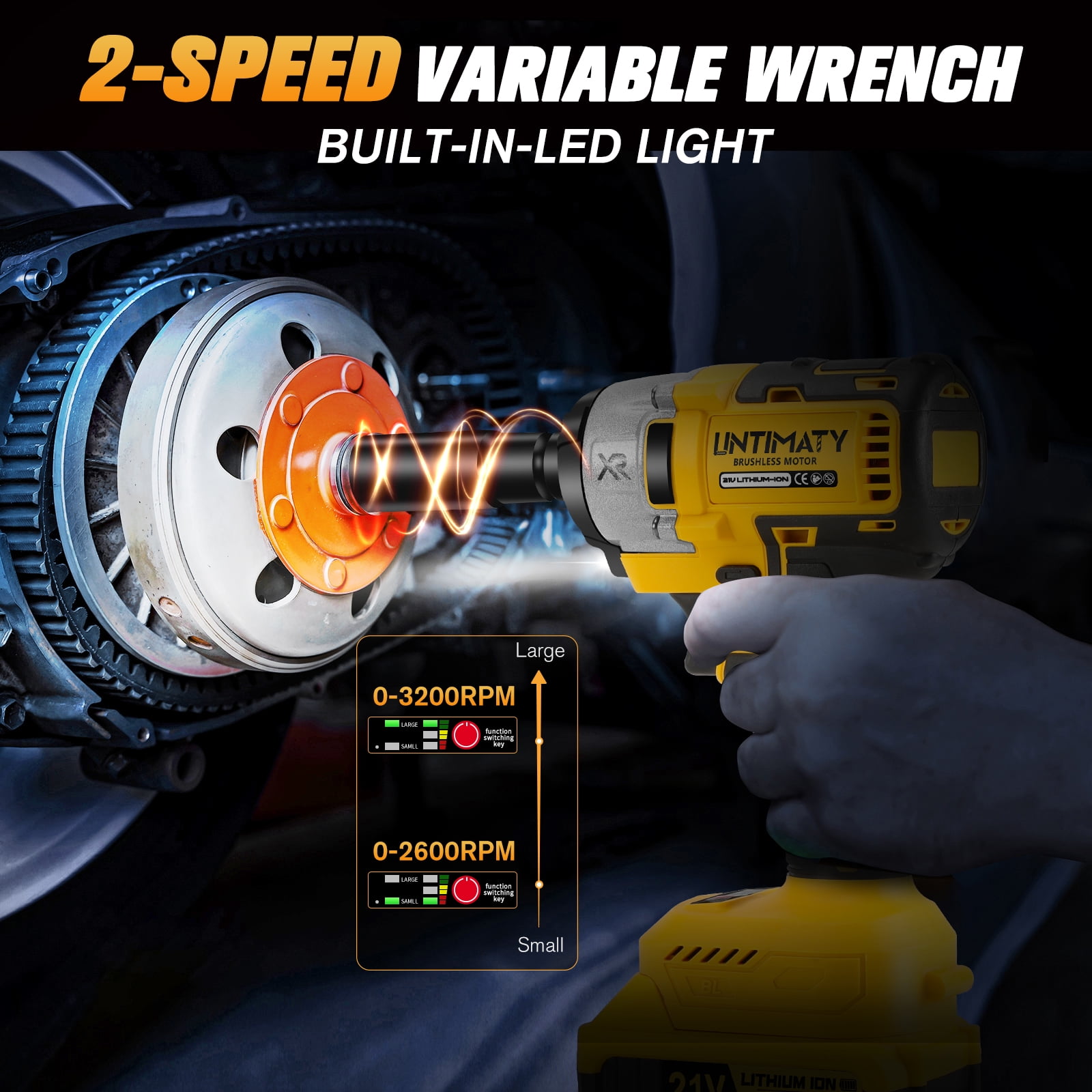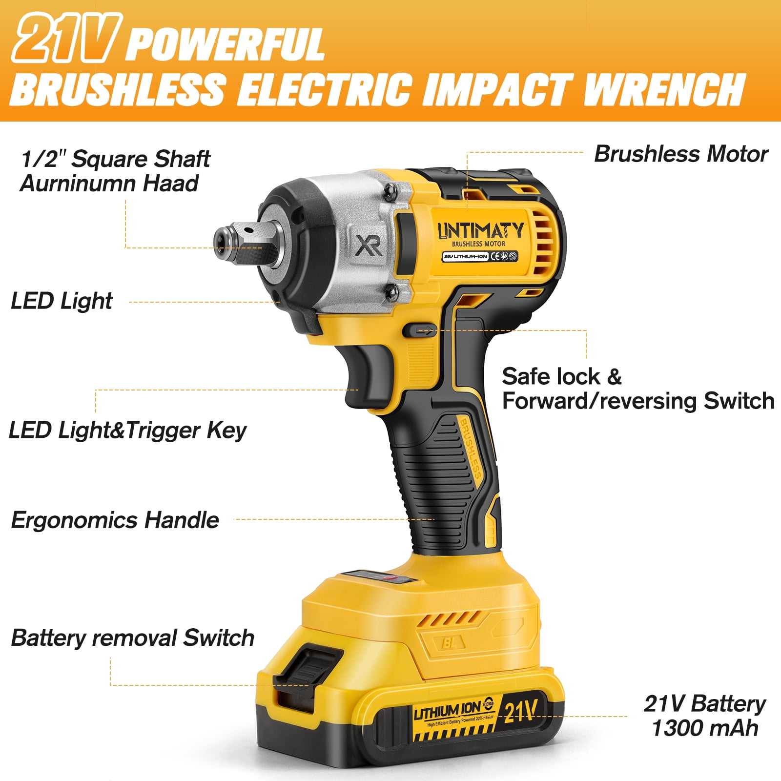 【High Torque & Brushless Motor】UNTIMATY uses a brushless motor for this 1/2-inch cordless wrench.The cordless impact wrench delivers a maximum torque of 280 ft-lbs (380 N.m), this electric impact wrenches make it easy to loosen or tighten all types of bolts or nuts, including removing automotive tires, assembling furniture, installing scaffolding, garage use, DIY projects, etc. 【Variable Speed Control & Automatic Reverse Stop】This electric impact wrench 1/2 features two-speed settings (0-2600RPM and 0-3200RPM), allowing for precise control whether you’re tightening screws or quickly removing bolts, regardless of task difficulty. When in reverse mode, the built-in brake function automatically stops the wrench to prevent loosened bolts from dropping, protecting your equipment and threads. This user-friendly design helps you remain composed even in more complex work situations. 【LED Lighting & Ergonomic Comfort Grip】Our cordless impact driver features a built-in LED lights that have been carefully designed to cast light on the area you need to work on, eliminating the need for additional handheld lighting. This makes the 1/2 impact wrench perfect for a variety of dimly lit spaces. The ergonomic comfort grip of this cordless wrench truly achieves the perfect combination of comfort and practicality. 【2x 3000 mAh Batteries】The electric wrench is equipped with two 3000 mAh batteries, which bring unprecedented powerful power and long-lasting endurance to your work. The two batteries can be used alternately, so you don’t have to worry about interrupting your work due to insufficient power, and you can continue to work efficiently. At the same time, the battery charges quickly, which can better meet your usage needs. 【Lightweight Design & Comfortable Ergonomic Handle】Weighing only 3.9 lbs,this impact gun features a compact design,making it easy to maneuver in tight spaces.The ergonomic handle design minimizes fatigue during prolonged use,easily adapting to various situations.This tool is also friendly for female users and older individuals.