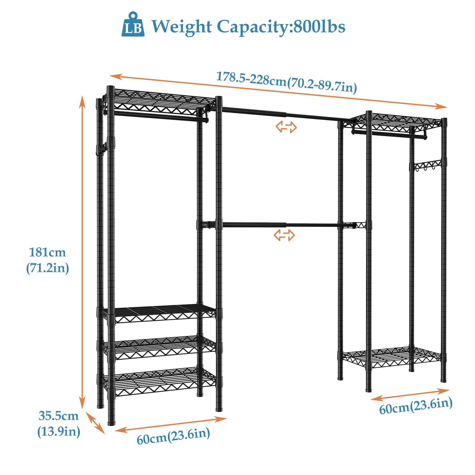 Brand: Untyo Colour: Black MaterialL: Metal Product Dimensions: 35.5D x 228W x 181H Centimetres Installation type: Free Standing Special feature: With Adjustable Shelves, Expandable Style: Heavy Duty Frame material: Metal,Steel Assembly required: Yes 【Expandable Closet Wardrobe】The whole length of the closet rack can extend from 70.2 to 89.7 inches. 【Adjustable & Detachable】The slip-sleeve locking system allows shelves to be adjusted in 1-inch increments so you can conveniently adjust the shelf height according to the objects that you need to store. Besides, it is available for you to remove the shelf if you do not need it. 【Sturdy & Durable】 The clothing rack Constructed from Heavy-duty black-coated steel poles and sturdy metal wire; and all metal parts are powder-coated which protects sturdy clothes rack from water and rust to makes it easy to clean and ensure years of use. 【Large capacity &Multi-Functional】The first consideration in the design of this garment rack is practicality. There are three main parts of this armoire storage rack, can be used to hang clothes, place bags, place pants, towels, suitcases and other needs. Meet your storage needs in life. 【Assemble】 The simple structured clothes rack makes the installation easy and quick. Large-size garment rack supports a flexible assembly according to your user habits. No tools need to assemble the garment rack. Read the assembly guideline carefully before you start putting it together clothes racks and shelving, clothes racks heavy duty,
