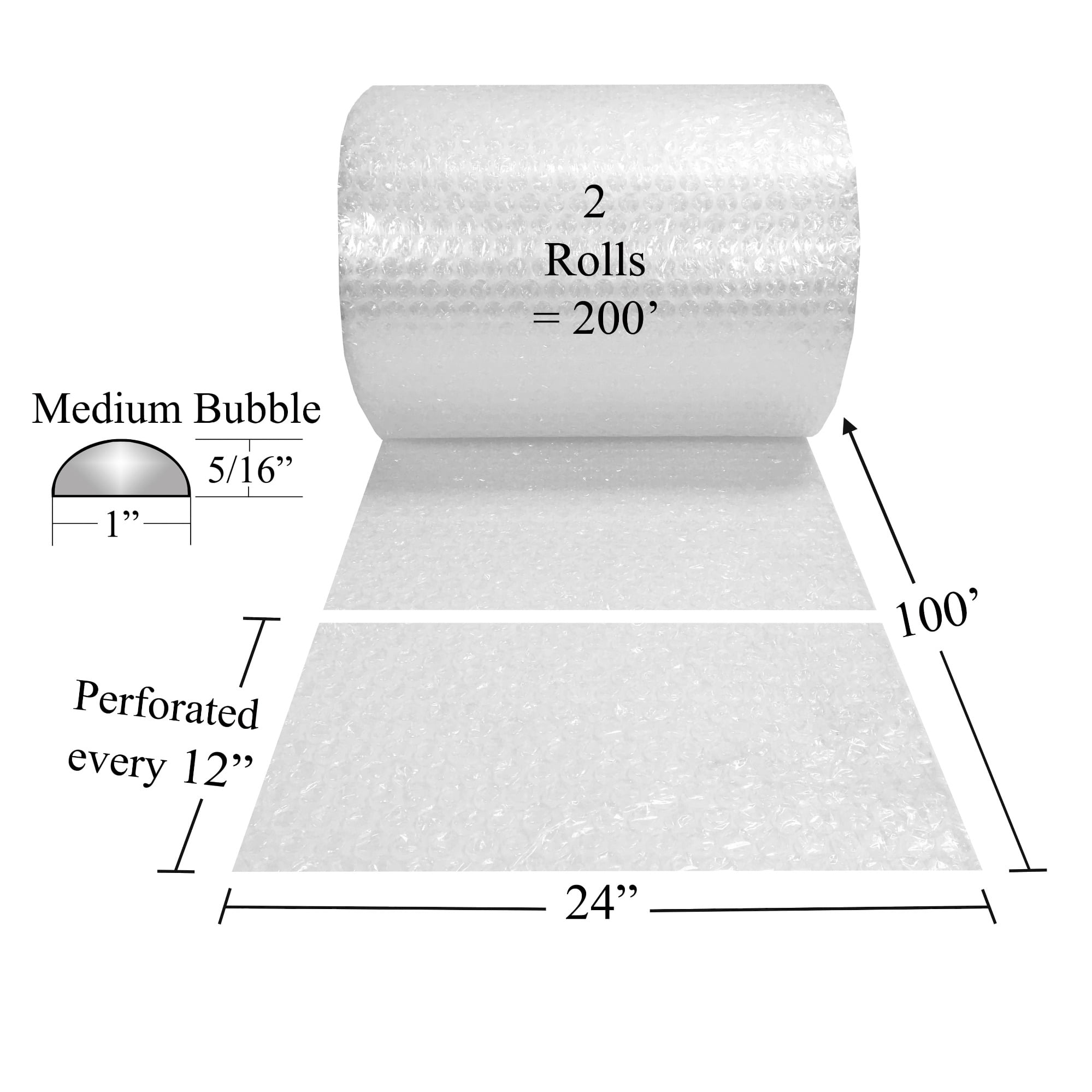 Medium Bubble 200′ x 24″ Wide 5/16″ Roll (2 Rolls 100-Feet each) Grade A defense for safeguarding all your commodities in transit User-friendly dependable padding with more air and bigger bubbles for security needs A bubbled side made to anchor and hold objects more thoroughly A flat side made to adhear to tape effortlessly that can be wriiten upon