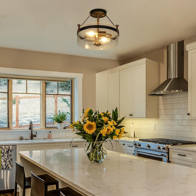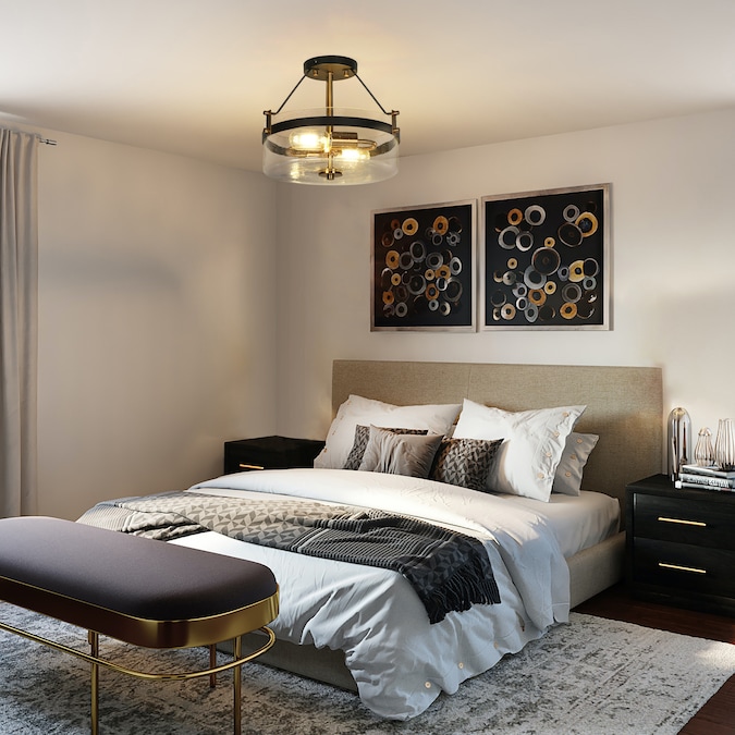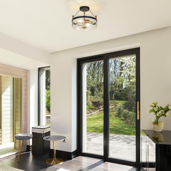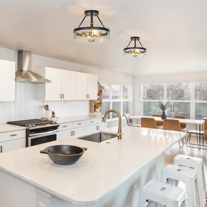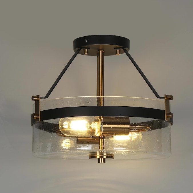 Incorporate a classic modern feel into your living space with this uniquely 2-Light 12.5-in Matte Black and Plating Gold with Drum Glass Shape Semi-flush Mount Light by Uofin Lighting, safely rated for dry locations. This kitchen island ceiling light has an outer frame of round fitted in a drum shape with a clear seeded glass shade, which showcases an elegant transitional drum shape without compromising chic modern charm. The seeded glass shade of this black and gold semi-flush mount light exudes a soft appearance against the inner gold light base. A clear glass shade and matte gold finish complete the fresh aesthetic of this transitional clothes room semi-flush mount light. This bedroom ceiling lighting combines mid-century design and modern sense. A sturdy metal frame provides stability to this foyer ceiling light, making it ideal for refreshing your foyer, living room, dining room, or any other interior location you prefer.