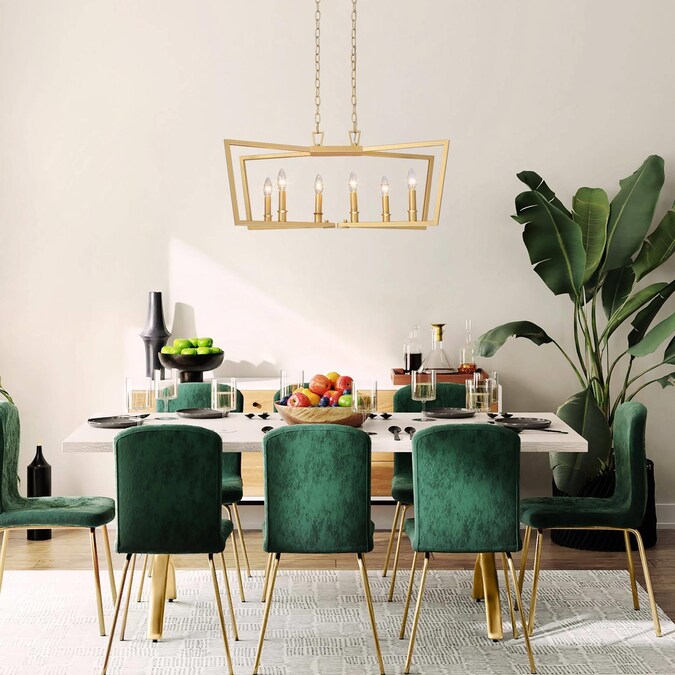 The 6-Light modern farmhouse linear chandelier by Uolfin Lighting has a unique look with a stylish matte gold iron frame. This simple design creates a unique display. Our transitional chandelier(s) is built in such a way that you can open the arms into a square formation, or close them into a rectangular formation. The frame is plated in matte gold with square tubing. These art deco chandelier pendant lights help to bridge the gap between modern and traditional elements and will bring the modern/contemporary, industrial, minimalist ambiance to your kitchen area, living room, dining room, and staircase. The intersecting pentagons make for a sleek physique to hang over your dining room table. In an open cage setup, the inner bulbs shine brightly through to paint your room with ample light.