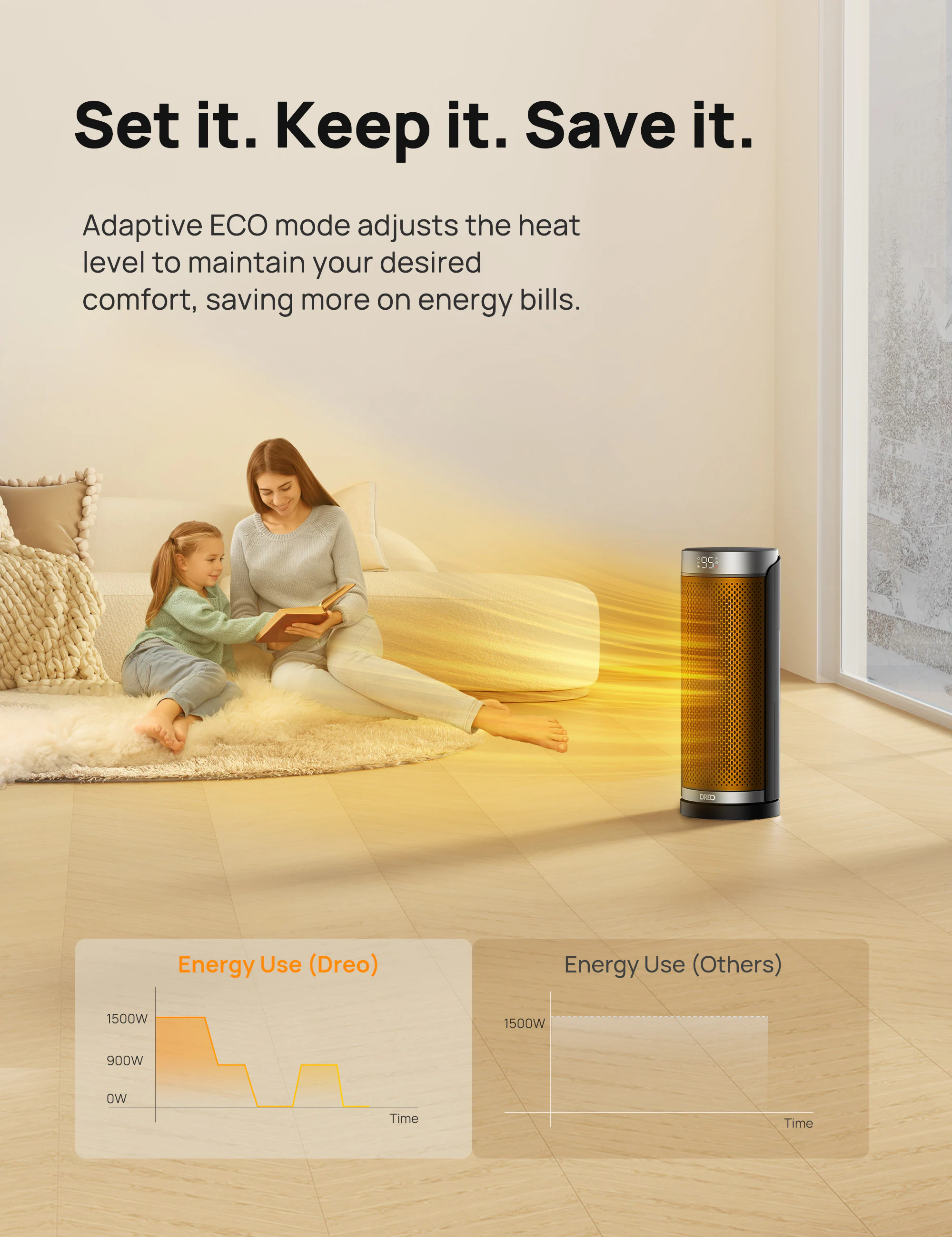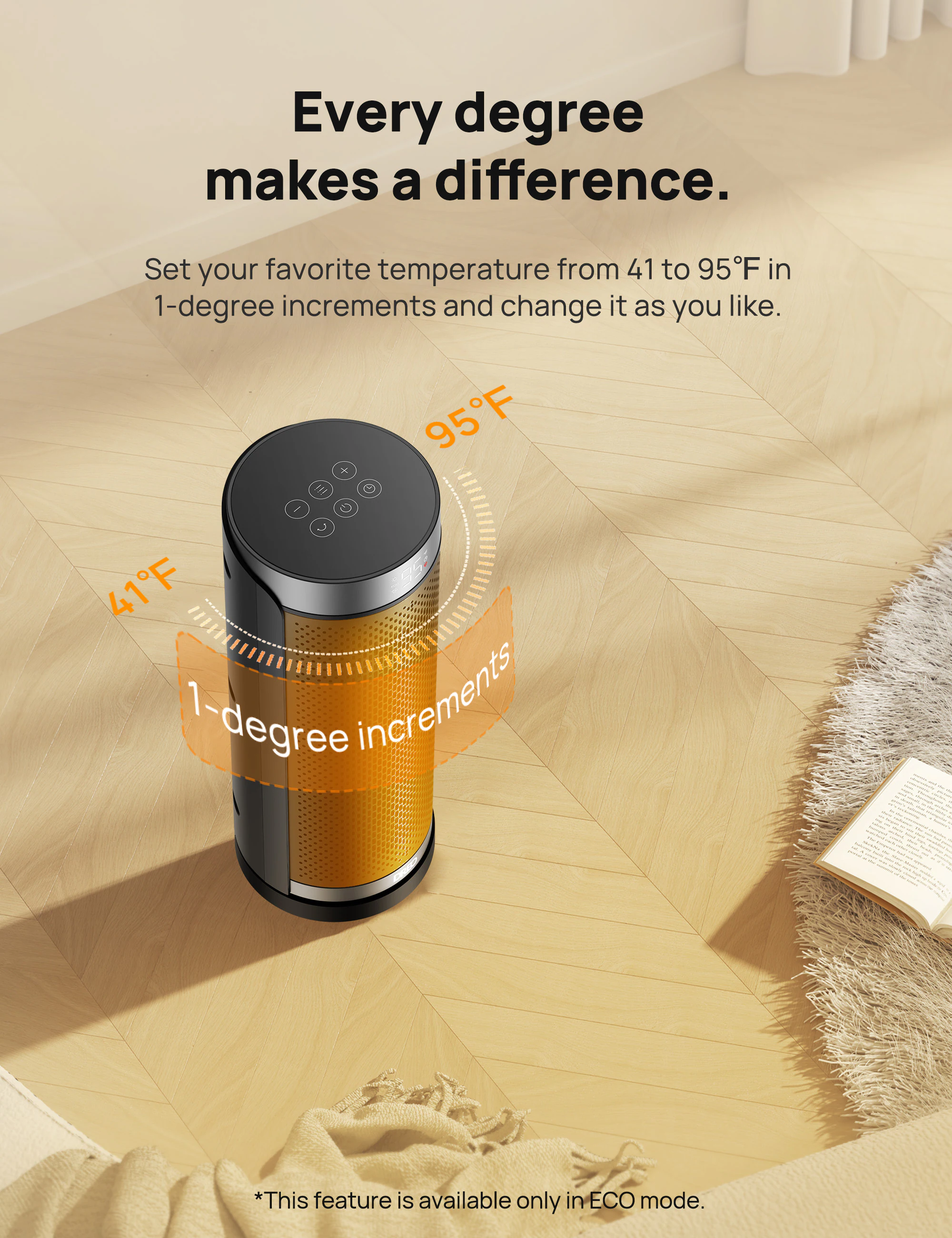 The ETL-certified Dreo space heater is designed with safety in mind, featuring tip-over and overheat protection. It heats up quickly with its powerful PTC ceramic heating and operates quietly at 40dB, making it suitable for bedrooms and offices. The heater also features uniform heating with its 70° wide-angle oscillation, energy efficiency with its smart ECO mode, and user-friendly design with its touchscreen and remote control.