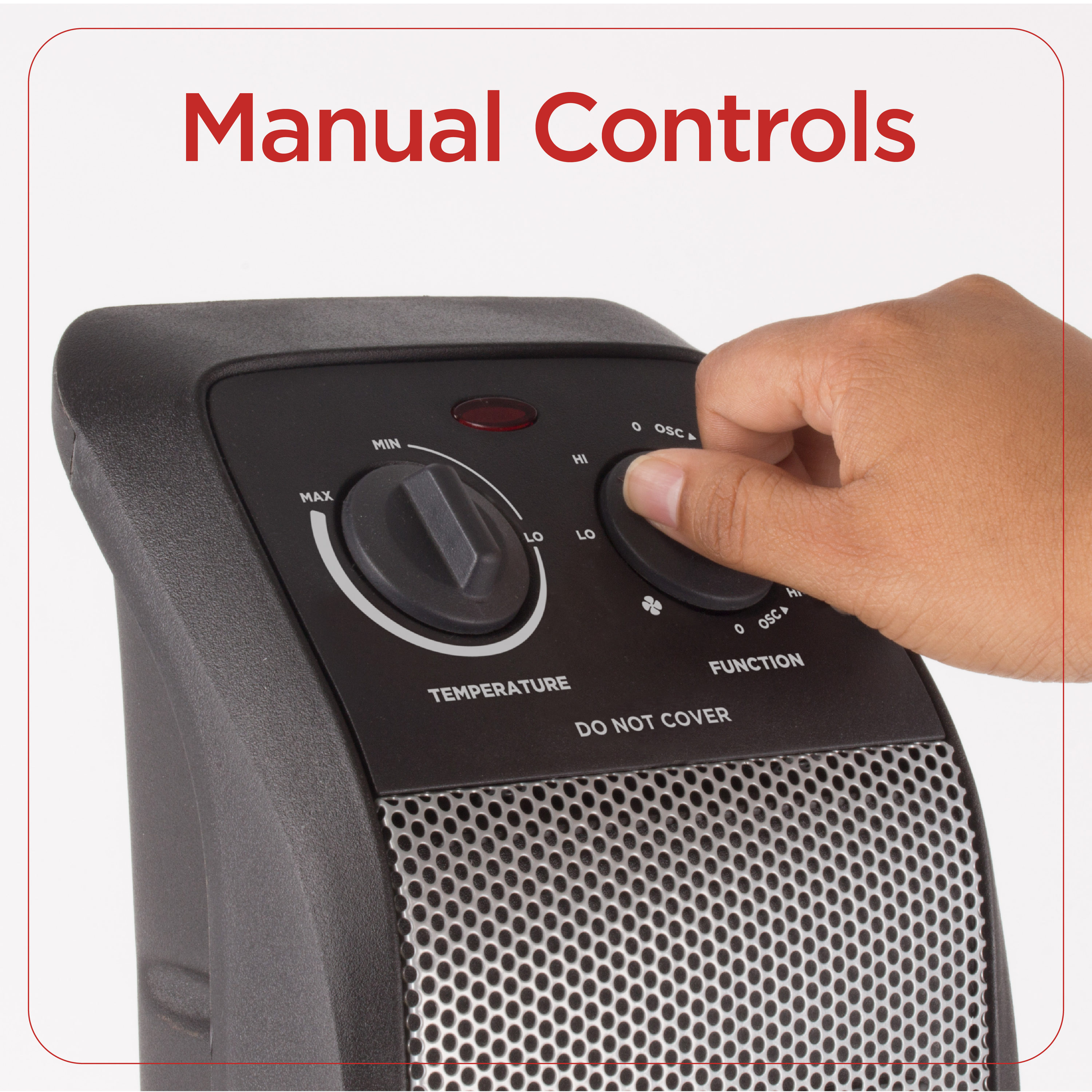 The BLACK+DECKER 1,500 Watt ceramic tower heater comes with manual controls and 4 convenient settings. The tower heater has adjustable thermostat controls that shut it off at a set temperature. This ceramic heater has an oscillating function that allows maximum air circulation throughout a room.