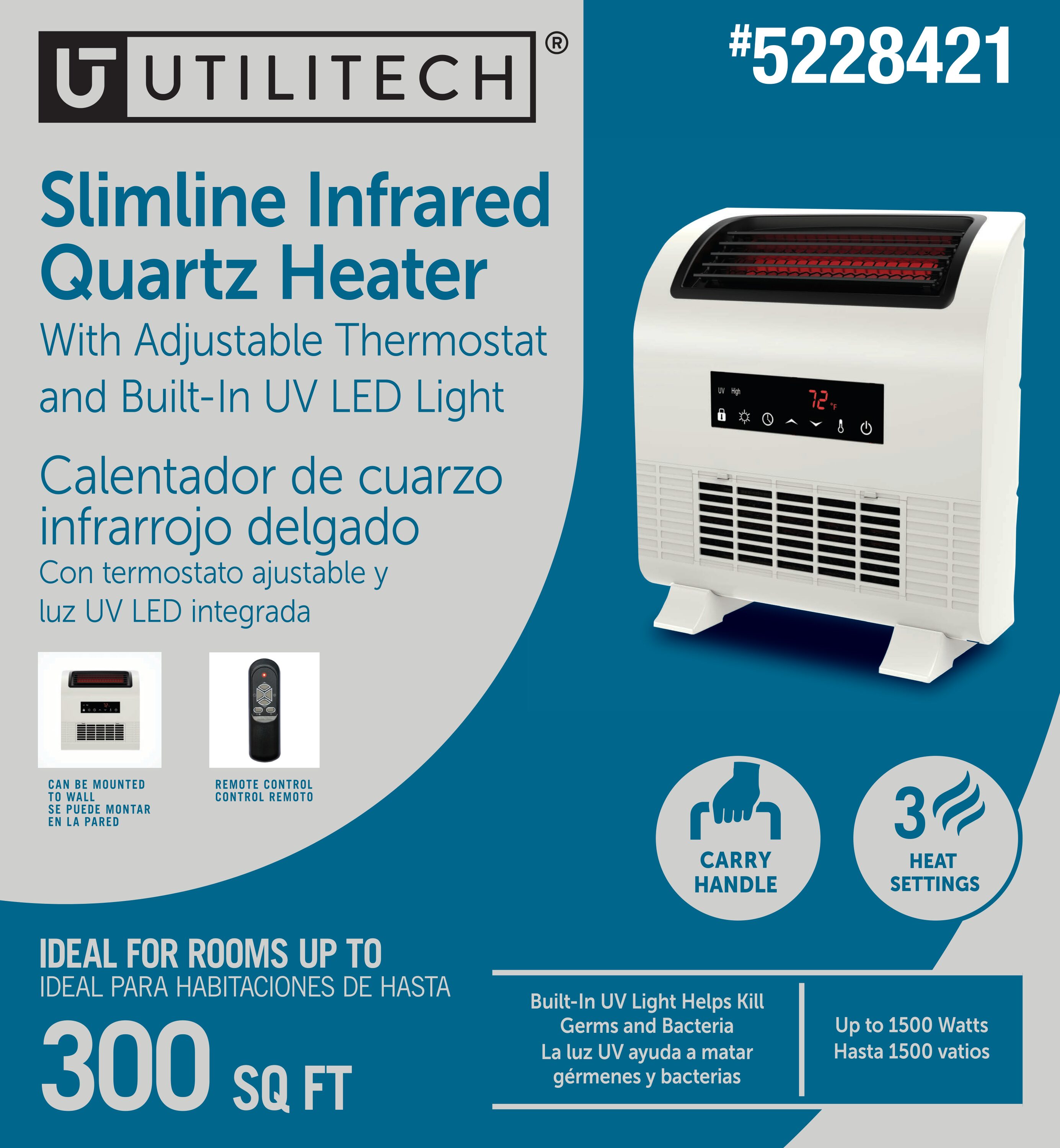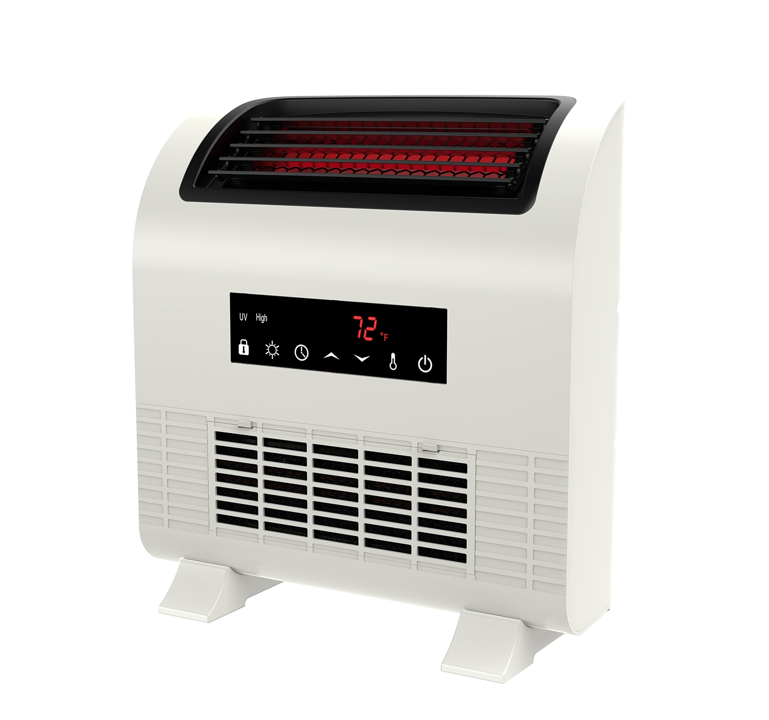 Modern space saving design and innovative front air intake with UV light allows this heater to be placed directly against the wall without constricted air flow or overheating. UV LED light helps reduce germs and bacteria brought into the heater and returns clean air into the room. The smart boost technology provides instant heat output while the infrared tubes warm up for maximum heating output.