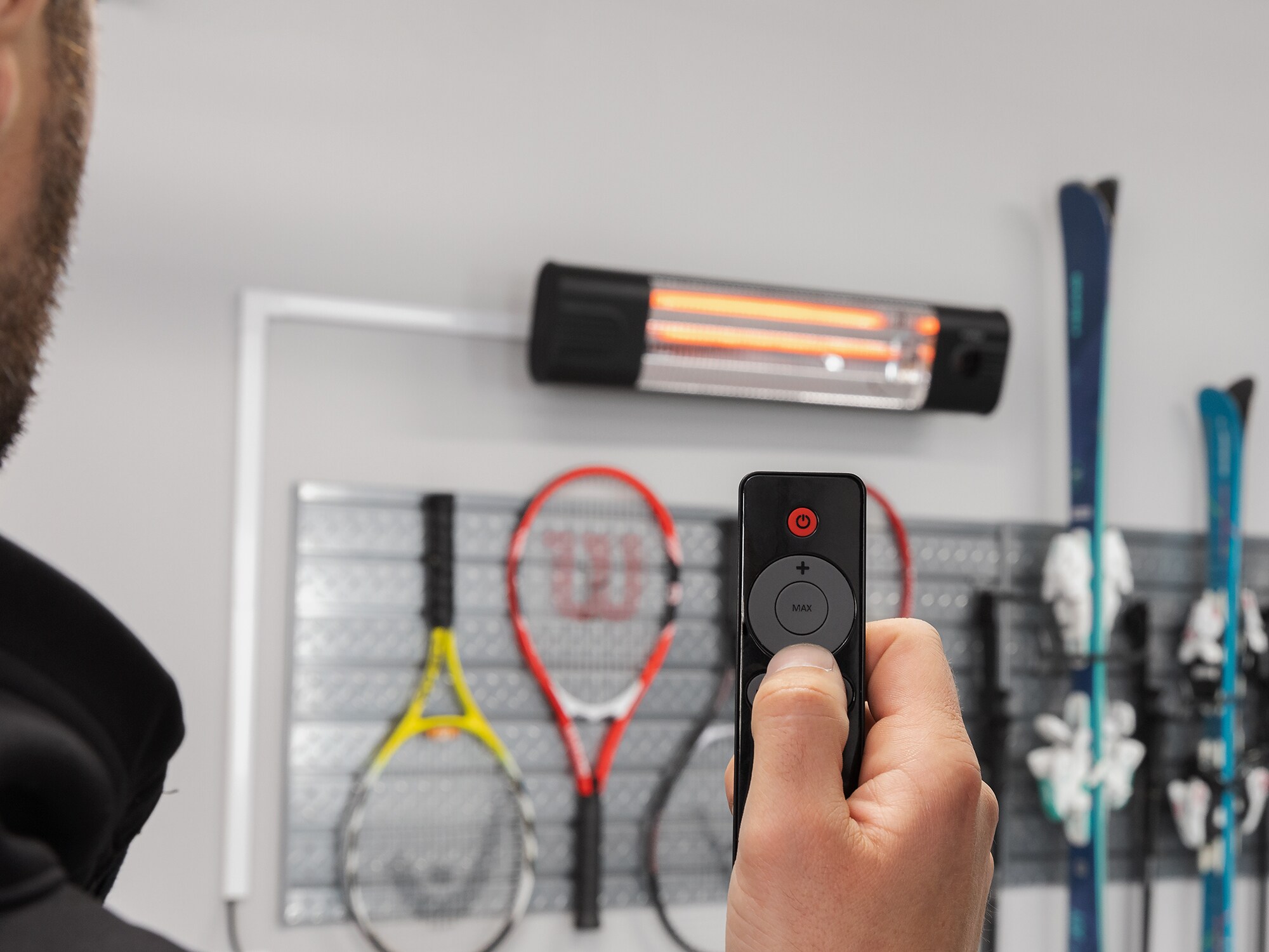 Bring warmth into your workspace quickly and efficiently with the NewAge Products 1500w Infrared Heater. The long-life carbon filament delivers comfortable radiant heat at 5,000 BTUs per hour. Unlike traditional convection designs, the Infrared Heater is silent, and doesn’t reduce the humidity or oxygen in the workspace. The heater plugs into any standard 120V outlet, and the low-profile horizontal wall-mount design doesn’t take up space on your work surface or floor, making it ideal for workshops, garages, basements, sunrooms, and sheds. The remote control conveniently allows you to choose from three quick-select power levels and 30 precision power levels and features a 9-hour timer. A single remote can control multiple heaters. Easily install the heater horizontally at a minimum of 6 ft. from the floor with included adjustable angle wall-mounting bracket that let you angle the heat where you need it most for effective zone warming. The Infrared Heater Slatwall Backet (sold separately) can be used to mount the heater to NewAge Products Steel or PVC Slatwall. Enjoy a safer workspace knowing that your heater is IP34 certified with protection against water spray from any direction, and has a built-in shutoff feature to prevent overheating. Don’t let the cold keep you out of your workspace. Stay comfortable and productive with the NewAge Products 1500w Infrared Heater. Not for use in unattended areas. Cannot be installed in a vertical orientation. Keep children away from heater at all times.