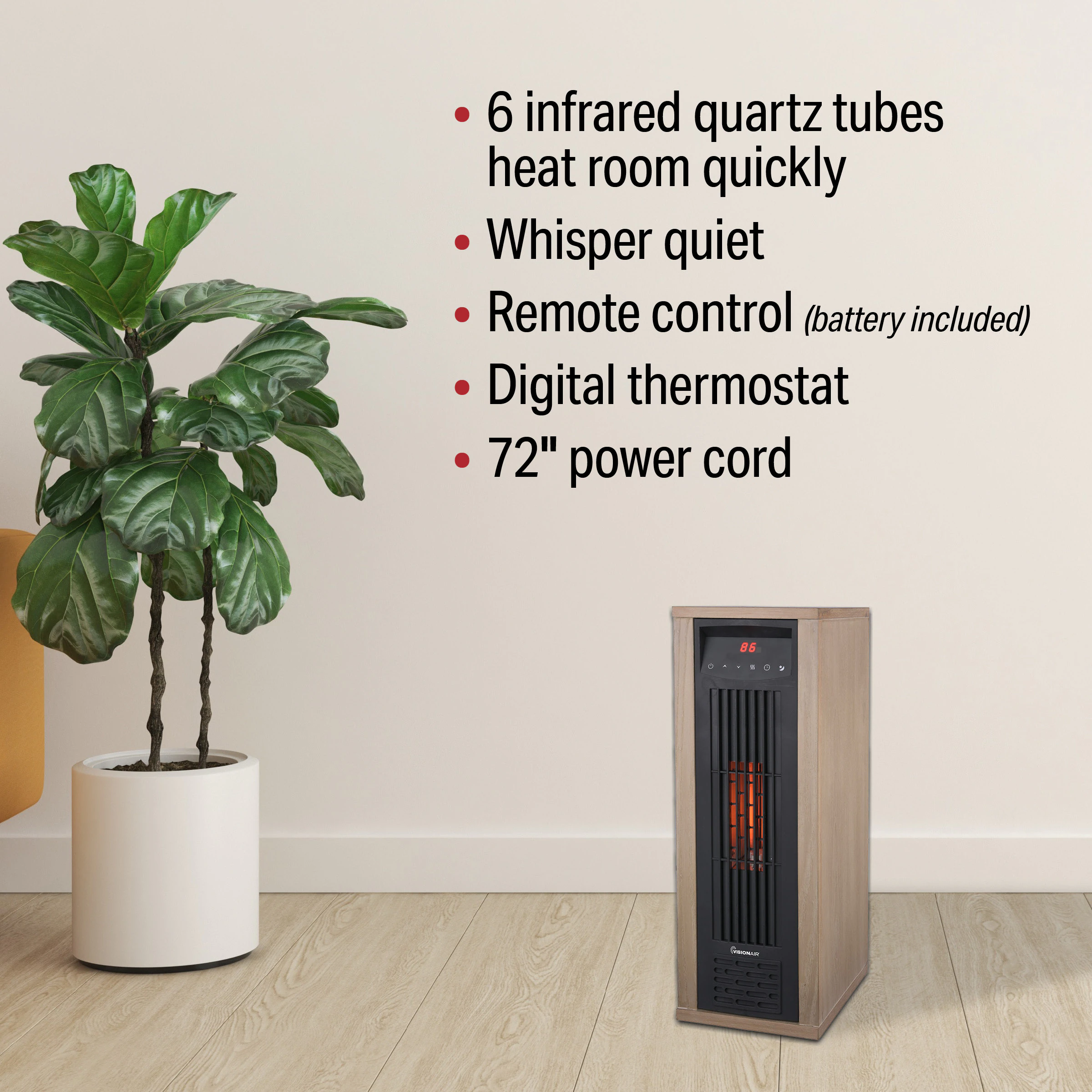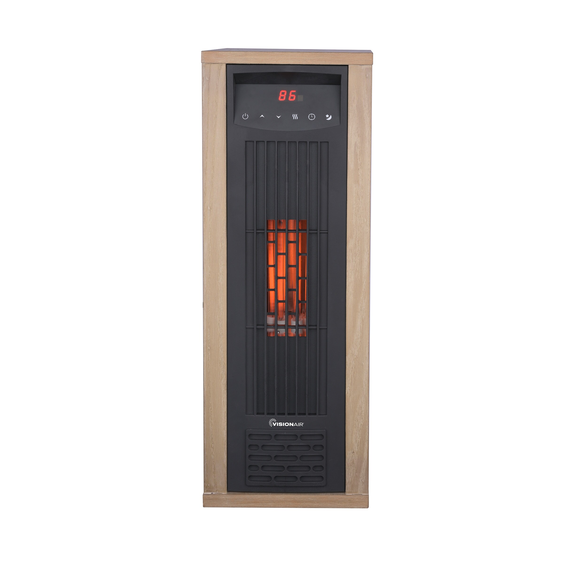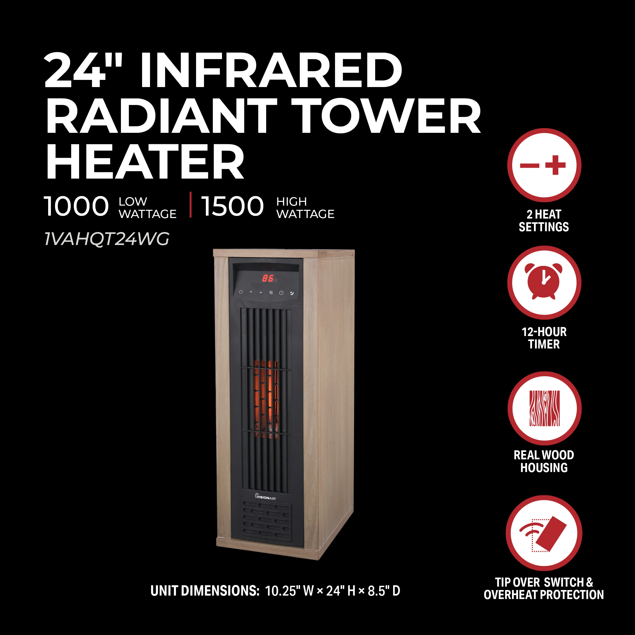 Transform your space with the VisionAir 24″ 1500/1000W Digital 6 Tube Infrared Tower Heater with Remote – the perfect way to keep your medium to large spaces warm quickly, and quietly. This heater with a real wood exterior casing is beautifully designed to provide comfortable, efficient heat for any room. It is equipped with digital controls, 6 infrared quartz tubes, adjustable thermostat, 12-hour timer, high/low heat settings, tip over & overheat protection, and a convenient remote control (battery included). Comfort and beauty at your fingertips!