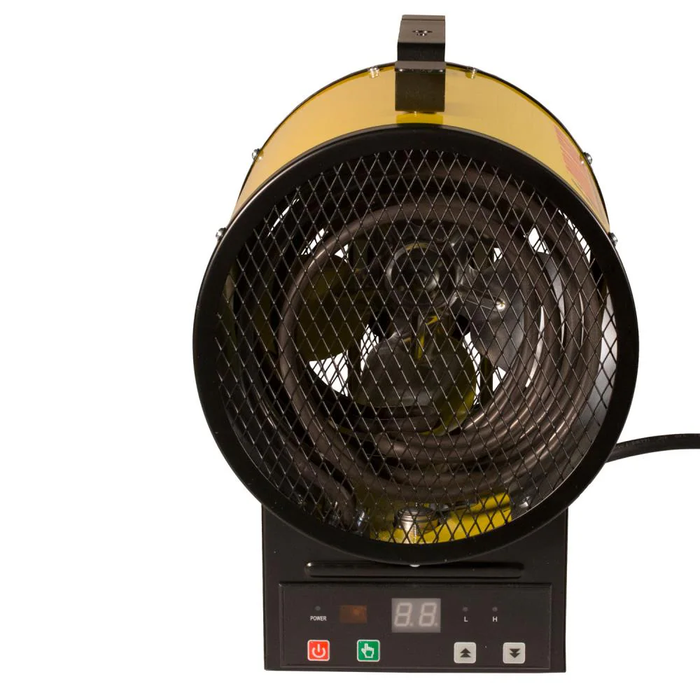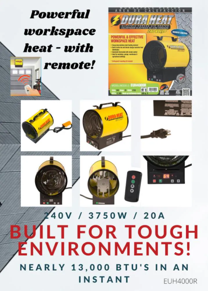 The EUH4000R’s 3750 W provide powerful heating to your work space. The tubular cabinet design of this electric forced air heater maximizes heat distribution, while the handheld remote makes adjustments a snap. The EUH4000R can be portable, or it can be mounted to the wall or ceiling with the included mounting kit. Both options make it the perfect choice for garages, workshops, warehouses, agricultural buildings, and many other heating areas. The heavy duty construction includes a stainless steel heating element, heavy gauge cabinet, built in turbo fan, remote control, and overheat shut-off. This heater does not reach temperatures high enough to kill bed bugs.