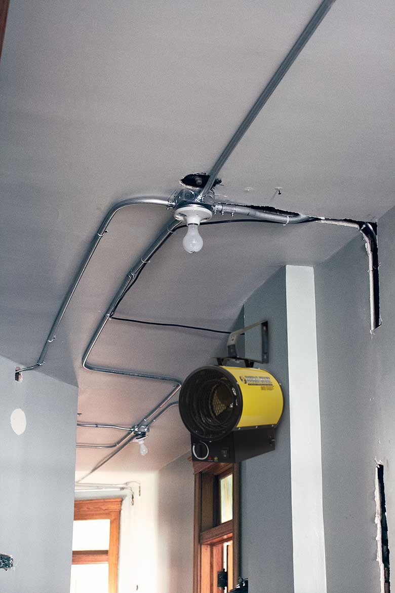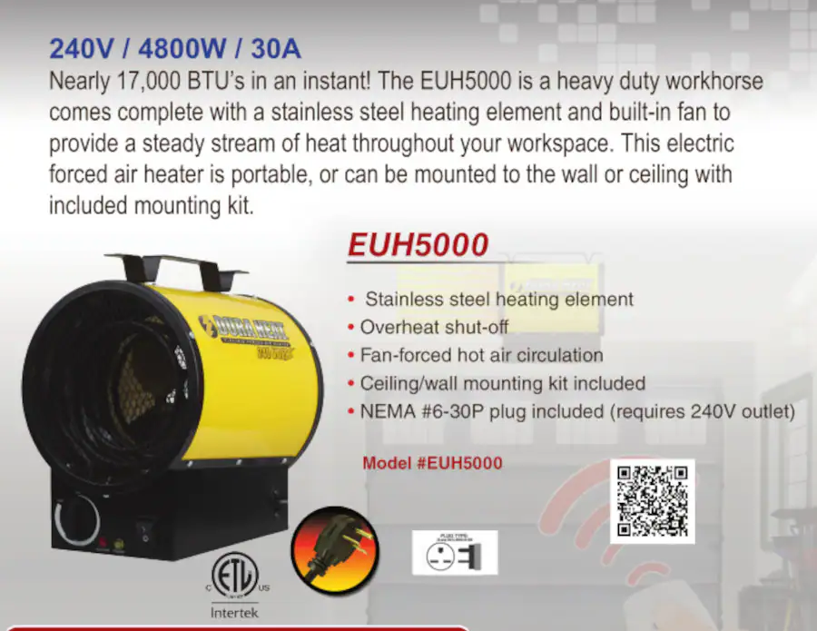 The EUH5000 240 Volt heavy duty workhorse comes complete with a stainless steel heating element and built-in heat circulating fan to provide a steady stream of heat throughout your workspace. This electric forced air heater is portable, or can be mounted to the wall or ceiling with included mounting kit. This makes the EUH5000 perfect for garages, workshops, warehouses, agricultural buildings, and many other large areas that need heat. The heavy duty construction includes a heavy gauge cabinet, continuous fan circulation, automatic thermostat, and overheat shut-off. This heater does not reach temperatures high enough to kill bed bugs.