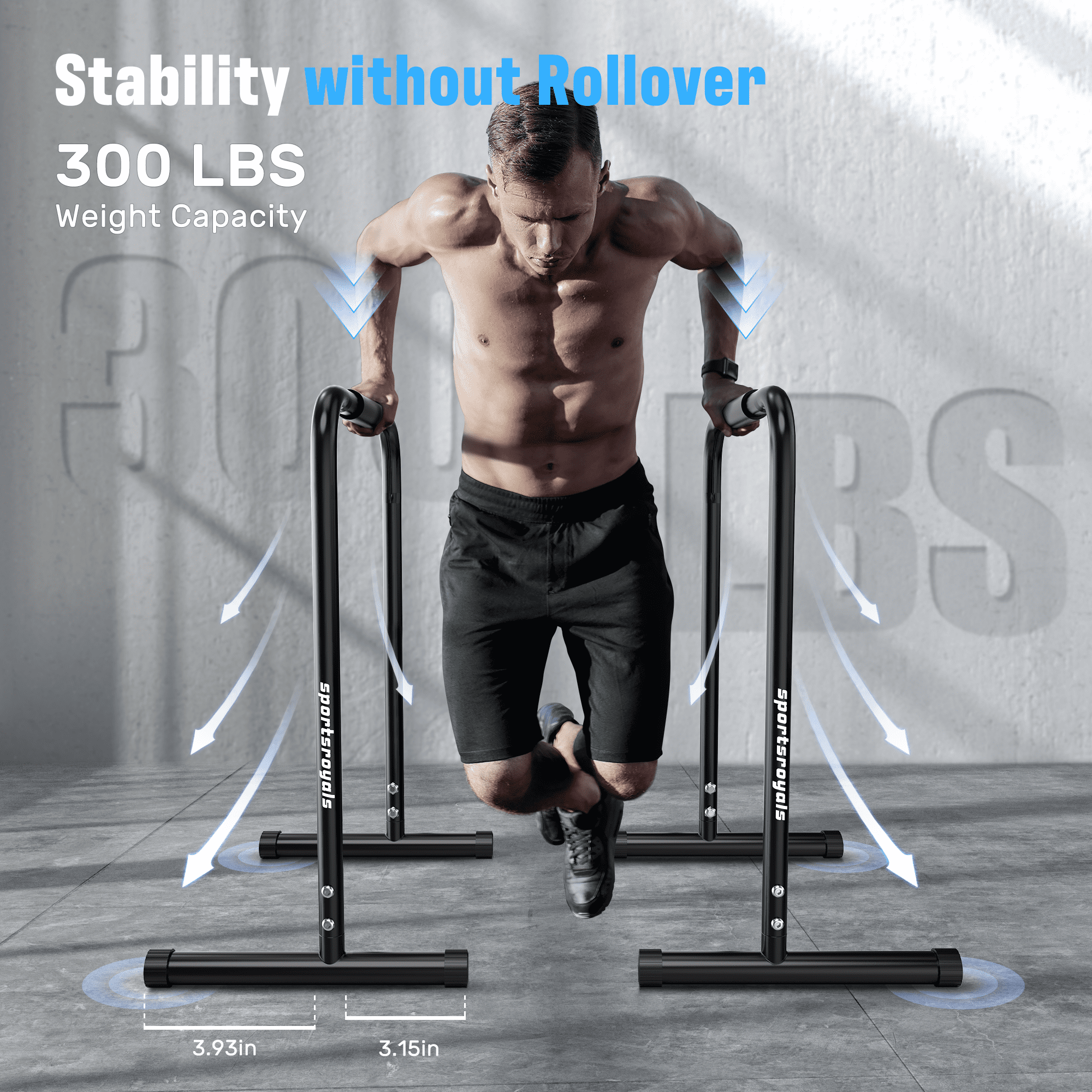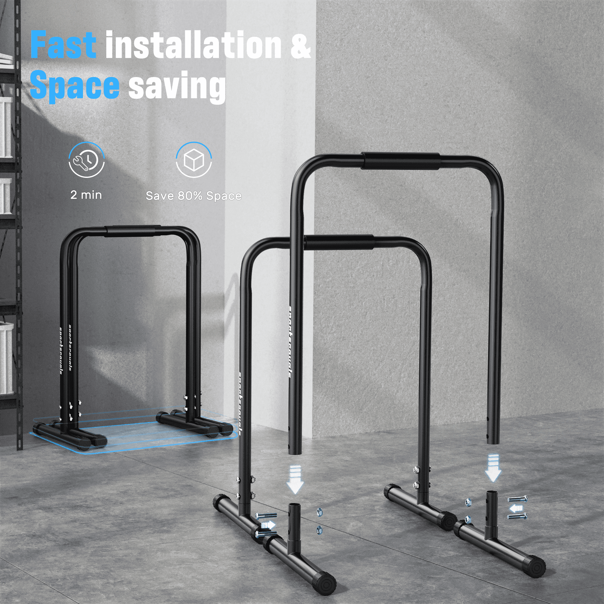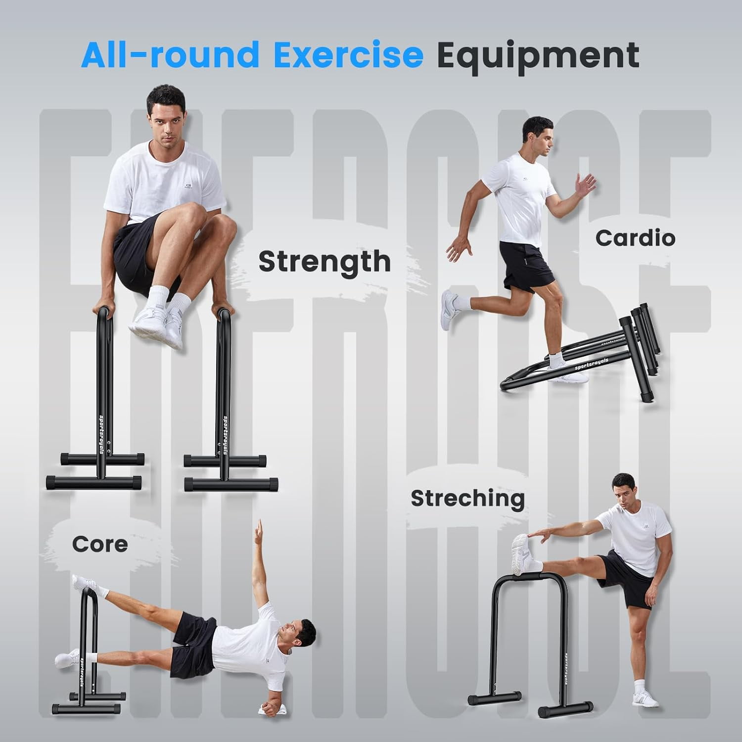 Sportsroyals Dip Bar Relife Sports Dip Bar allowing for multiple exercises from a variety of angles, fully exercising every muscle of yours.The dip bar is made of heavy-duty steel which is durable for a long service usage. Practical fitness equipment for home gym.2 parallettes bars can be stacked to store, will not take up too much space. Suitable for daily workouts at home or in the office.