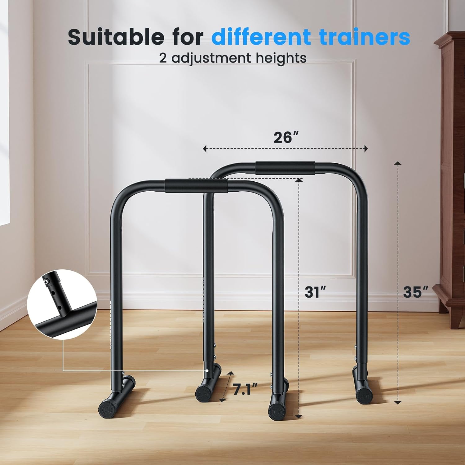 Upgo Heavy Duty Steel Dip Station, 300lbs Capacity, 26.52×30.42×3.12 in, 19.84 lb Effective fullbody exercise with smooth, highcalorieburning movements to effectively work muscles and burn fat Adjustable dip bars with heights ranging from 31″ to 35″ and unlimited width adjustment to accommodate different body types and heights Easy assembly in just 2 minutes with included tools; stackable design for convenient storage in any corner of your home Adjustable nonslip foot covers to prevent slipping and protect floors from scratches; legs can be adjusted for stability on uneven ground Constructed from highdensity steel, supporting users up to 300 lbs for longterm stability during workouts Soft grip handles made of comfortable, nonslip, sweatabsorbent foam for a comfortable workout experience