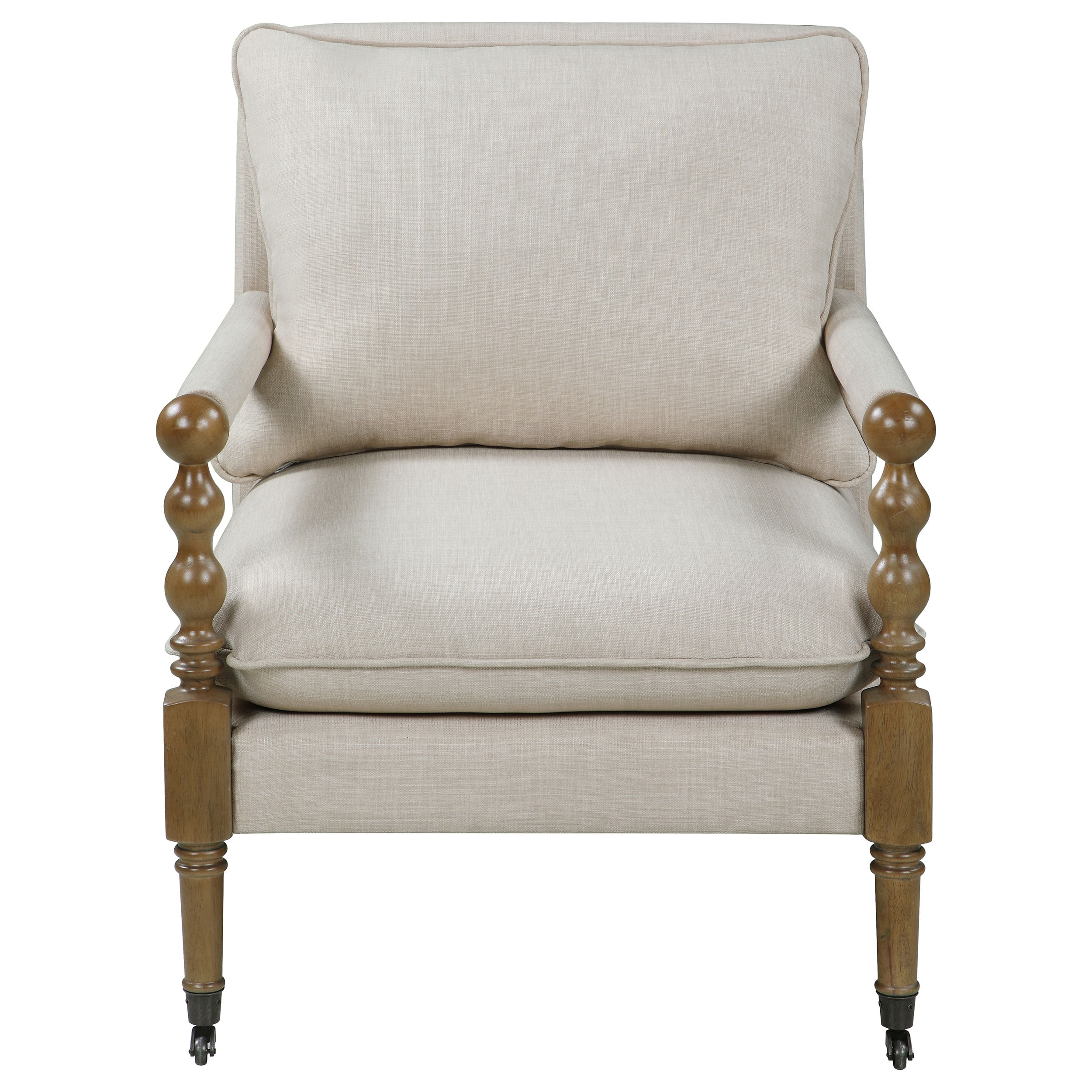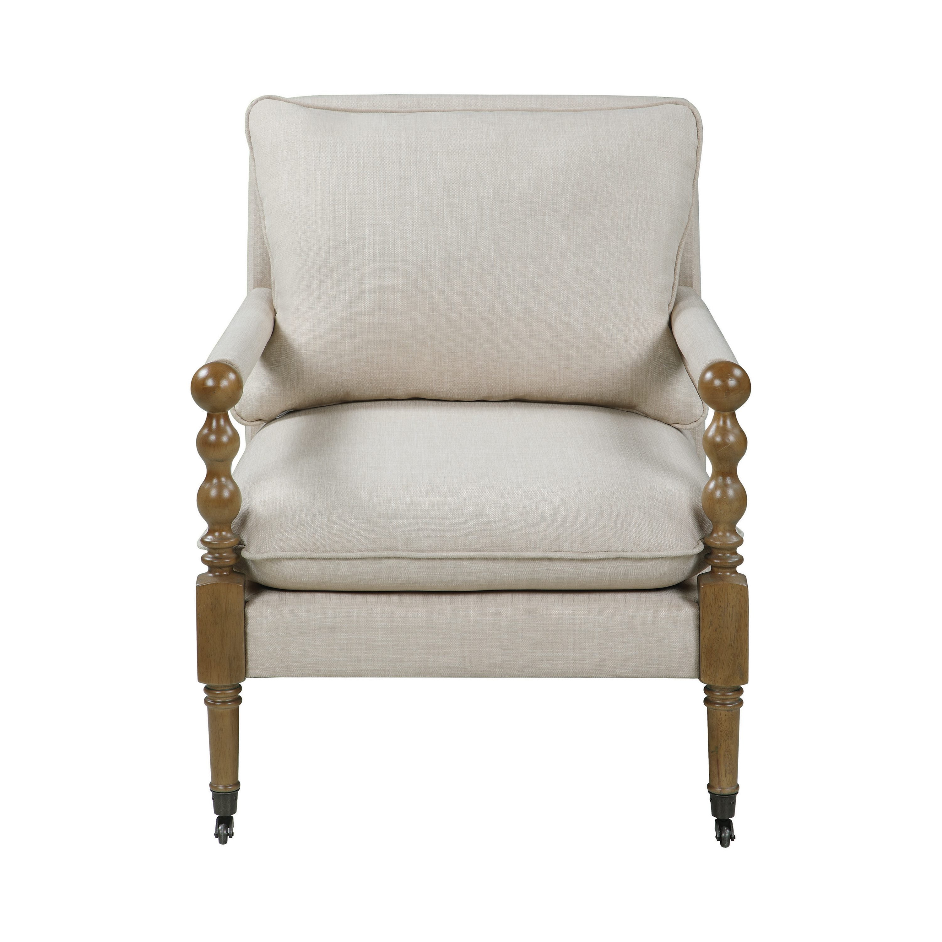 Introduce stylish comfort to a master suite or living room seating area. This upholstered accent chair features wonderful linen-line fabric that elevates its inviting style to new heights. Exposed wood framing in a dark oak finish draws the eye and offers a touch of contrast. The chair features a plush seat and back pillow, with covered arms that add comfort. Curl up with a book or catch up with a friend.