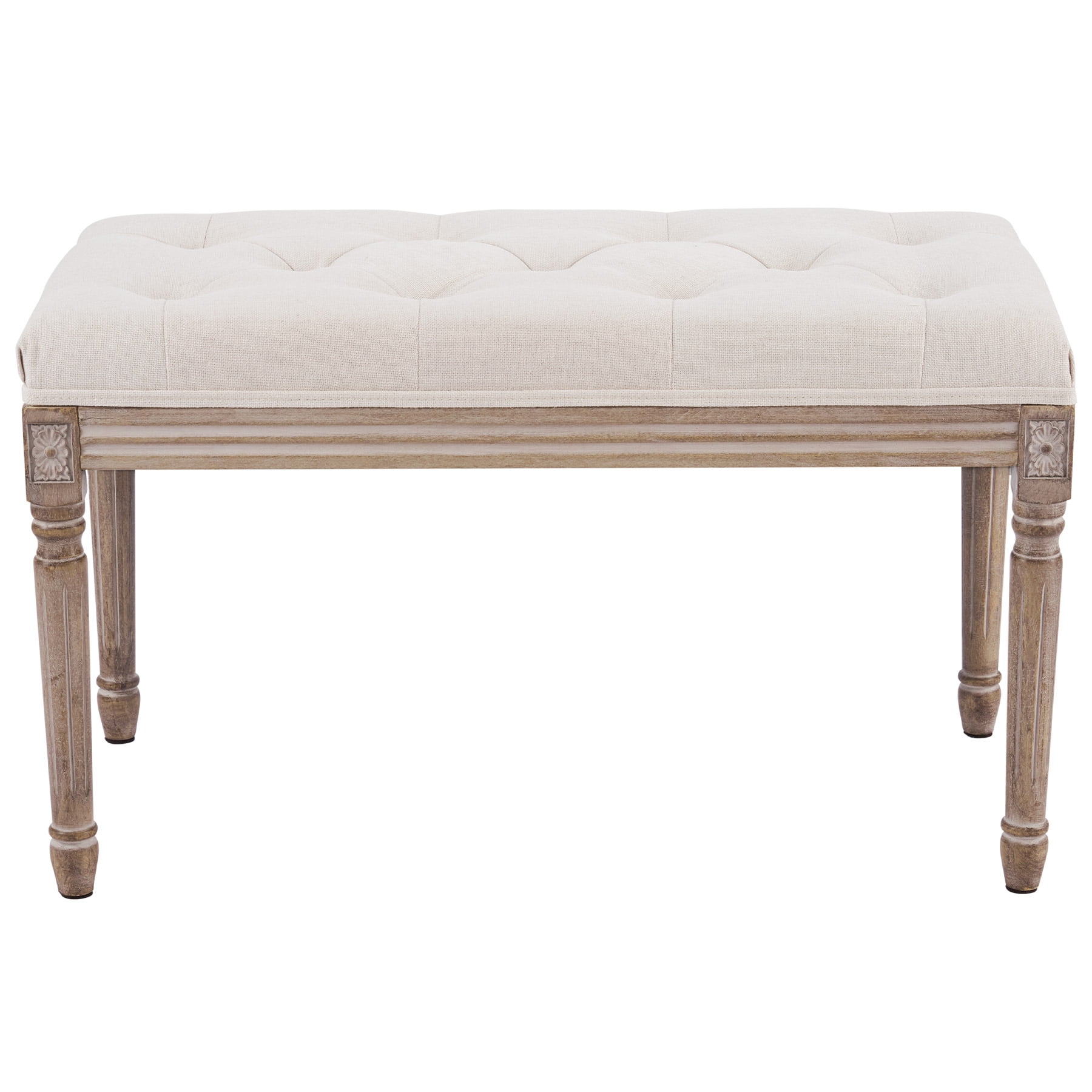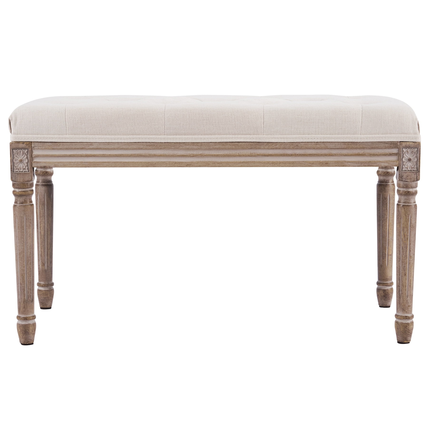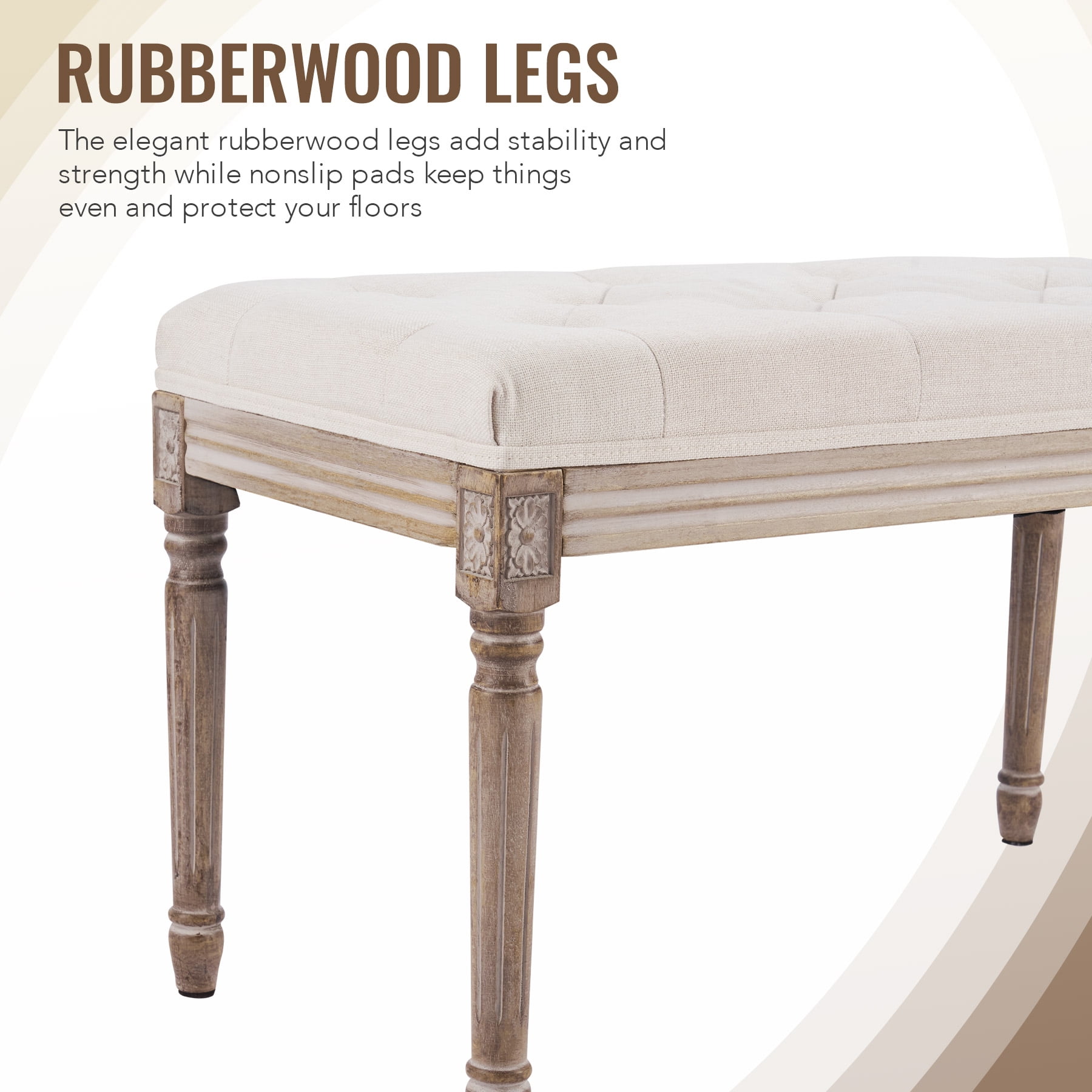 Enjoy rustic chic charm without sacrificing strength or functionality with this plush button tufted bench! Styled after vintage French furniture, this 31.5 inch long linen upholstered hallway or entryway bench features unique delicate carvings to add a subtle accent, while offering modern comfort with its thick 2 layer foam padding. The weathered rubberwood construction provides a lived-in look as well as superior strength to support up to 330 pounds. Functional art with tasteful design, this French cottage style ottoman bench works in any space and decor from traditional farmhouse to contemporary minimalist. Whether cozied up to a piano or used as an end of bed bench, this modern seating is sure to brighten your room and your life! Features 【FUNCTIONAL ART】: This 31 by 15.7 inch vintage bench marries modern strength and French country flair, characterized by its white brushed wood, delicate carvings, and elegant muted colors to complement any home decor 【GRACEFUL ACCENTS】: The thick 2 layer padding consists of 0.8″ memory foam and 1.2″ high-density foam, combined with breathable linen upholstery and classic diamond tufting to offer lasting comfort with an inviting look for you and your guests 【SUPERIOR QUALITY】: Our durable ottoman bench’s weathered rubberwood frame and legs with corner reinforcements provide exceptional strength and hold up to 330 pounds 【GREAT VERSATILITY】: This 18″ high multipurpose bench is perfect for foyers and entryways, but also makes a stylish and comfy piano bench, handy end of bed bench, or extra seating in your dining or living room 【SIMPLE SETUP】: Our intuitive design, clear instructions, and pre-installed nuts guide quick and easy assembly of this button tufted bench, simply align the legs, tighten their bolts, and enjoy! Specifications Material: 330 gsm Linen, Foam, Rubberwood Overall Dimensions: 31.5 x 15.7 x 18.5 in. (80x40x47 cm) Color: Beige Weight Capacity: 330 lb. (150 kg) Net Weight: 14.1 lb. (6.4 kg) Package List 1 x Upholstered Bench 1 x Instructions