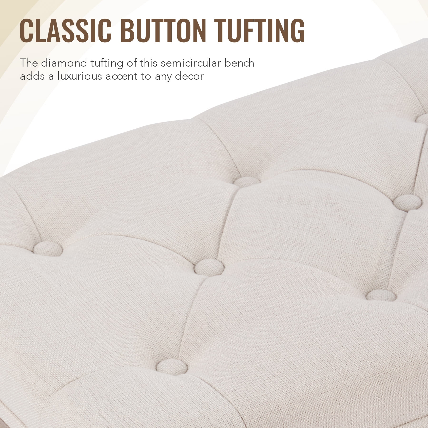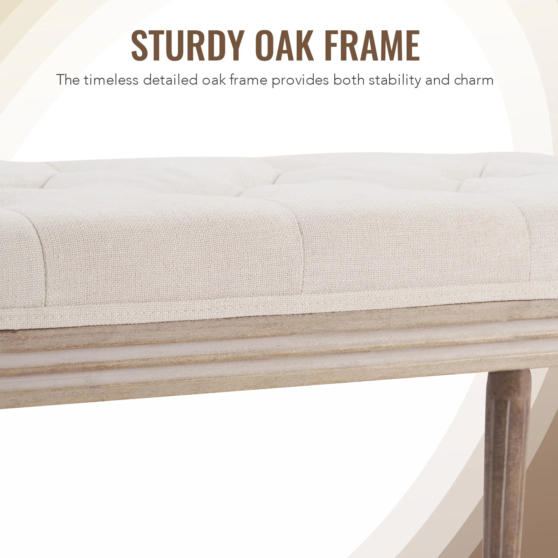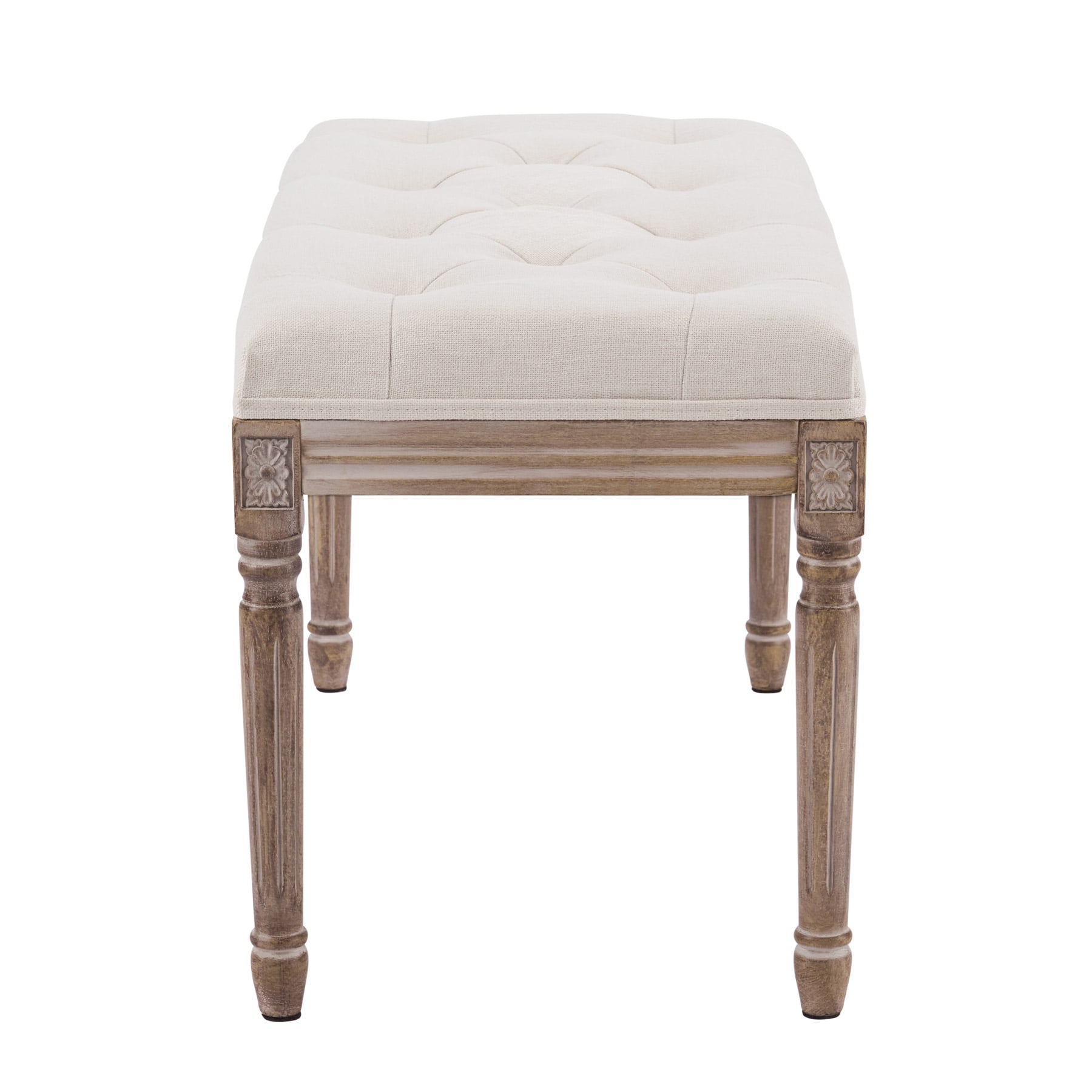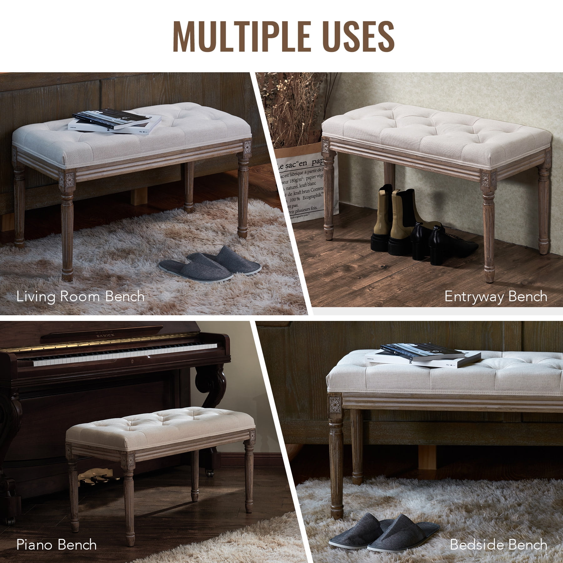 Enjoy rustic chic charm without sacrificing strength or functionality with this plush button tufted bench! Styled after vintage French furniture, this 31.5 inch long linen upholstered hallway or entryway bench features unique delicate carvings to add a subtle accent, while offering modern comfort with its thick 2 layer foam padding. The weathered rubberwood construction provides a lived-in look as well as superior strength to support up to 330 pounds. Functional art with tasteful design, this French cottage style ottoman bench works in any space and decor from traditional farmhouse to contemporary minimalist. Whether cozied up to a piano or used as an end of bed bench, this modern seating is sure to brighten your room and your life! Features 【FUNCTIONAL ART】: This 31 by 15.7 inch vintage bench marries modern strength and French country flair, characterized by its white brushed wood, delicate carvings, and elegant muted colors to complement any home decor 【GRACEFUL ACCENTS】: The thick 2 layer padding consists of 0.8″ memory foam and 1.2″ high-density foam, combined with breathable linen upholstery and classic diamond tufting to offer lasting comfort with an inviting look for you and your guests 【SUPERIOR QUALITY】: Our durable ottoman bench’s weathered rubberwood frame and legs with corner reinforcements provide exceptional strength and hold up to 330 pounds 【GREAT VERSATILITY】: This 18″ high multipurpose bench is perfect for foyers and entryways, but also makes a stylish and comfy piano bench, handy end of bed bench, or extra seating in your dining or living room 【SIMPLE SETUP】: Our intuitive design, clear instructions, and pre-installed nuts guide quick and easy assembly of this button tufted bench, simply align the legs, tighten their bolts, and enjoy! Specifications Material: 330 gsm Linen, Foam, Rubberwood Overall Dimensions: 31.5 x 15.7 x 18.5 in. (80x40x47 cm) Color: Beige Weight Capacity: 330 lb. (150 kg) Net Weight: 14.1 lb. (6.4 kg) Package List 1 x Upholstered Bench 1 x Instructions
