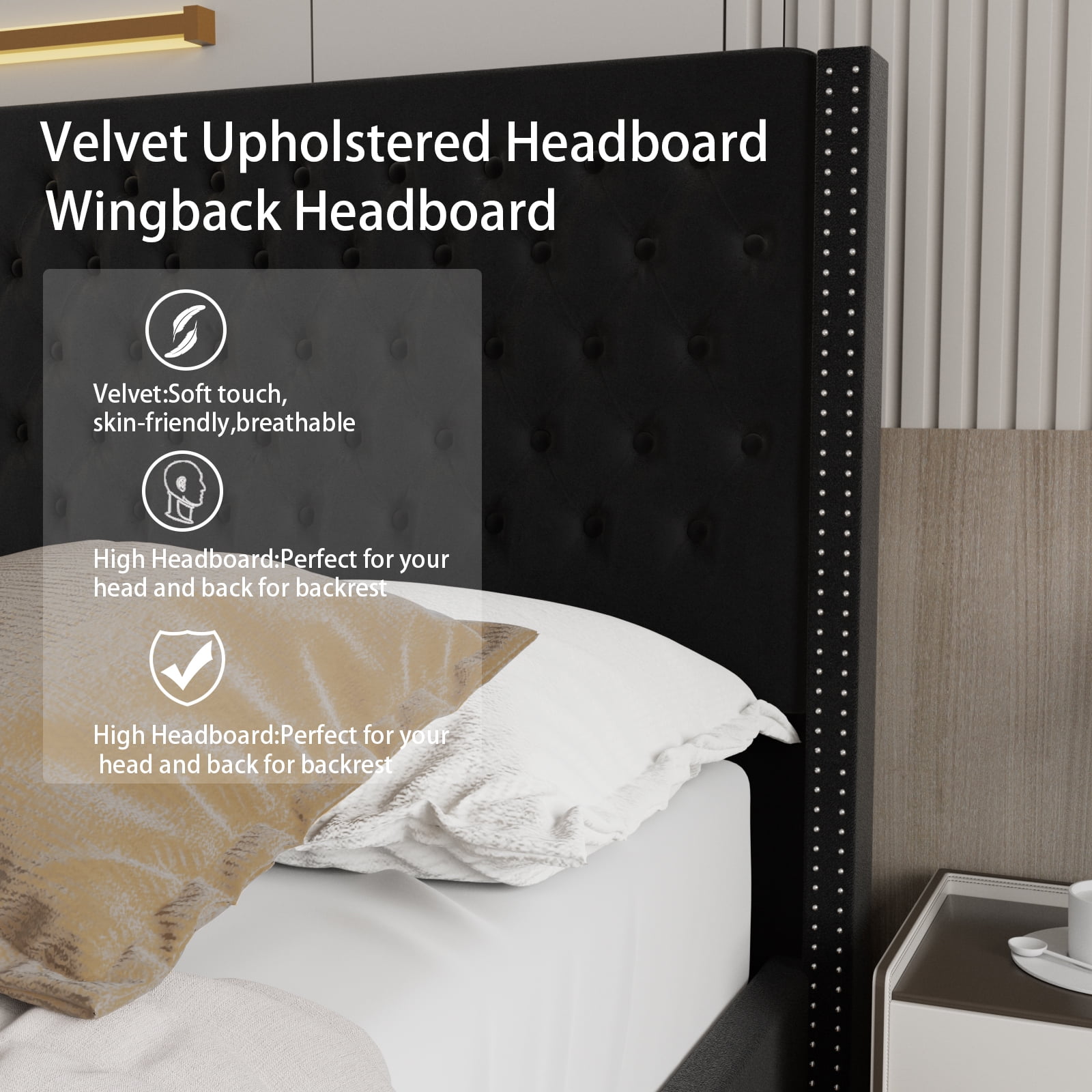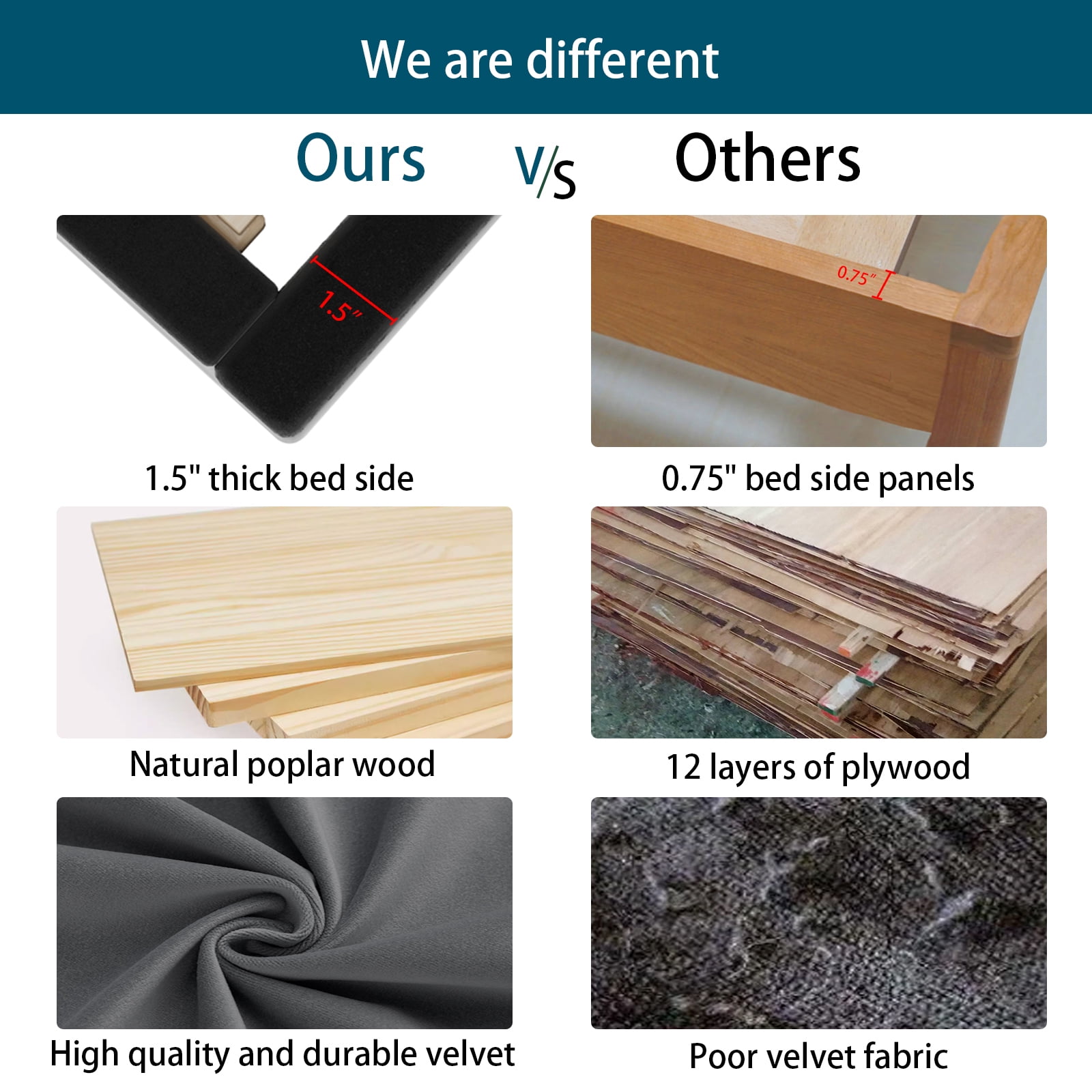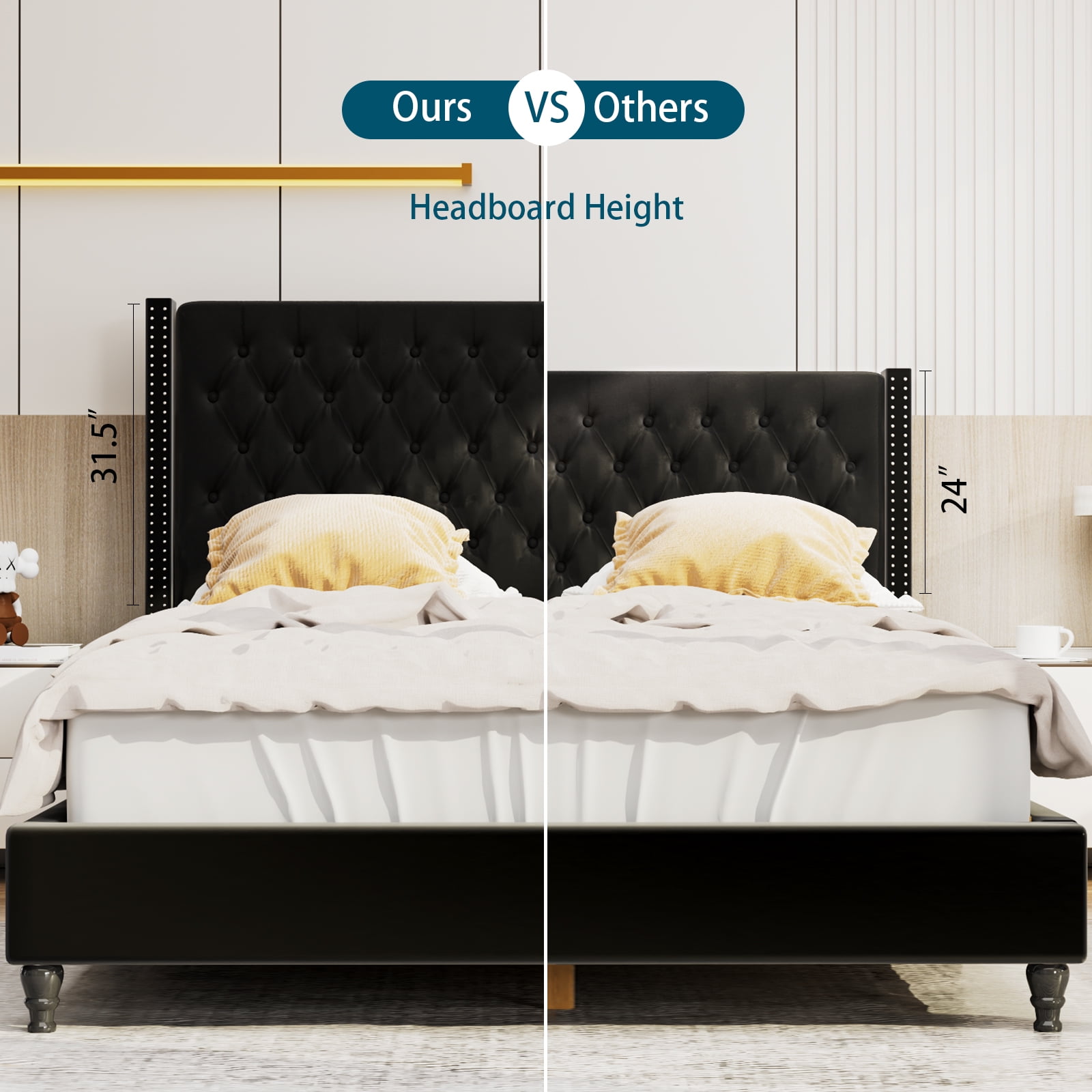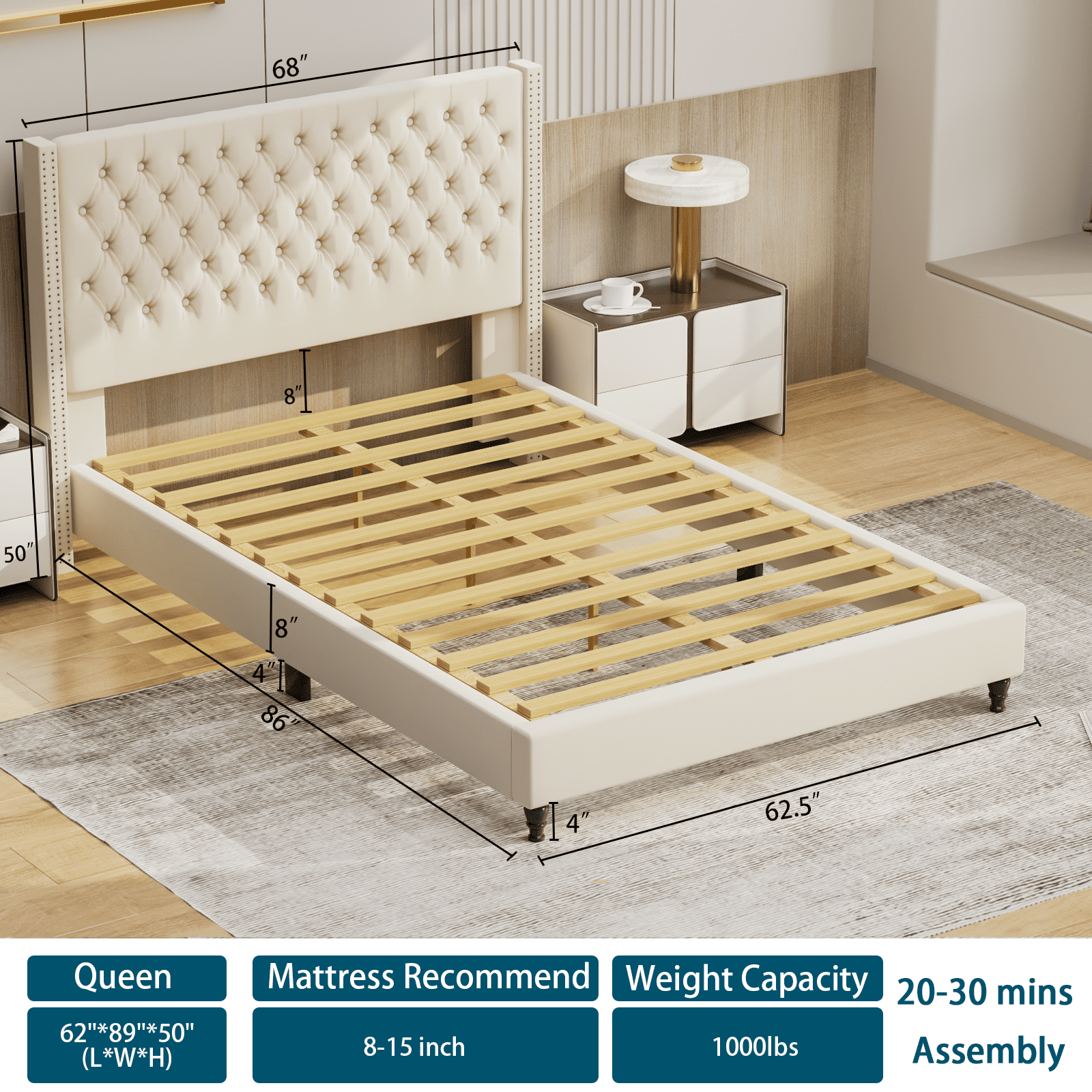 Sturdy & Stable: The upholstered bed is made of natural poplar wood, no glue, no special smell. Strong support wooden bunkie slats can load up the weight of 4 average-sized adults. Modern Design: The design of the upholstered bed frame is button diamond and a wingback headboard with vintage nailhead trim, which is suitable for all kinds of people and will be a better blend in the bedroom. Noise Free: The low Profile Platform Beds and box spring design allow children, pets, and people with limited mobility to easily go to bed and spend a good time.The upgraded locking system can prevent the generation of noise to the greatest extent. A certain amount of clearance is provided between the bed slats and the bed frame, reducing friction for a quiet and comfortable sleep. Packages and Assembly: The package includes 2 packages with the bed frame, instruction manual, and Assembly tools. The installation time is about 20-30min.Please tighten all the screws after building all the frames to ensure the balance and stability of the bed frame installation. It is recommended to use it on flat ground to achieve the purpose of prolonging the service life of the product. 8″-15″ mattress is recommended. Romantic Headboard Design: The tufted bed frame adopts button diamond and wing headboard design, which will be a more romantic feel to the room. The High resilience and high-density sponge headboard gives strong support to the head and back so that you don’t feel tired when your lumbar work for a long time.