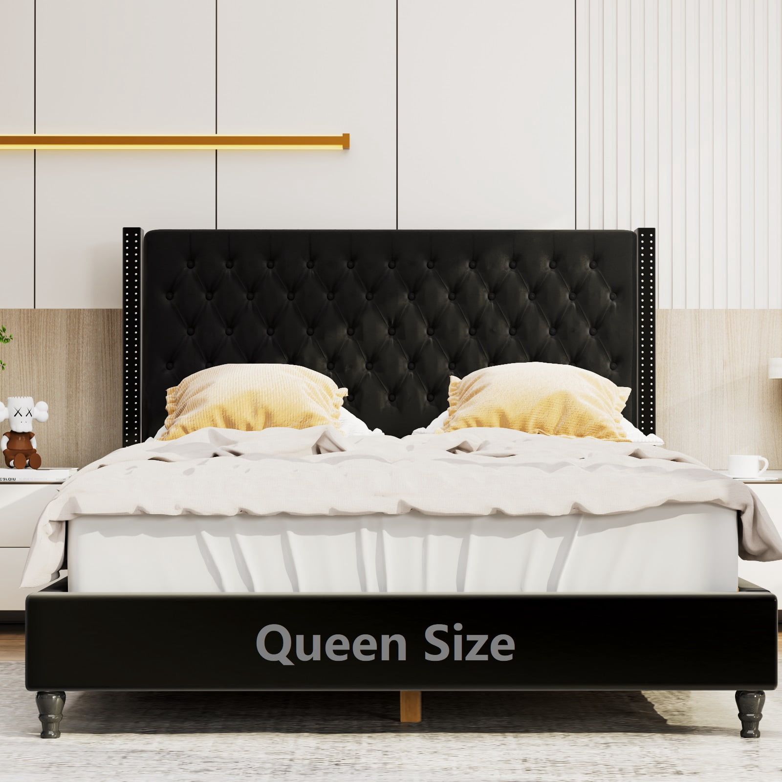Upholstered Tufted Bed, Platform Bed Frame with Diamond Low Profile Platform Beds Strong Wooden Slats, Queen Size Black