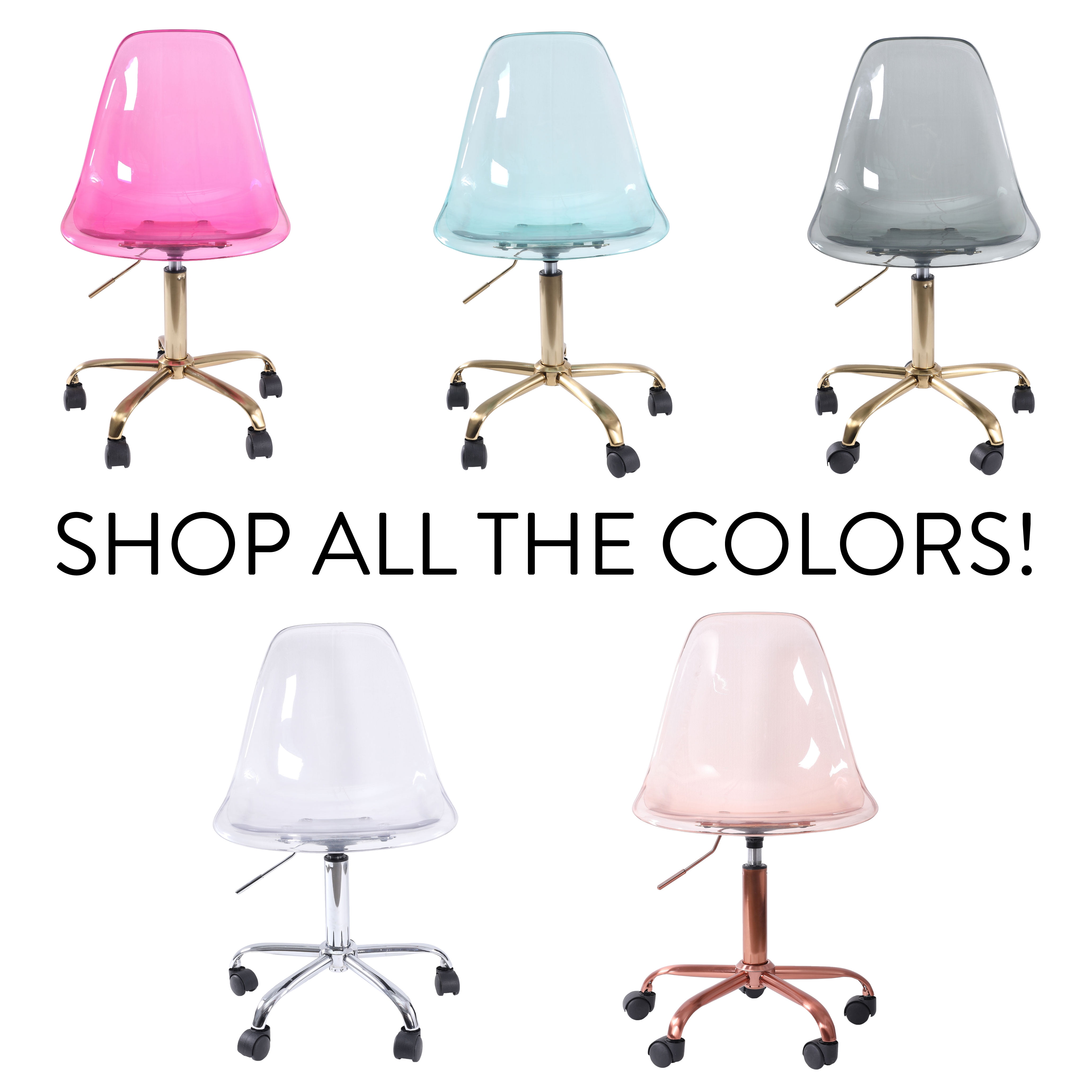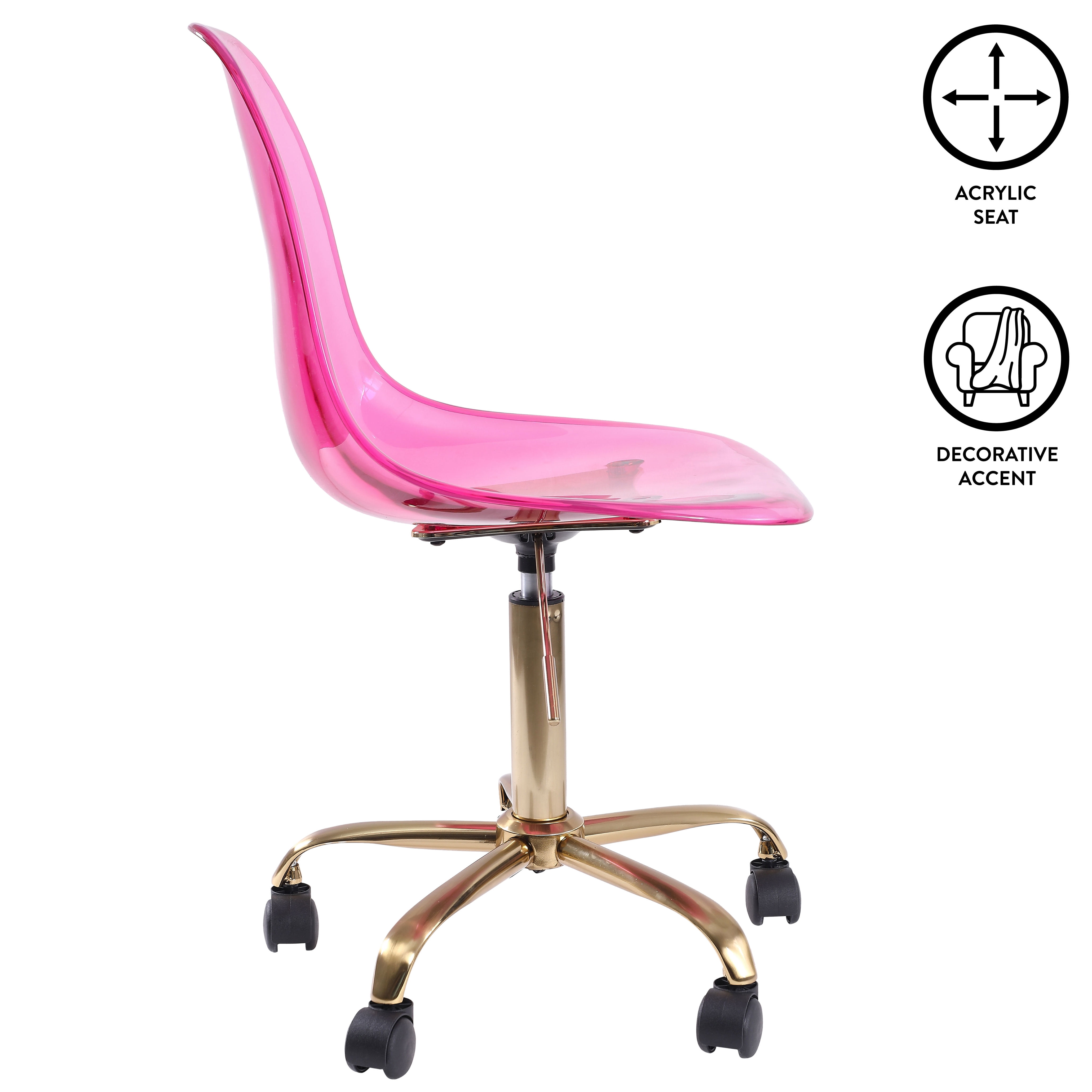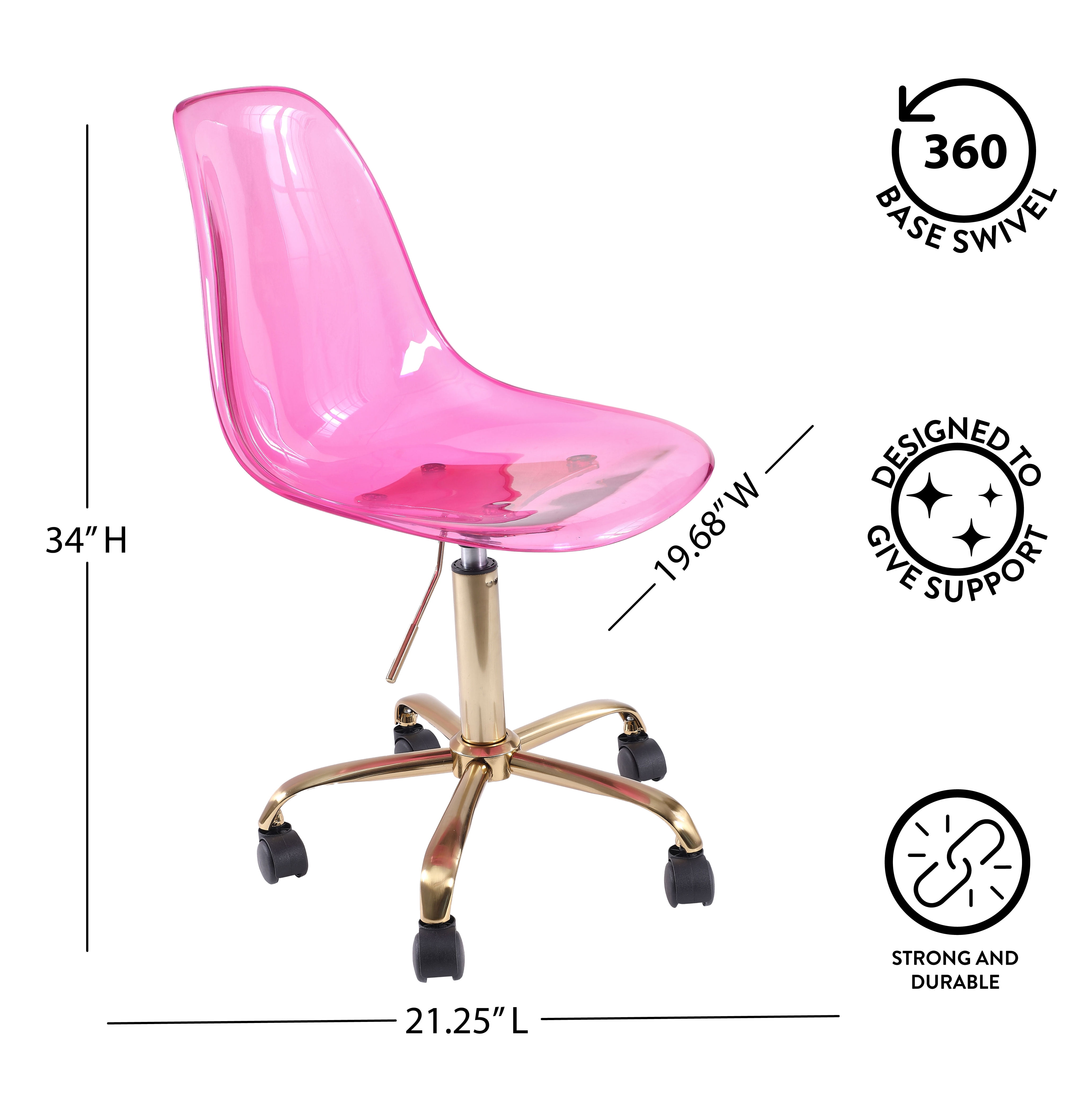 Contemporary office or home desk chair Features and acrylic style with a golden base Design blends into home or office decor Wheel casters allow for easy movement when transporting from room to room Adjustable level is convenient for finding your ideal height Available in multiple colors for any adult Weight capacity: 225 lbs Weight: 33 lbs Seat Depth: 16.53 in Assembled product dimensions: 21.25″L x 19.68″W x 34.00″H
