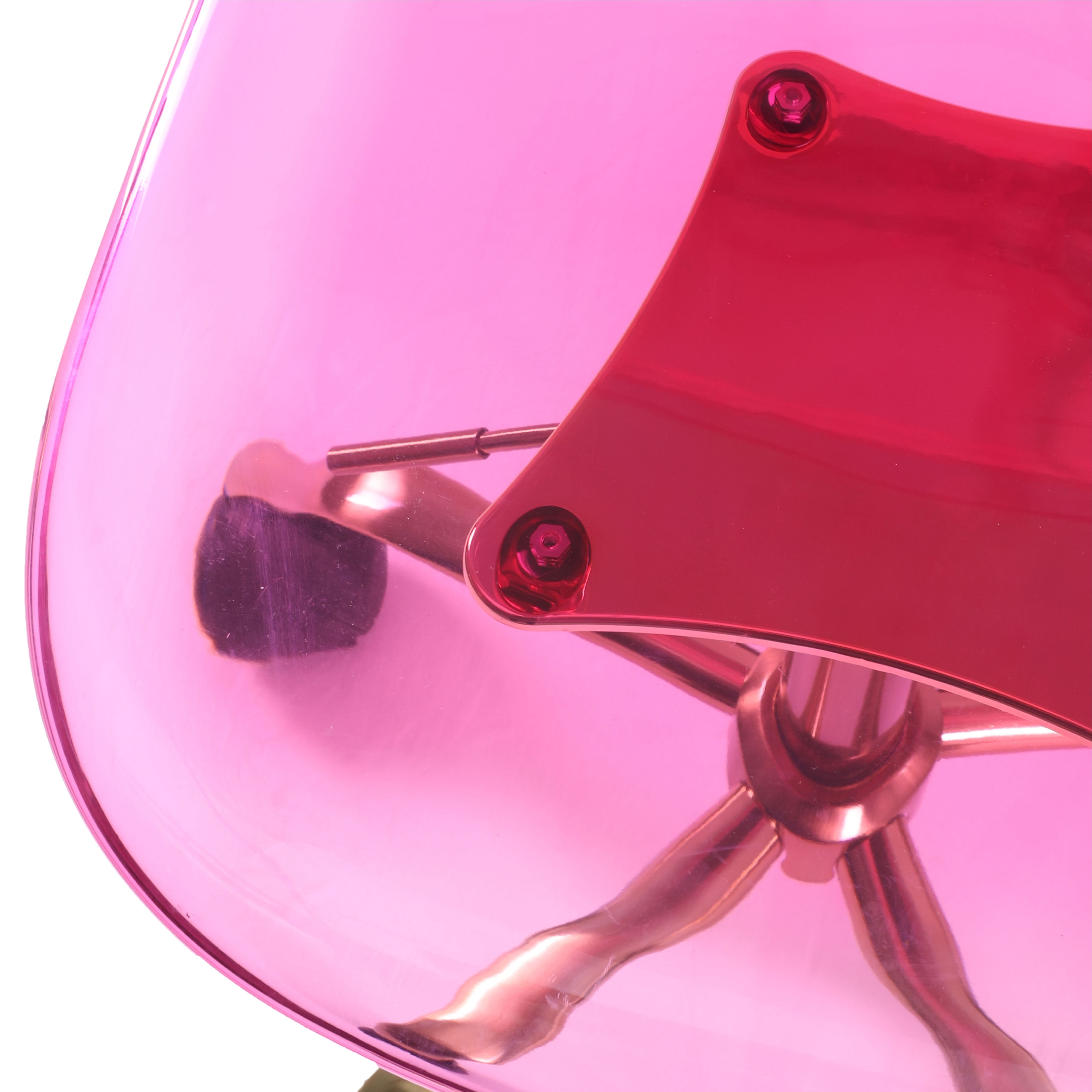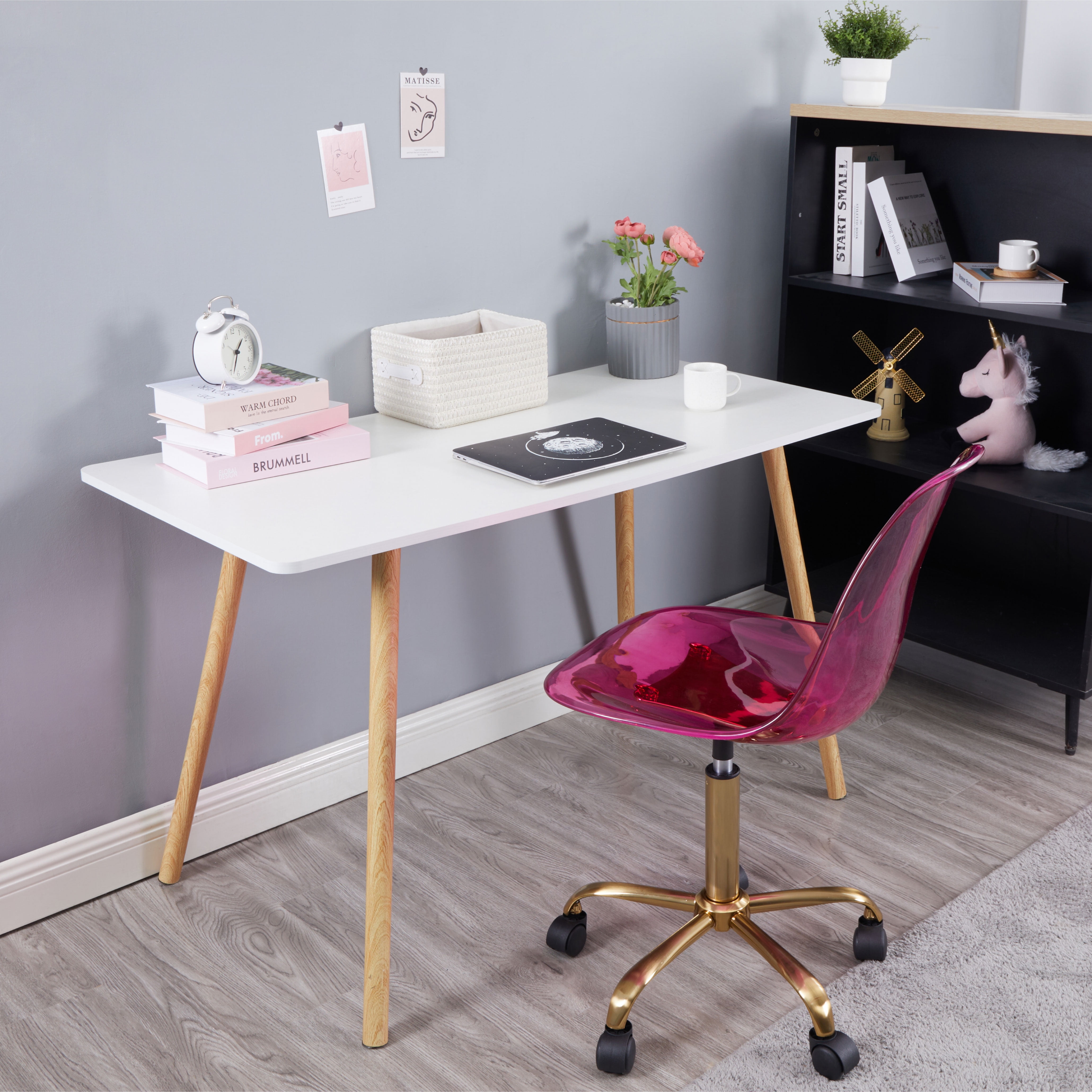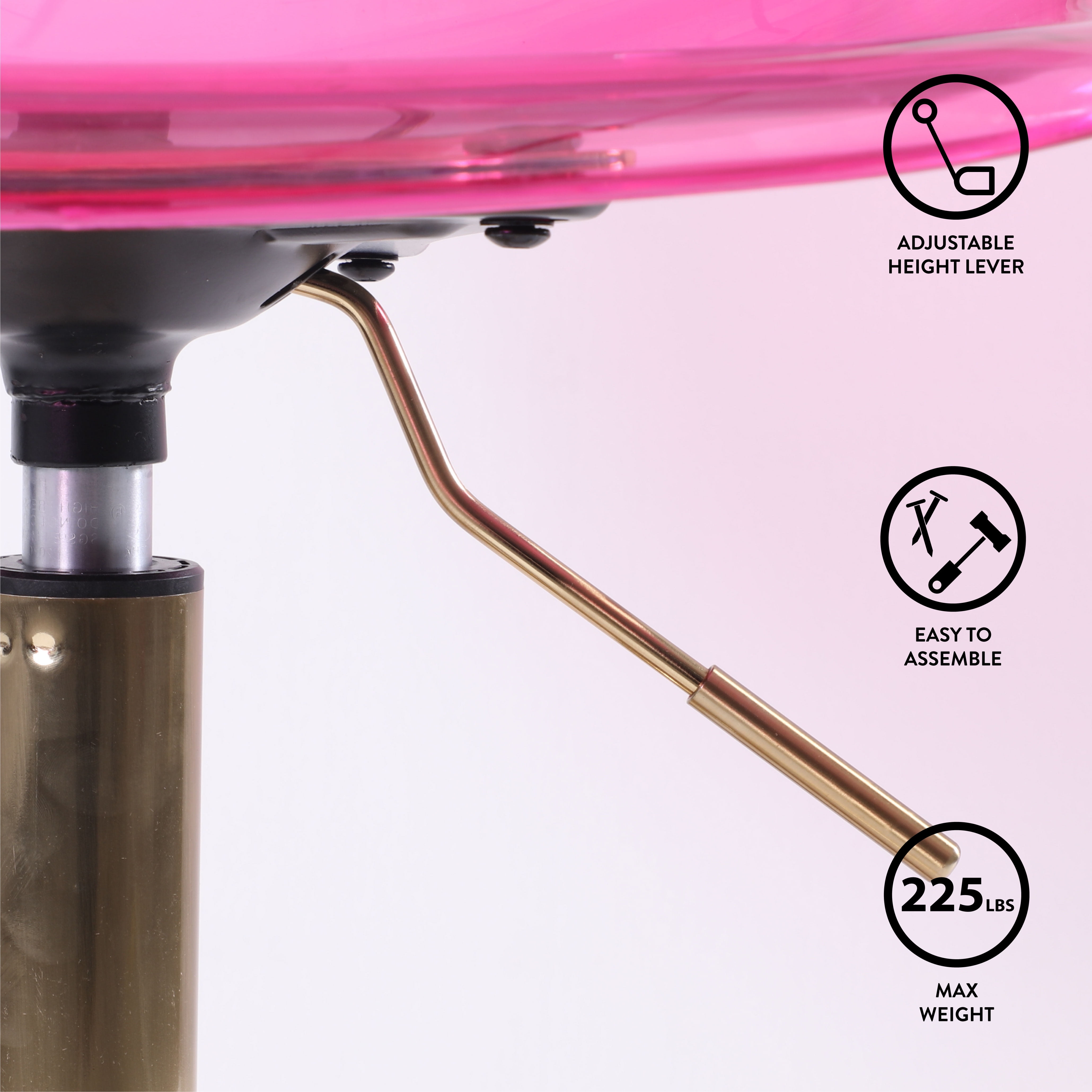 Contemporary office or home desk chair Features and acrylic style with a golden base Design blends into home or office decor Wheel casters allow for easy movement when transporting from room to room Adjustable level is convenient for finding your ideal height Available in multiple colors for any adult Weight capacity: 225 lbs Weight: 33 lbs Seat Depth: 16.53 in Assembled product dimensions: 21.25″L x 19.68″W x 34.00″H