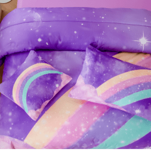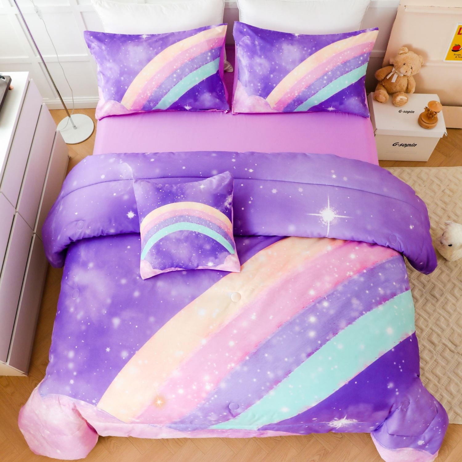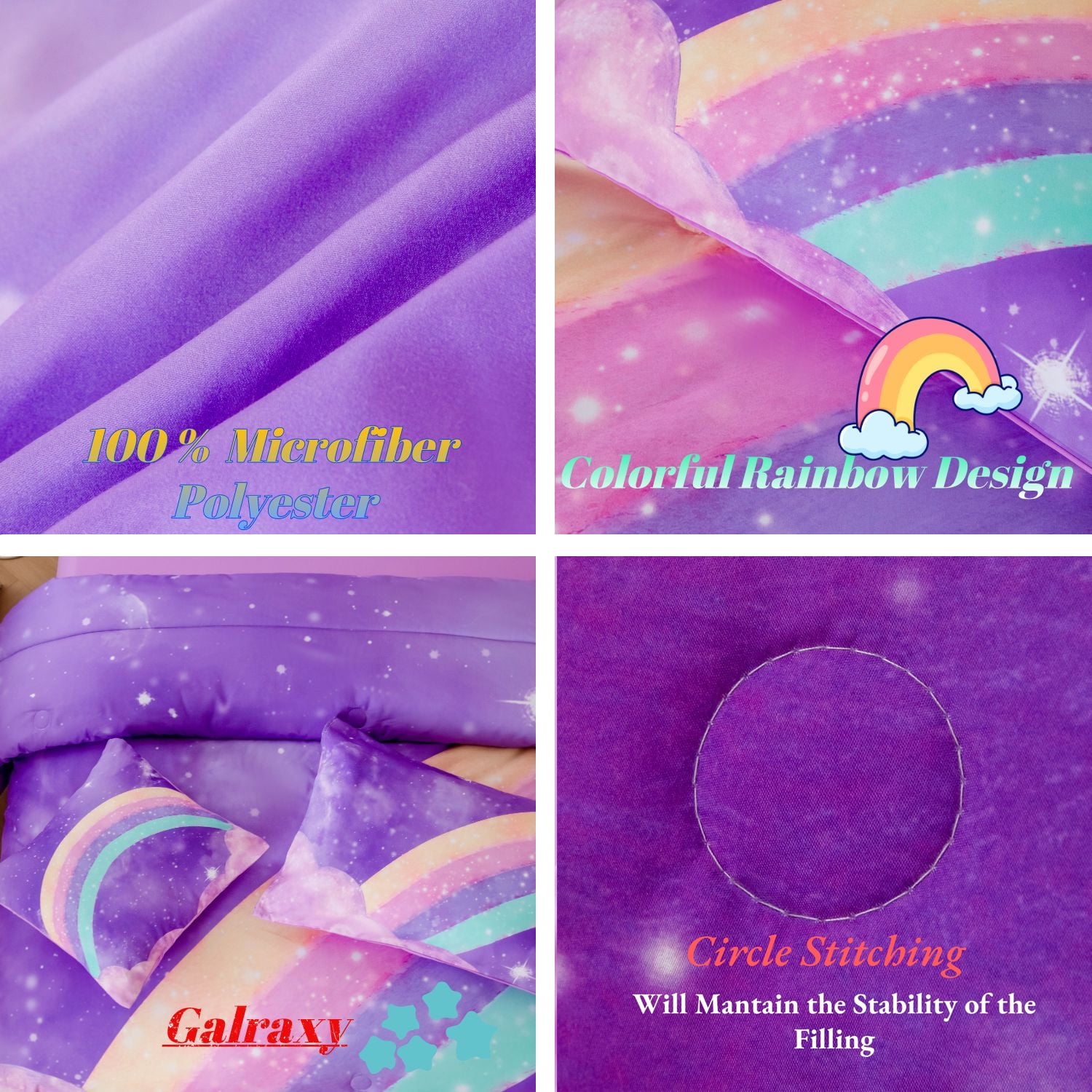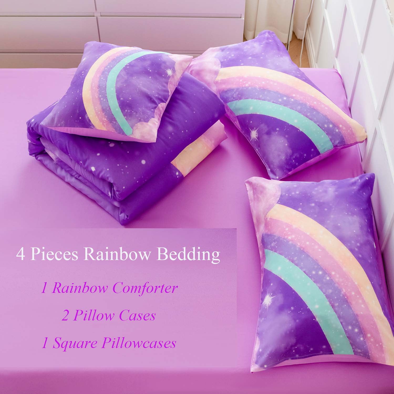 [MATERIAL]: The girls comforter set is made of premium quality brushed microfiber material with soft microfiber inner fill. The kids bedding set is more comfortable and soft, which can provide comfort and breathability while you sleep. Bedding can help regulate your body temperature and provide a comfortable sleeping environment. The bedding comforter set is durable and lightweight to use. [4PCS GRADIENT RAINBOW GIRLS COMFORTER SET FULL SIZE INCLUDING]: 1 comforter: 80” x 91”, 2 standard pillow cases 20” x 30”, 1 square pillow cover 20” x 54”. [UNIQUE DESIGN]: The 3D rainbow comforter gradient galaxy kids comforter set is a symbol of hope and light, which makes the room more vibrant and vivid. The 3D pastle nebula girls comforter bedding set makes a mysterious visual enjoyment to your bedroom. The lovely and cute girls comforter set improves the overall beauty of the room. Every girl deserves the comforters.