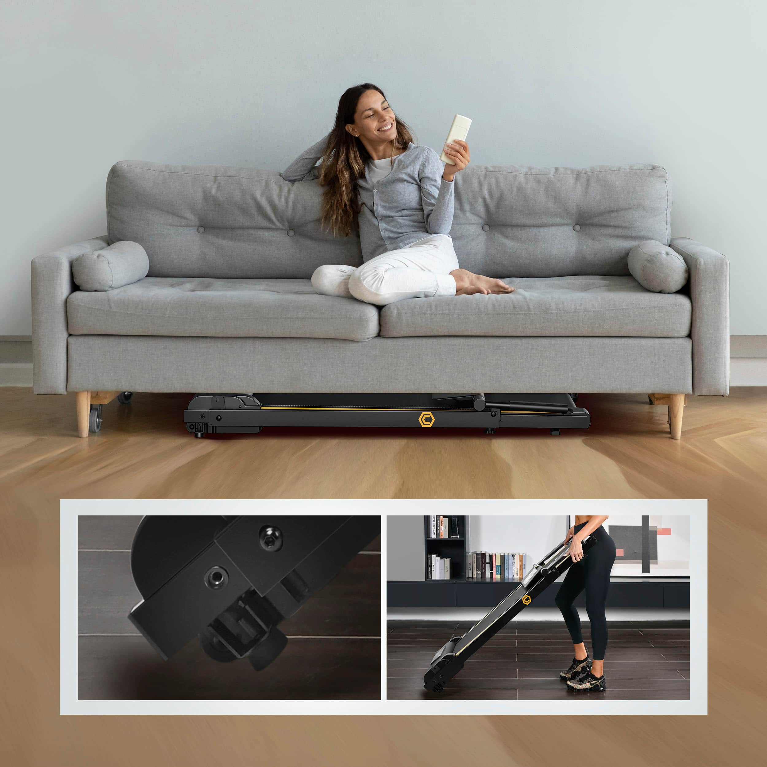 Folding it in only one step! The folding size is 48x26x5.5 inch (L x W x H). The compact design also makes it easier to store anywhere, even under the bed or sofa, taking up minimum space. UREVO new folding treadmill is now smaller and more convenient, weighing only 50lbs.