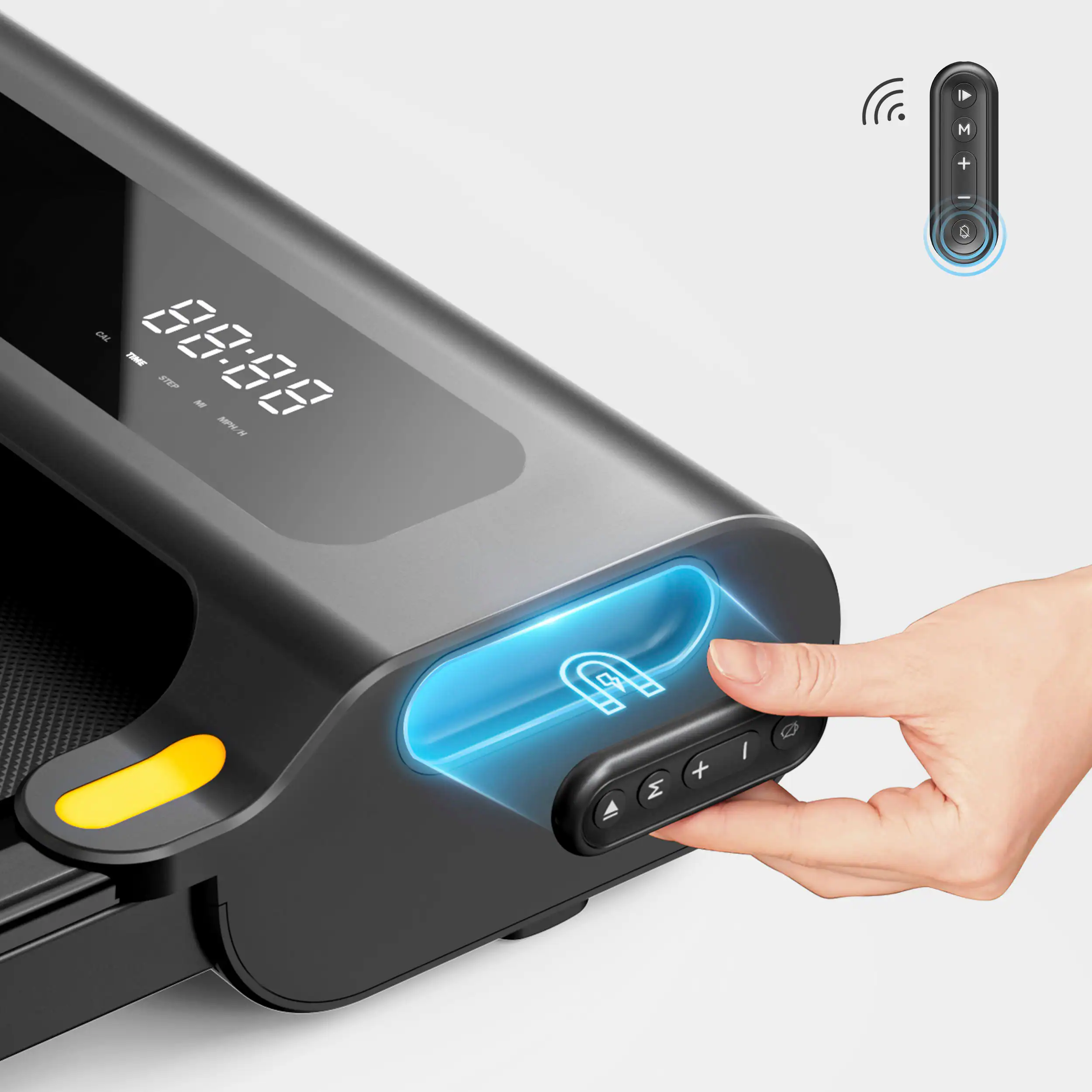 0.6-4mph speed range, can be adjusted according to your needs. Not only for running, but also for use under your desk. It is equipped with a remote control for easy adjustment, and the back of the remote control is equipped with magnets, which can be attached to the treadmill to prevent loss when not in use.