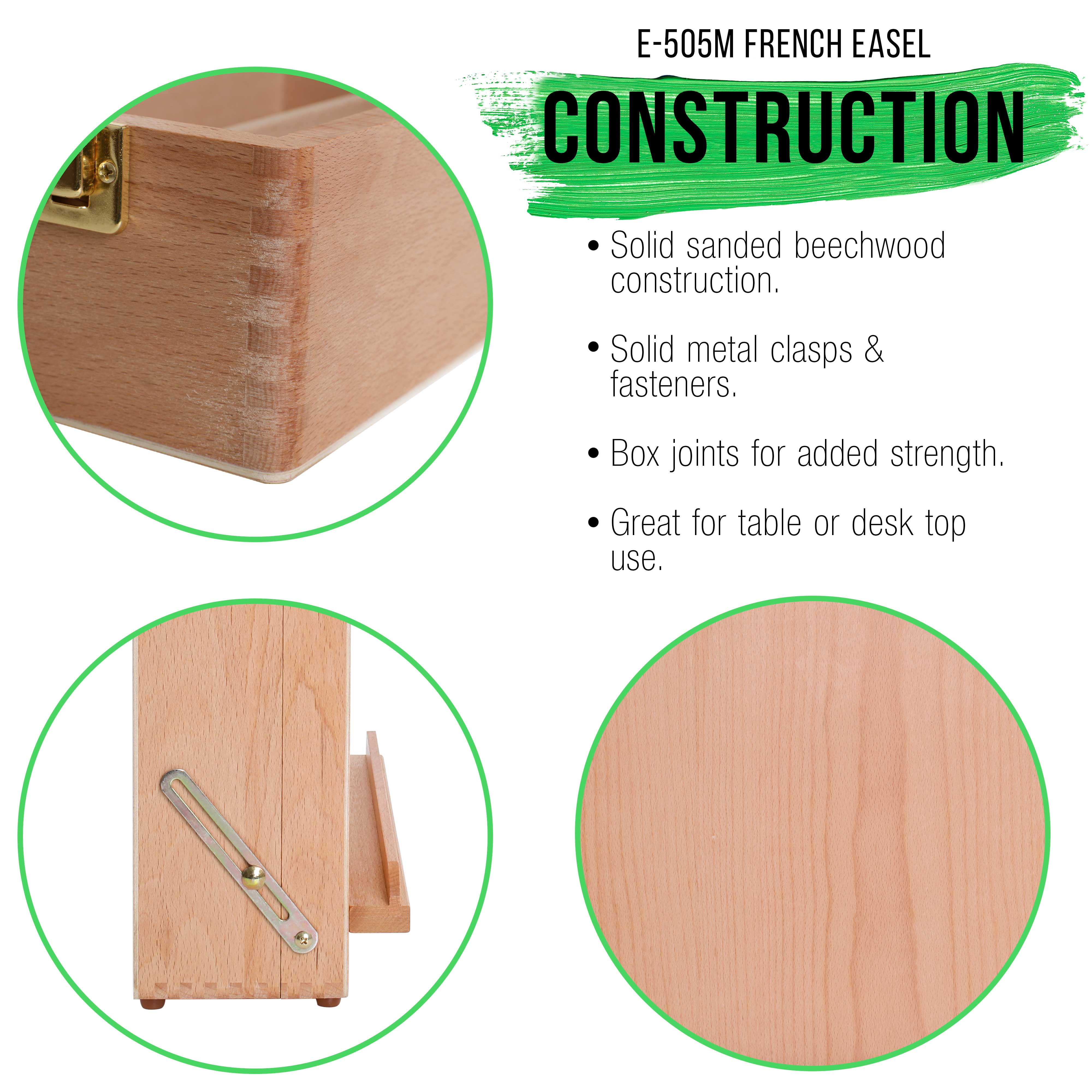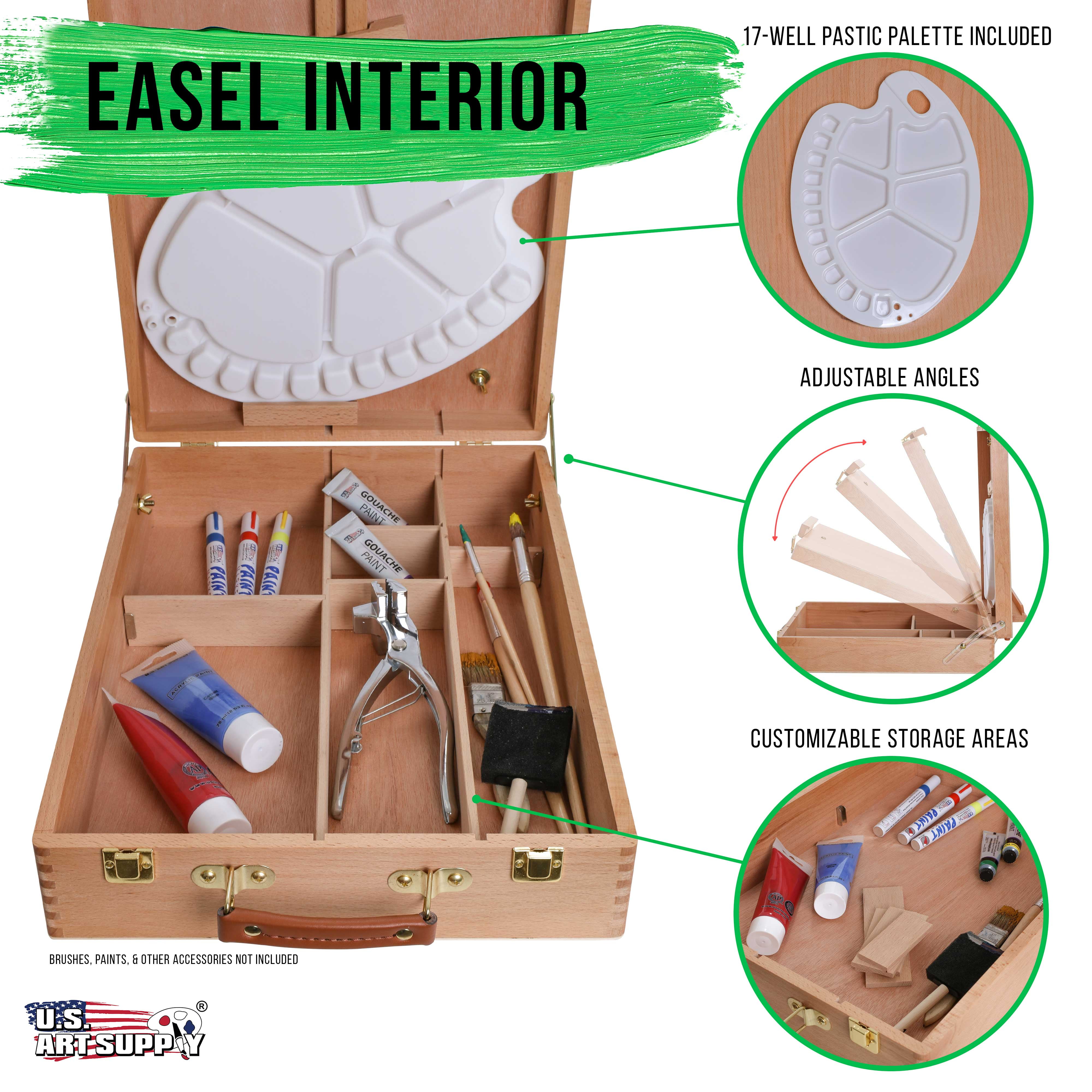 French easel style designed sketchbox with a large storage box that converts into a painting easel. A natural wood colored desktop easel box that’s oil finished. Made with hand sanded high quality aged Beechwood that’s grown in Germany. Sturdy lightweight tabletop sketchbox easel that can be adjusted to any incline angle position depending on the need, and will accommodate a canvas up to 28″. Includes a 17 well plastic painters palette. Folds to a compact box with carry handle. Storage sketchbox is divided into a 7 compartment interior with 4 removable dividing slats for adjusting comparment sizes. Store and organize sketch pads, paints, brushes, markers, pens, paper and other essential art supplies. It’s deal for keeping yourself organized while painting, drawing and sketching. Folded Dimensions: 17.75″ wide by 13″ deep by 5.5″ high, easel adjusts to 33″ high. It’s a durable user friendly art, studio and sketchbox easel that’s great for use by kids, beginners, students, as well as for advanced artists and professionals. Risk Free Purchase with our 100% Lifetime Satisfaction Guarantee. U.S. Art Supply is an industry leader in Art Supplies, so purchase our products with the confidence that we’ll offer you a 100% lifetime satisfaction guarantee that if you’re not happy with them at anytime, we’ll provide a full replacement or refund.