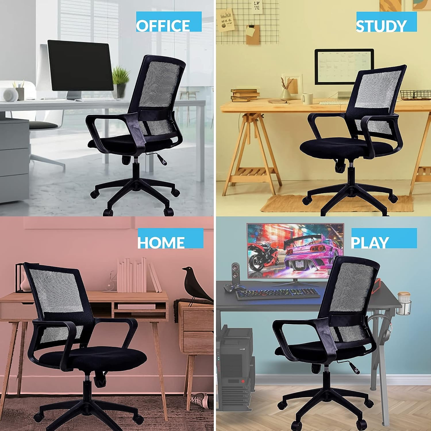 US Office Elements Mid Back Lumbar Support and Height Adjustment Office Desk Chair, Black Ergonomic design with rectangular lumbar support – This comfortable office chair provides lumbar support that follows the natural curvature of the spine, helping to deter back pain, muscle tenderness, and body aches Adjustable chair seat and rocking mechanism – Customize the chair’s height to align your hips and provide back support. The adjustable rocking mechanism allows you to lean back comfortably Space-saving design – Ideal for small home offices, this chair complements your workstation while providing enough space for all your work or study essentials Easy to assemble – Comes with a straightforward guide for quick setup, allowing you to install it in less than 20 minutes Stylish and durable – Made with breathable mesh material, high-quality foam cushion, curved armrests, and a gas lift cylinder, this chair is designed for long-lasting use while enhancing your productivity