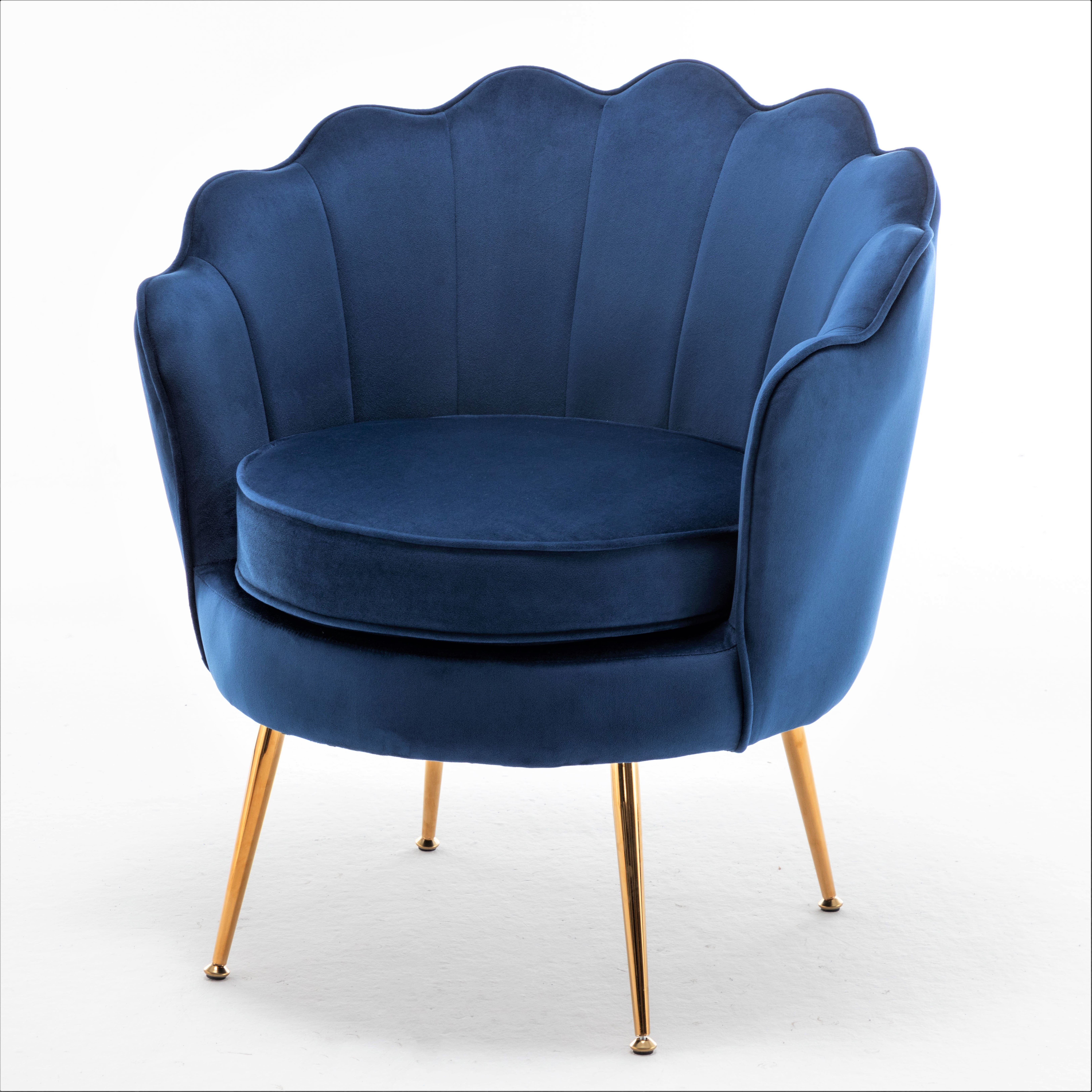 This barrel chair has a striking silhouette to creat a glam addition to your living room. It’s built with solid wood frame and features metal legs with a bold gold finish external. The dramatically curved back has a scalloped top edge that’s amplified. This armchair is upholstered in velvet and filled with foam for just the right amount of support as you sit. Additional trim around the back edge and circular seat give it a tailored touch, this chair works in traditional, modern, and contemporary spaces alike.