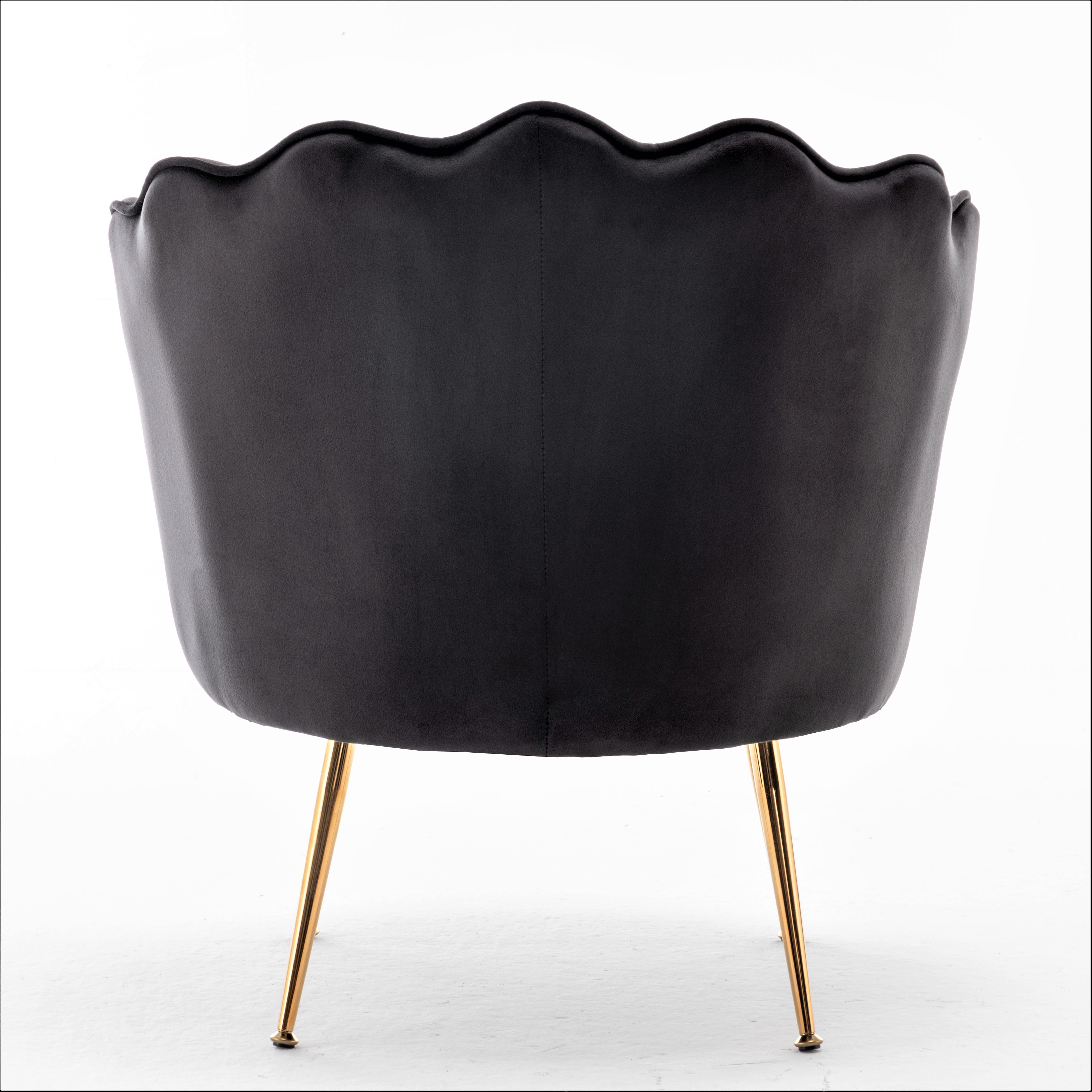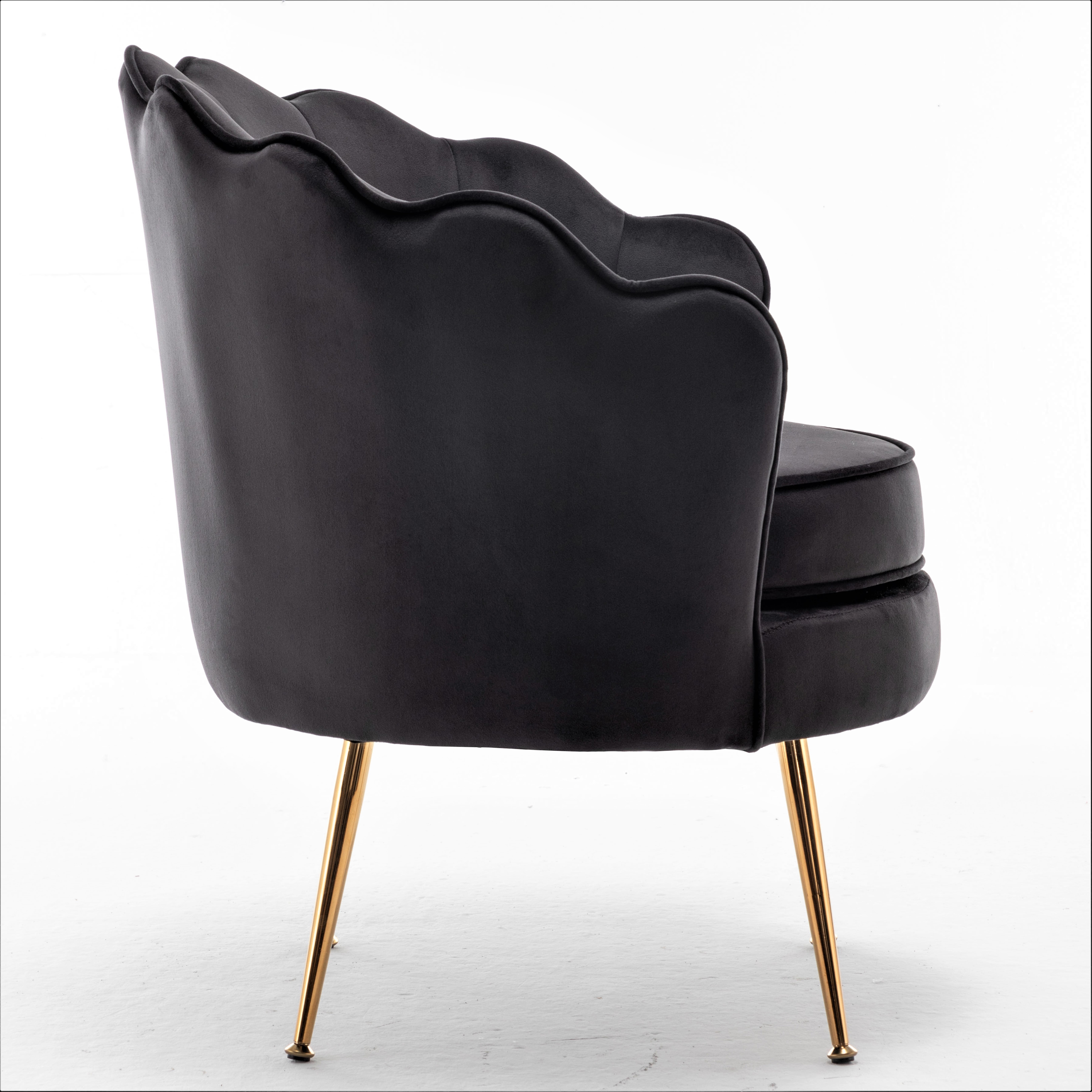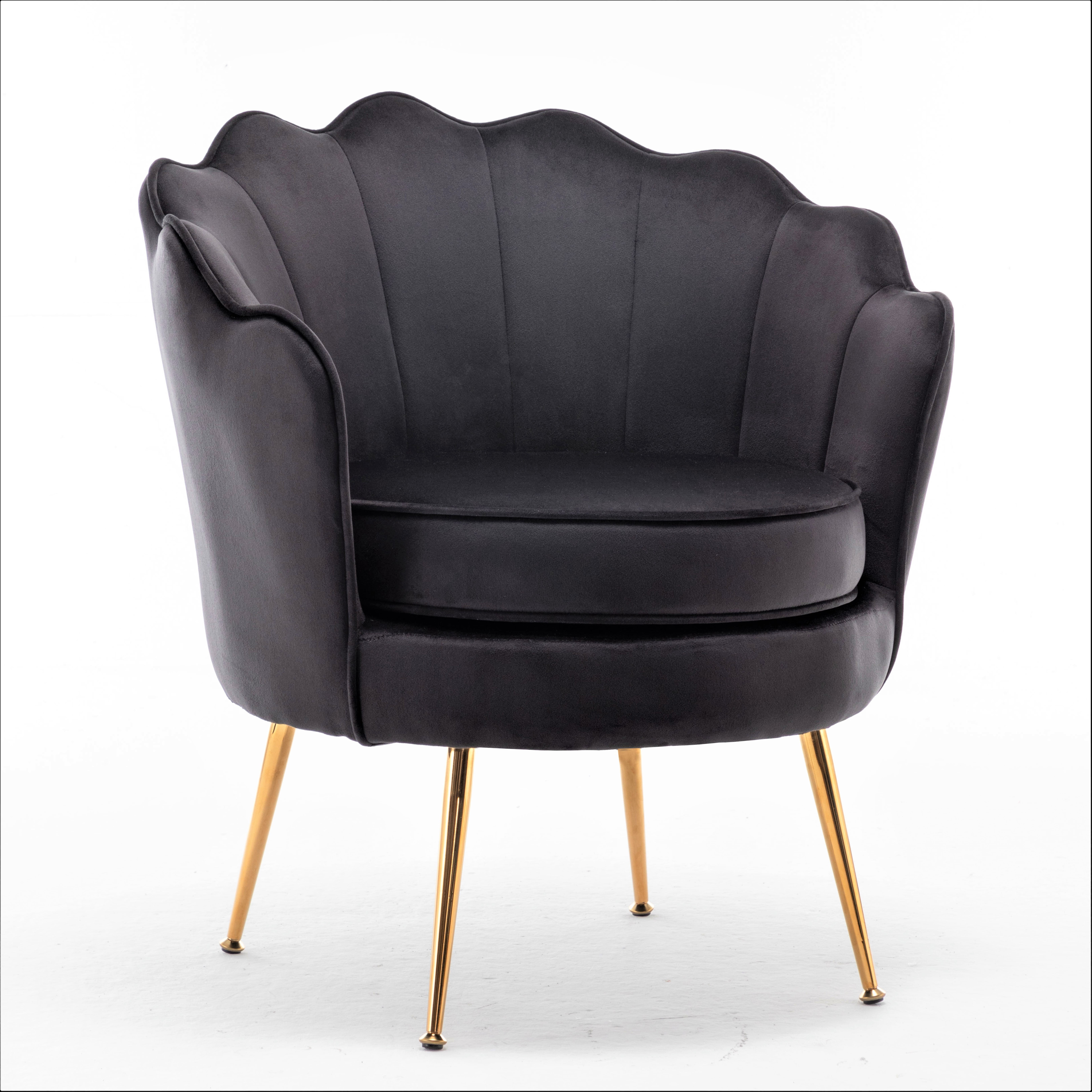 This barrel chair has a striking silhouette to creat a glam addition to your living room. It’s built with solid wood frame and features metal legs with a bold gold finish external. The dramatically curved back has a scalloped top edge that’s amplified. This armchair is upholstered in velvet and filled with foam for just the right amount of support as you sit. Additional trim around the back edge and circular seat give it a tailored touch, this chair works in traditional, modern, and contemporary spaces alike.