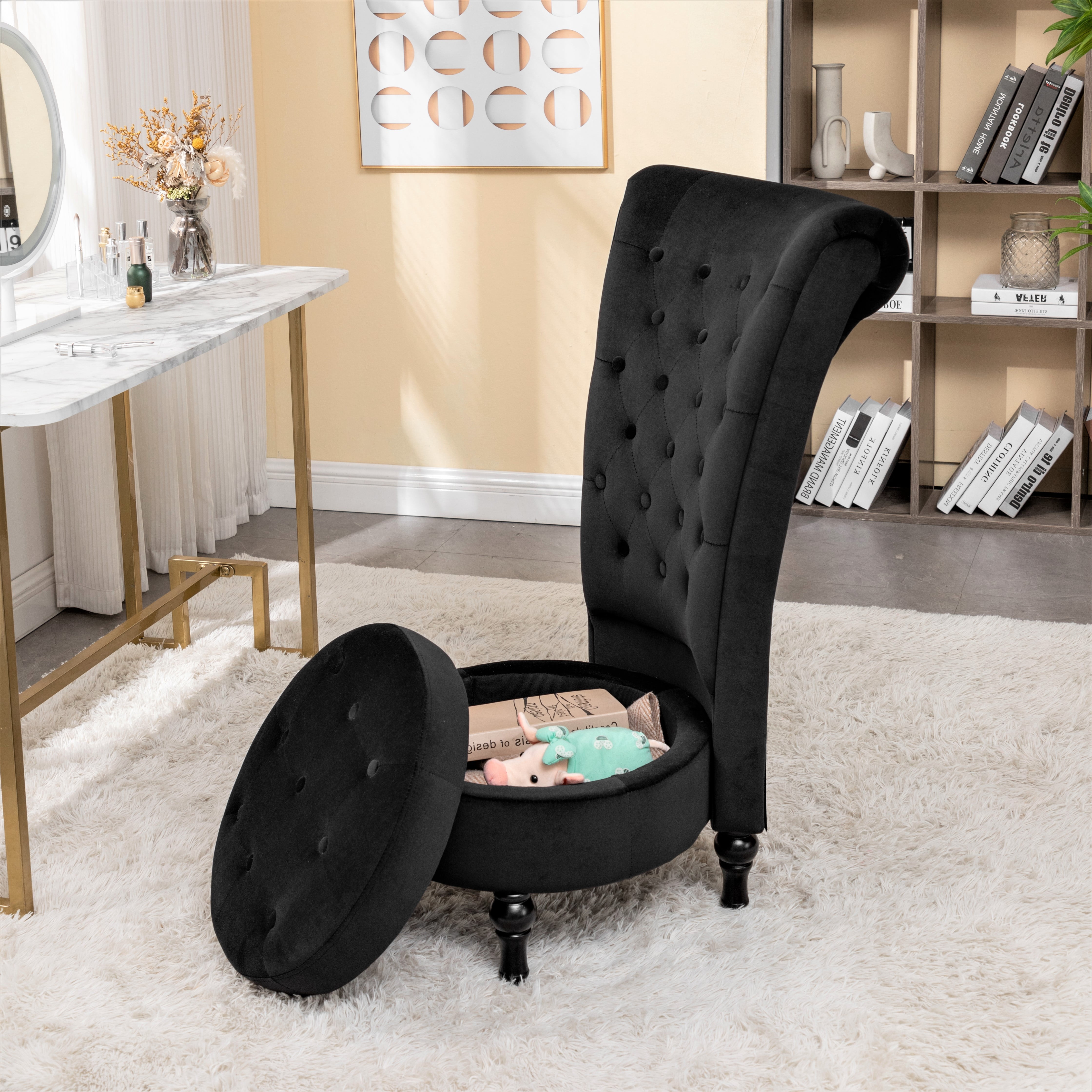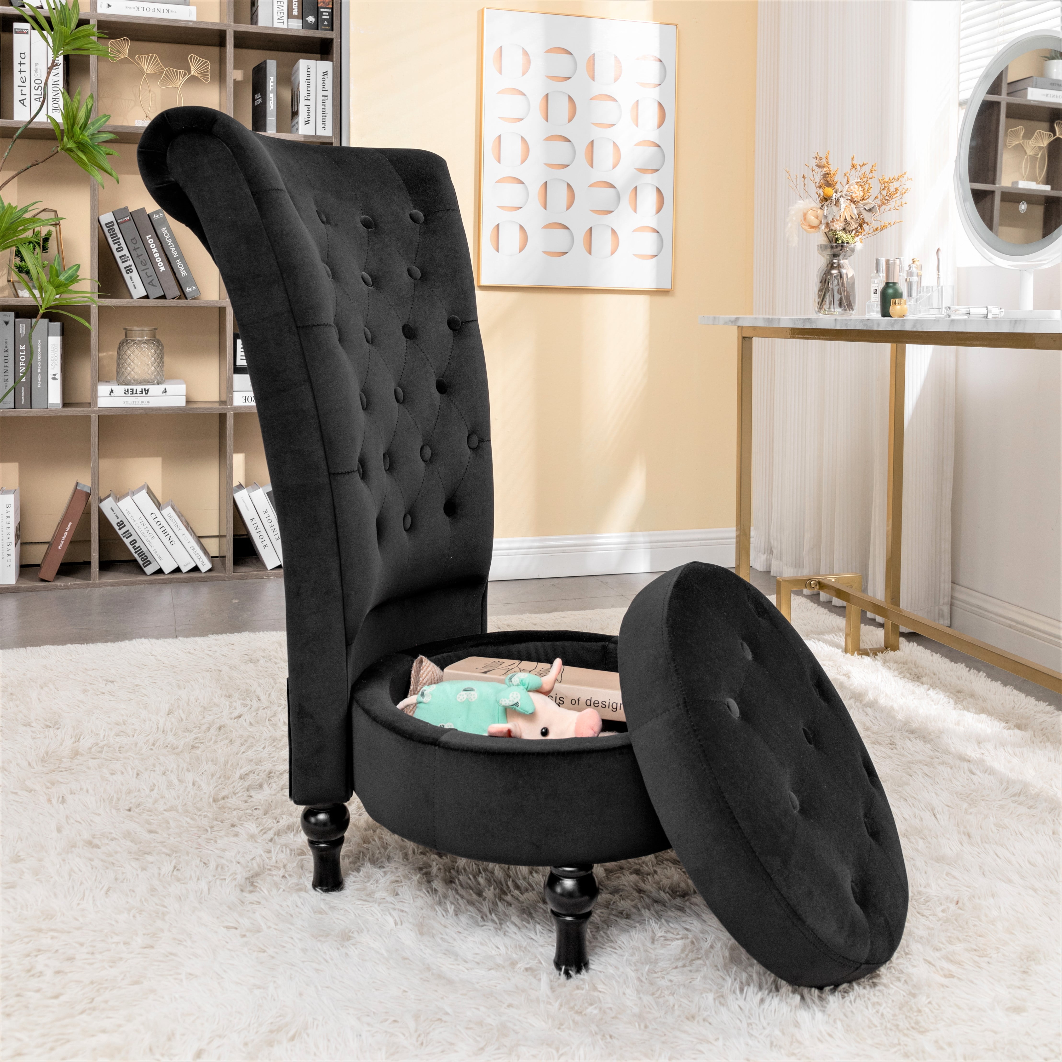 This living room chair adopts a retro style, this royal high-back velveteen tufted chair and the high-back design provides a more unique decoration, stylish sitting, while colorful velveteen upholstery gives this chair a stunning, unique appearance that is sure to stand out in all the right ways, which complements your modern room. It is an excellent choice for any family. This chair with a storage space under the seat has been offered to store your essentials, such as styling electricals, books, and some secret items, very suitable for living room. Dressing room, bedroom, lounge, office. No matter how busy your life is, it will provide you with a comfortable and practical private space to make your life more refined.