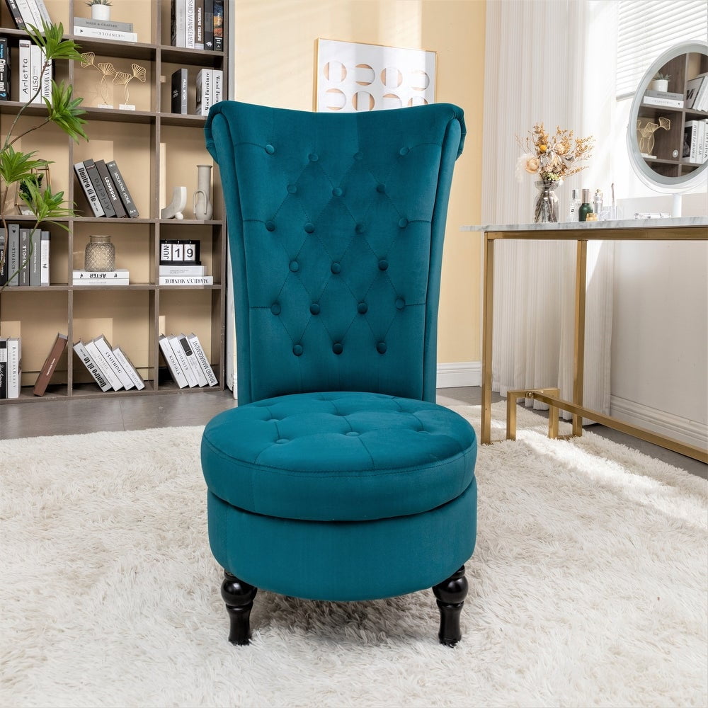 This living room chair adopts a retro style, this royal high-back velveteen tufted chair and the high-back design provides a more unique decoration, stylish sitting, while colorful velveteen upholstery gives this chair a stunning, unique appearance that is sure to stand out in all the right ways, which complements your modern room. It is an excellent choice for any family. This chair with a storage space under the seat has been offered to store your essentials, such as styling electricals, books, and some secret items, very suitable for living room. Dressing room, bedroom, lounge, office. No matter how busy your life is, it will provide you with a comfortable and practical private space to make your life more refined.