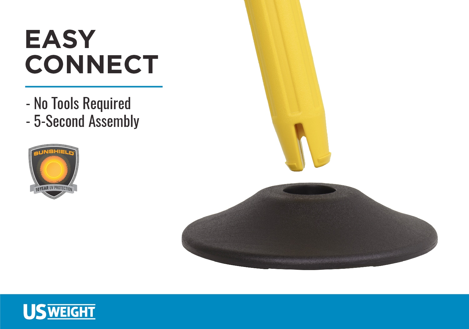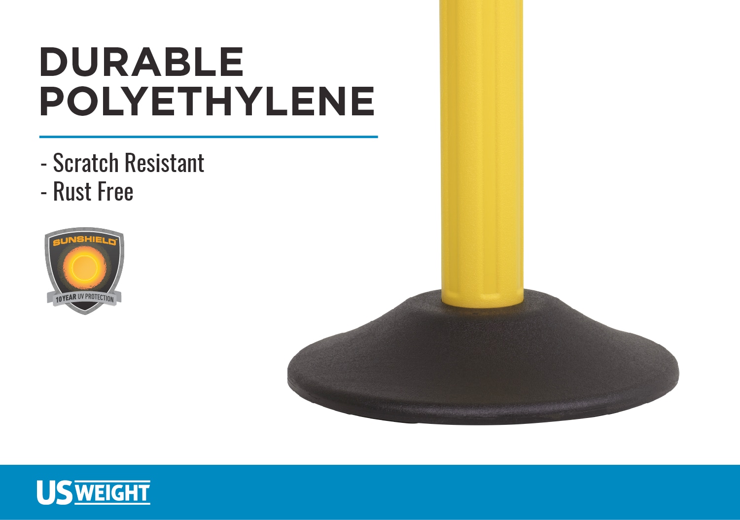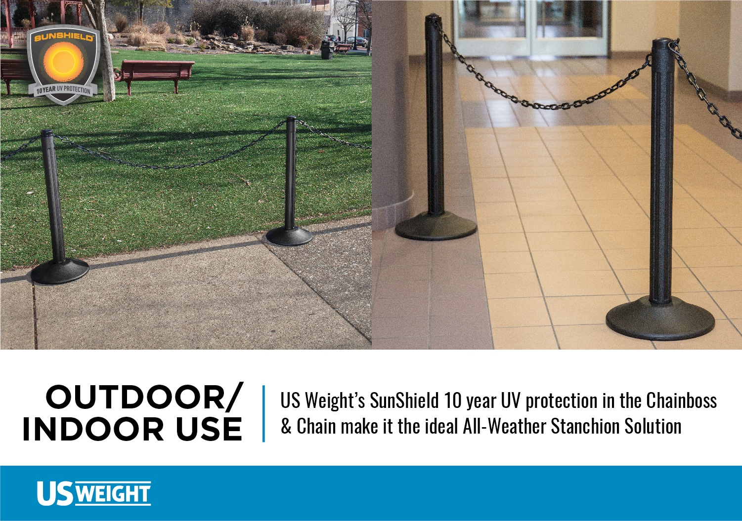 Built to withstand the demands of the toughest environments, the US weight chain boss can be used both indoors and outdoors. Made in the united states, the chain boss is equipped with features perfect for safely controlling crowds, directing the flow of foot traffic, or protecting a closed area for construction or cleaning. The chain boss features patented integrated chain storage system so chain is stored inside the post when not in use for incredible convenience. Then, easily pull the chain out of the post using the twist-lock top which allows for easy chain disbursement. The stanchions feature sun shield, 10 year UV protection and include a durable, scratch-resistant high-density polyethylene base that is weighted to 15 lbs. on the bottom of the base are no-skid, non-marking rubber feet keeping the post in place even during rough use. No tools are required for assembly. The easy connect snap together construction between the post and base takes less than 5 seconds and is easy as 1, 2, 3. easily customize the stanchions to fit your need with different post colors and several chain options to choose from. Also, choose from factory refilled, weighted bases or user-fillable bases. The chain boss is only compatible with the U2513 sign holder to advertise sign age (sold separately). US weight, located in Illinois, delivers all-weather durability and excellence with the chain boss.
