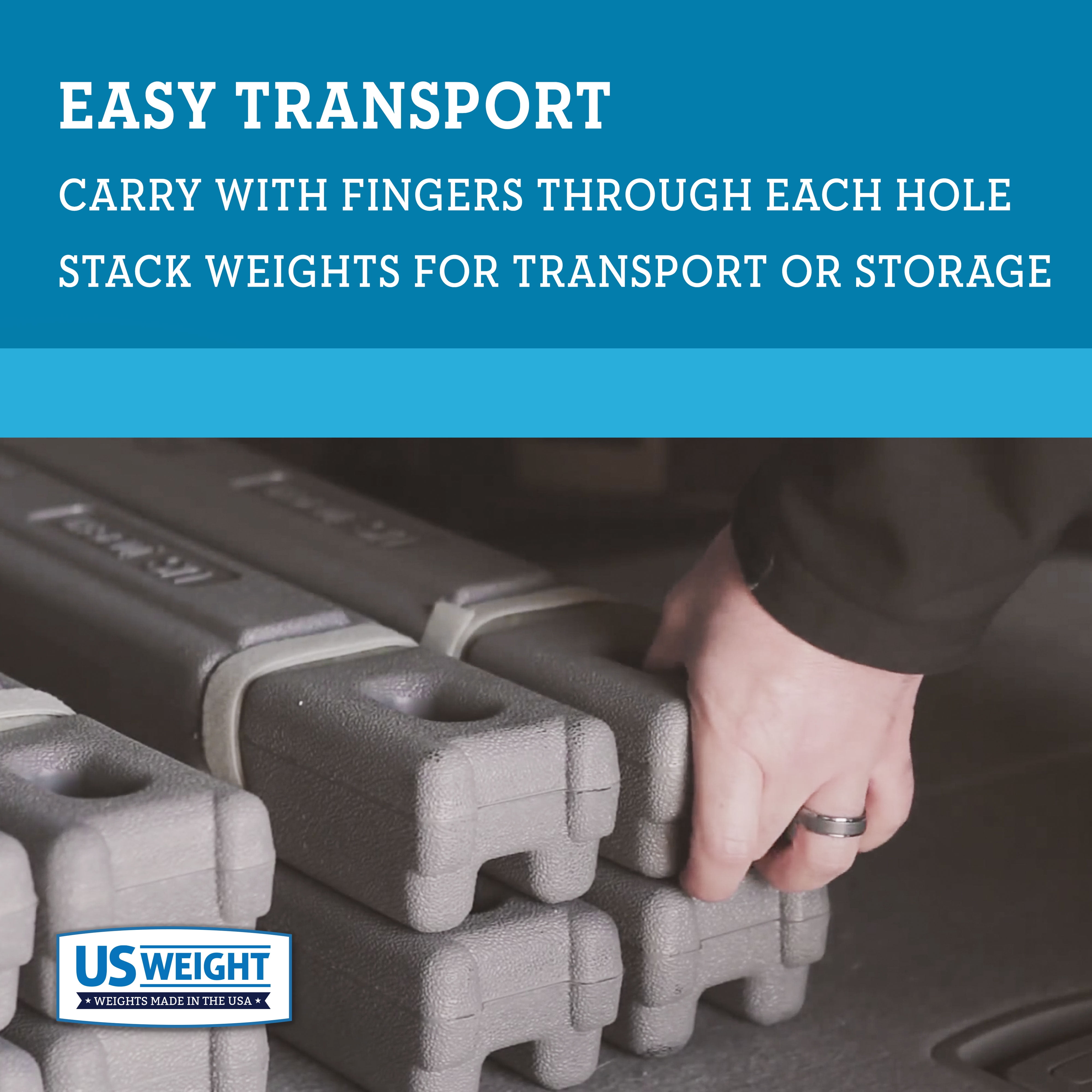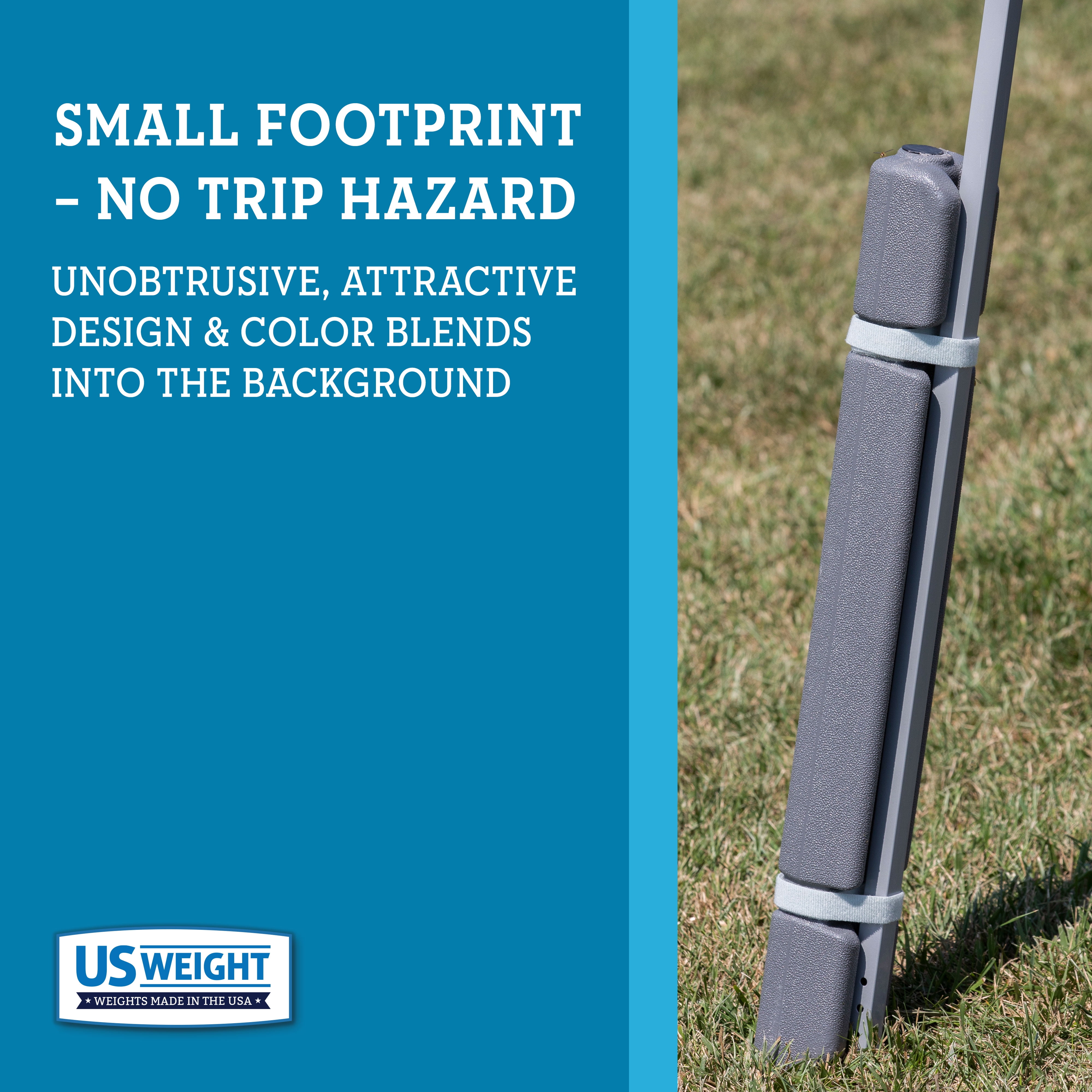 This US Weight The Ingot Canopy Weight will help keep your structure firmly in place. Windblown canopies are the number-one cause of property damage and injuries at outdoor events where they are widely used. You want to do everything you can to be safe. These weights can be hung vertically and can be chained together for serious holding power under extreme weather circumstances. They also attach horizontally to hang from cross braces. Velcro straps are included to make either method of securing them quick and easy. They have a solid core of very high strength ferroconcrete. This same technology is used by the US military in designing more effective blast barriers. The solid core is encapsulated by a rugged high-density polyethylene shell that will not rust or leak. The army canopy weight is designed to be used in rain or shine. It will not rust or corrode. You can use it on almost all canopy legs up to 2-1/2″ in diameter.