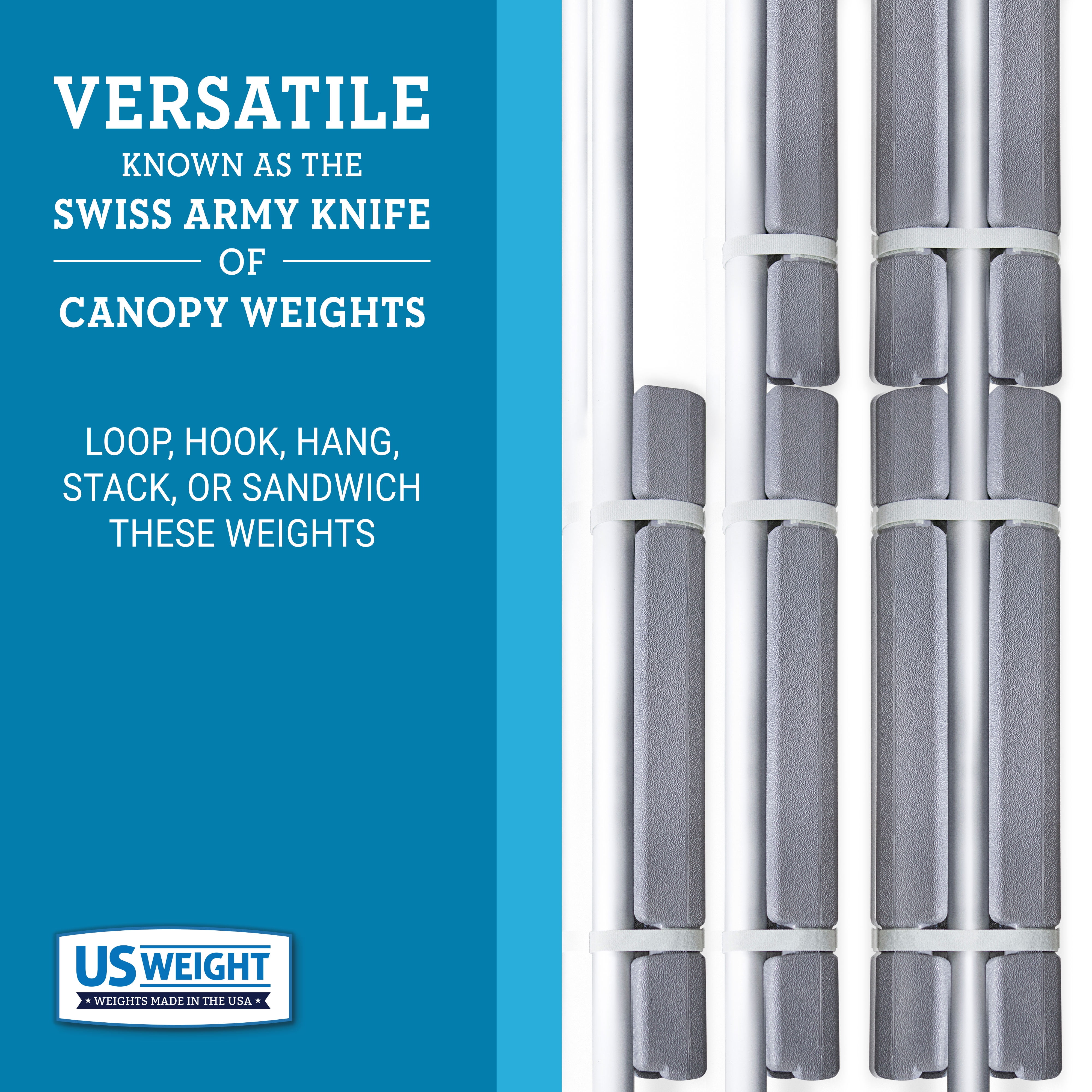 Secure tents, canopies, and umbrellas at outdoor events with these Ingot canopy weights Set includes four 15-pound canopy weights with Velcro straps to attach to tent legs Ingot weights fit all canopy legs up to 2.5″ in diameter Slim design is easy to stack or hang and greatly reduces tripping hazards High-density polyethylene weights are filled with a very high-strength ferro concrete