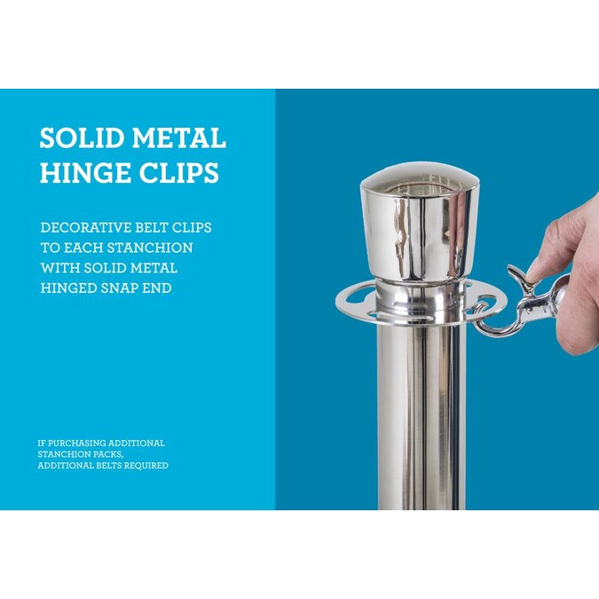 - Includes two chrome stanchions and one 6 ft long velvet rope with solid metal, hinged belt clips