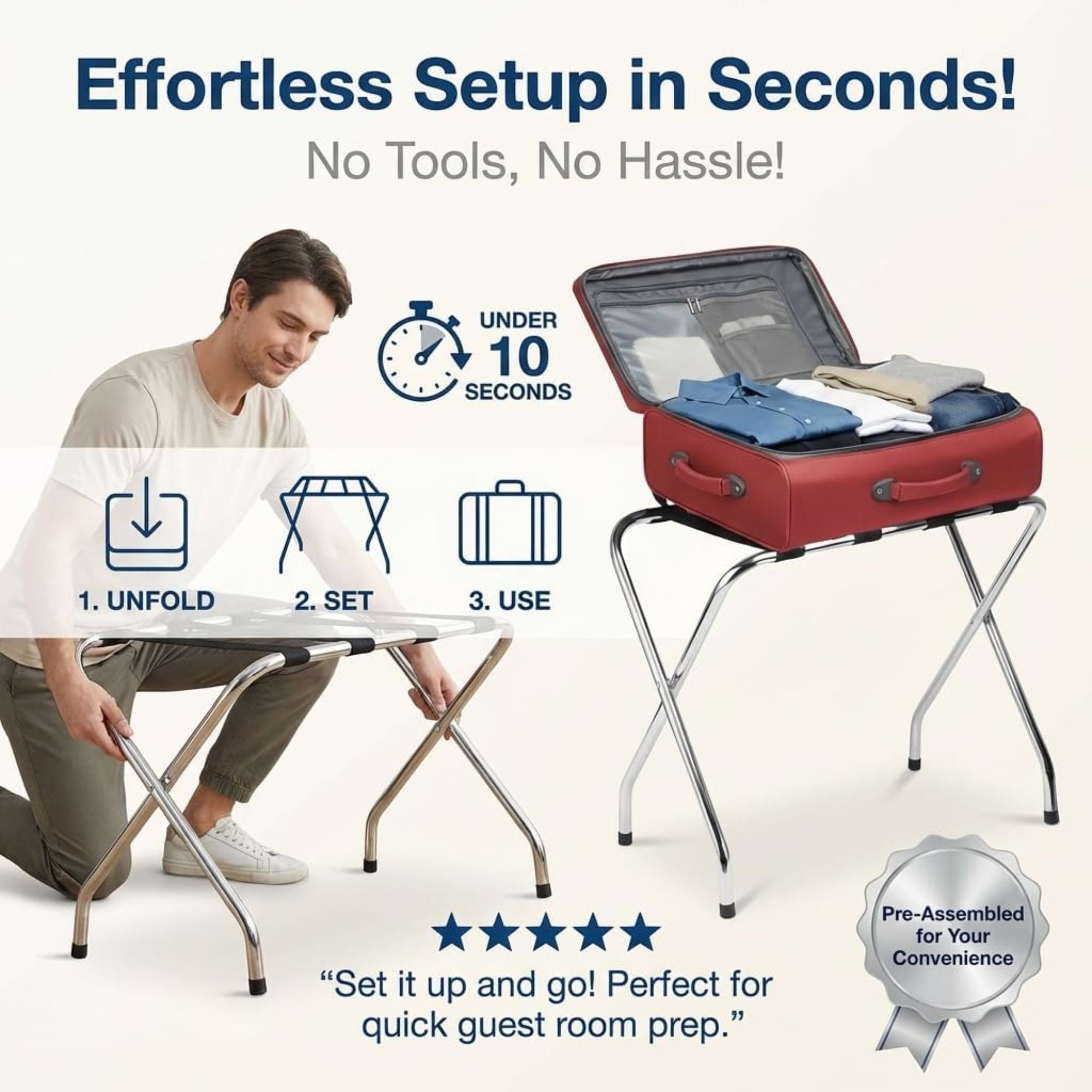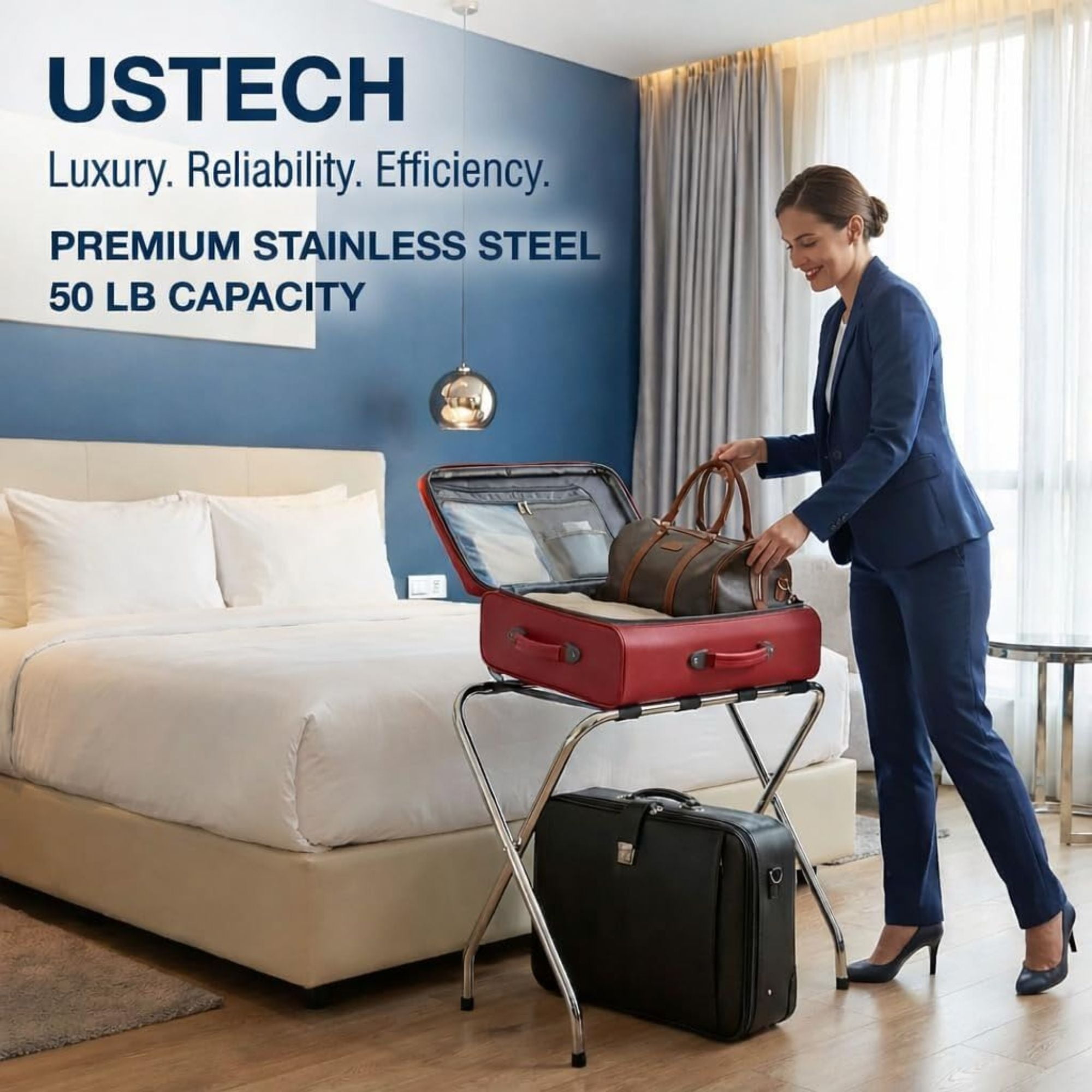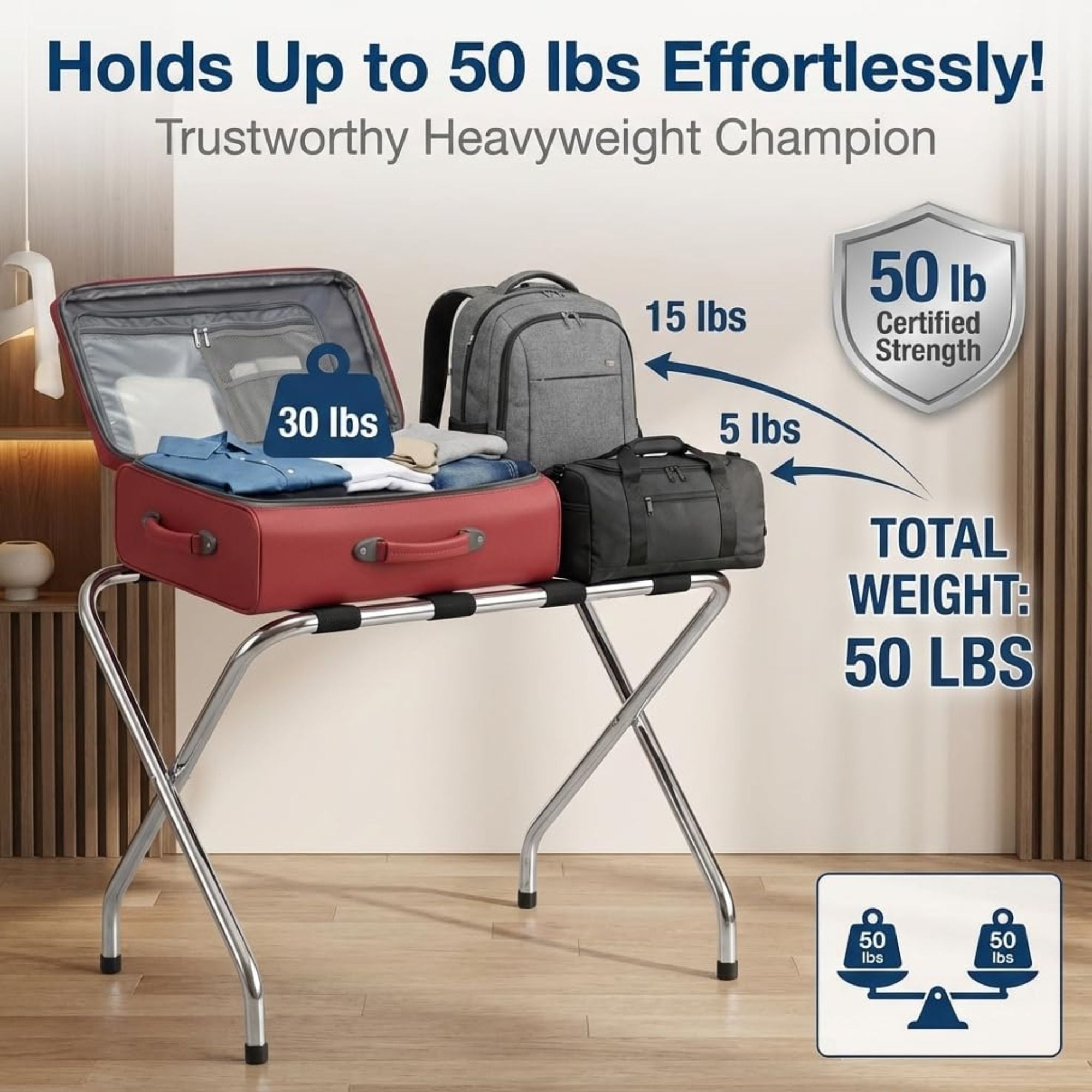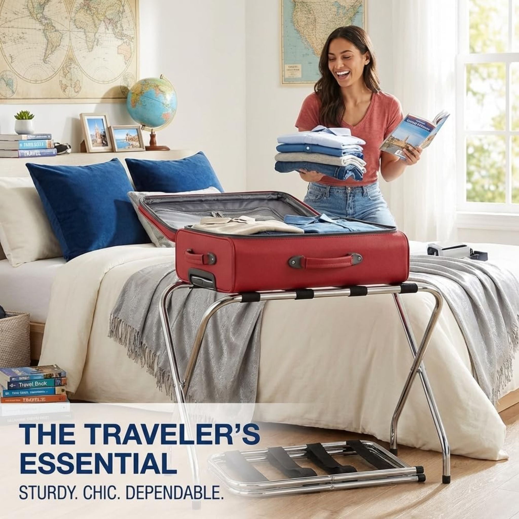 The USTECH 2-Tier High Back Chrome Folding Luggage Rack provides a sturdy and stylish spot for luggage, shoes, and bags. It features a second shelf for extra storage and a high back for wall stability. Made from durable steel with a sleek chrome finish, it includes rubber feet to protect floors and four nylon straps for added support. The rack requires no assembly and folds flat for easy storage.