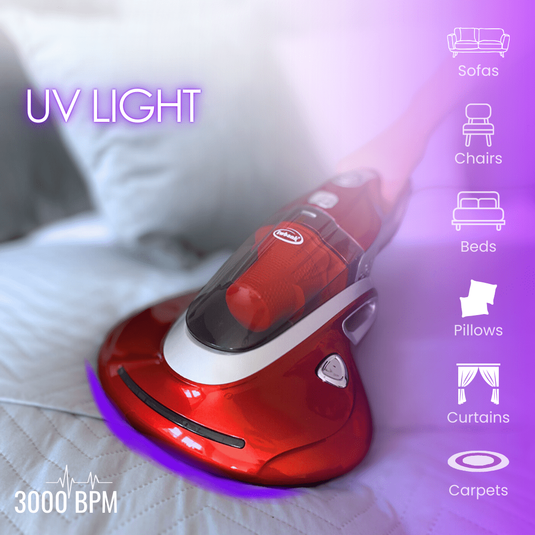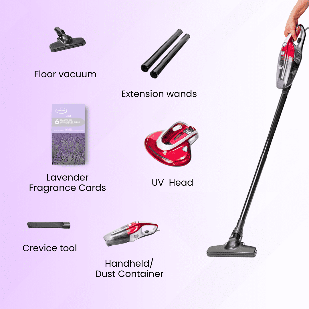 Powerful UV-C Light: Removes dust and allergens without any chemicals, for a cleaner and healthier home environment. Versatile Design: Easily converts from a floor vacuum to a handheld for convenient cleaning of various surfaces. Comprehensive Attachments: Comes with a UV head, handheld, crevice tool, extension wands, floor head, and more, for all your cleaning needs. Deep Cleaning: Ideal for cleaning your bed, mattress, pillows, and sofa, providing a thorough clean. Multi-Surface Use: Perfect for household objects like curtains, pillows, toys, furniture, cabinets, and more. Dust Reduction: 2-stage allergy filtration significantly reduces exposure to harmful dust particles, promoting better indoor air quality. Fresh Fragrance: Sleep peacefully with lavender scented fragrance cards that leave your mattress smelling fresh. High-Frequency Vibration: Delivers a deep clean with 3,000 beats per minute, removing embedded dirt and dust. Safety Features: Equipped with a 3-point safety cut-out to ensure safe operation.