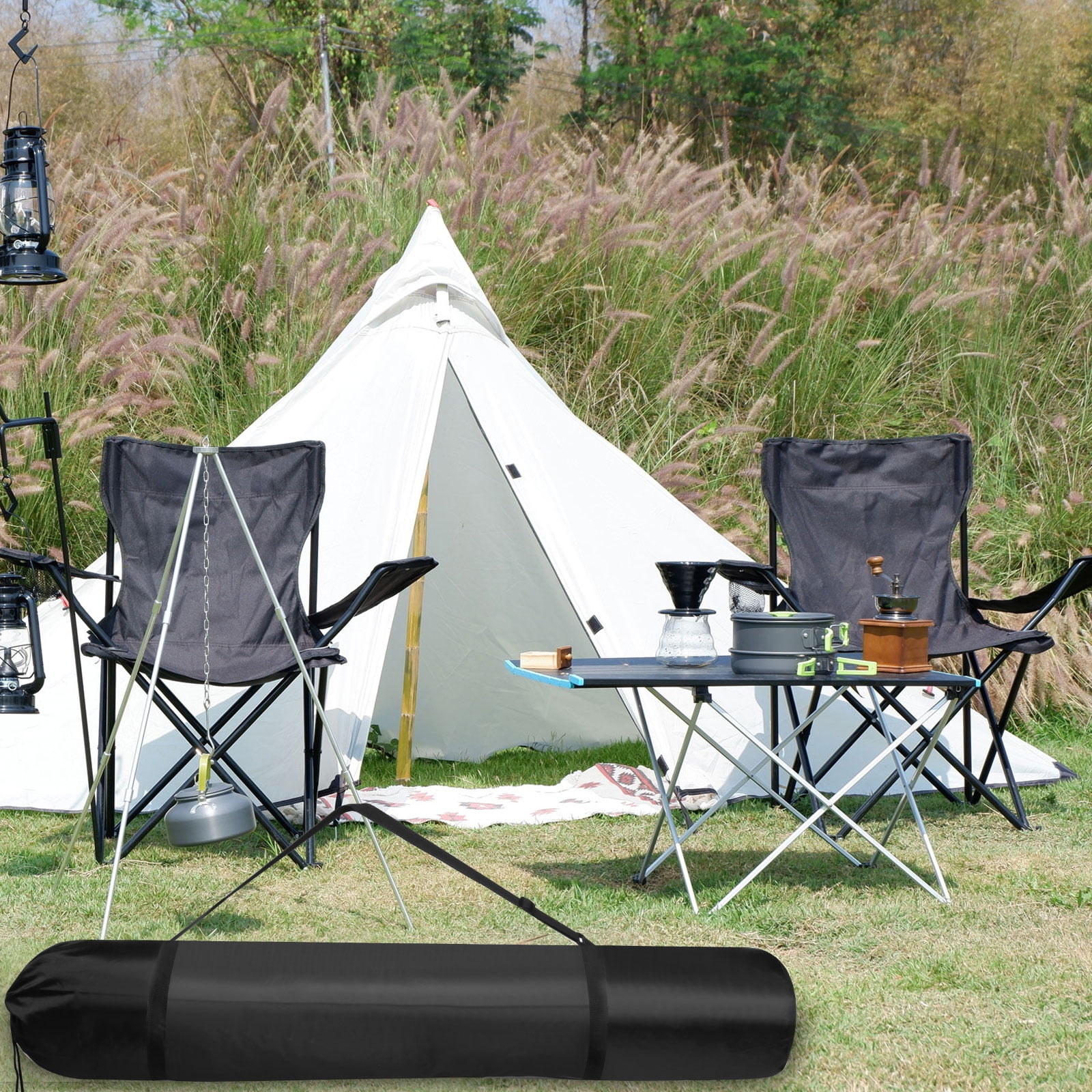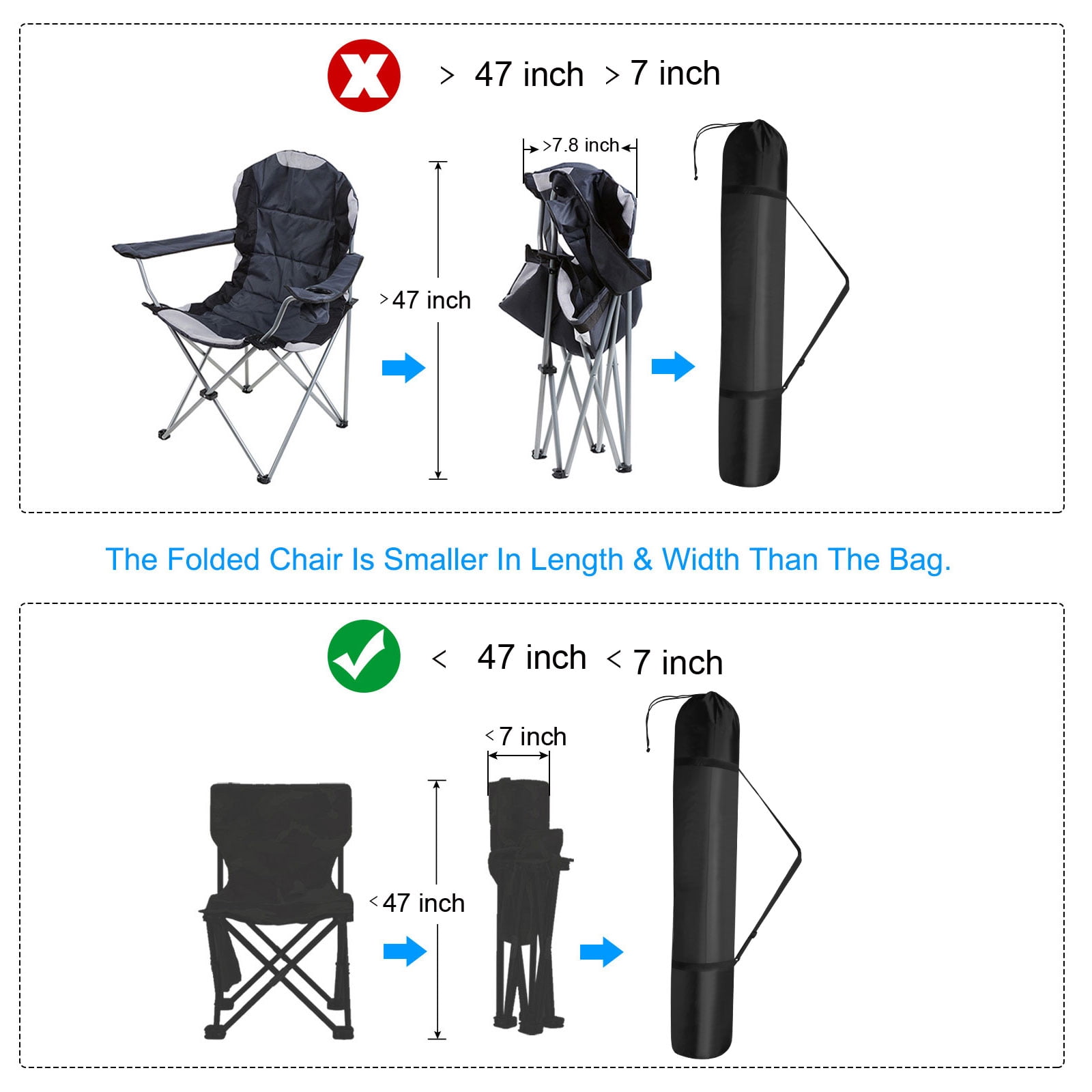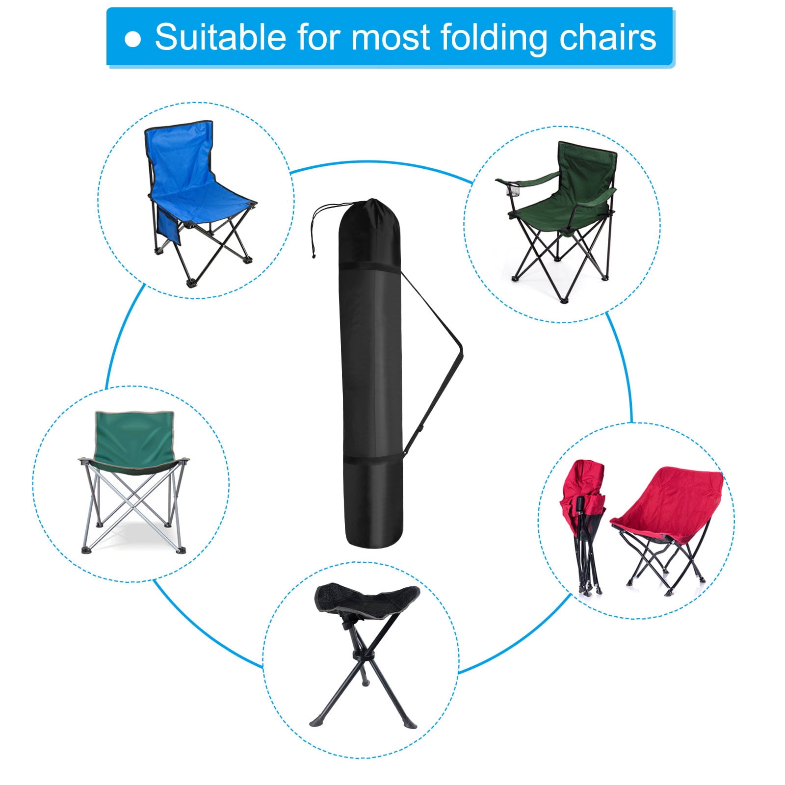 The folding chair storage bag is suitable for small folding chairs, yoga mats, blankets, umbrellas, tripods, monopods, flash light stands, etc., which are smaller than its size after being folded. It is widely used in camping, traveling, hiking, outdoors, etc.. The chair carrying bag is made of durable and waterproof 210D Oxford cloth, which will protect your folding chair from dust and scratches when not in use. The round bottom design can realize three-dimensional storage. Drawstring closure allows for quick and smooth storage of the foldable chair. Adjustable shoulder strap design, more convenient to carry. Put the appropriate size folding chair into the camping bag then zip it up. Please check the size of the folding chair before ordering to ensure that the diameter can be put into the storage bag.