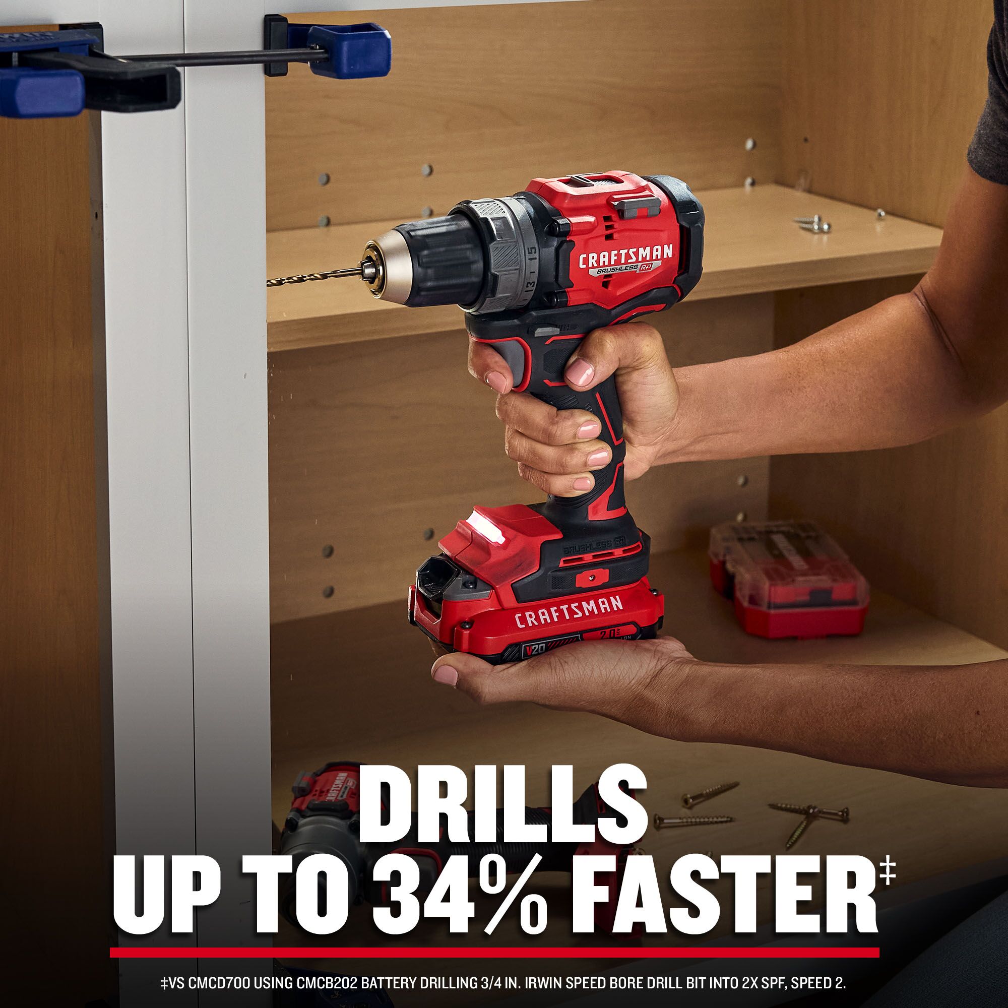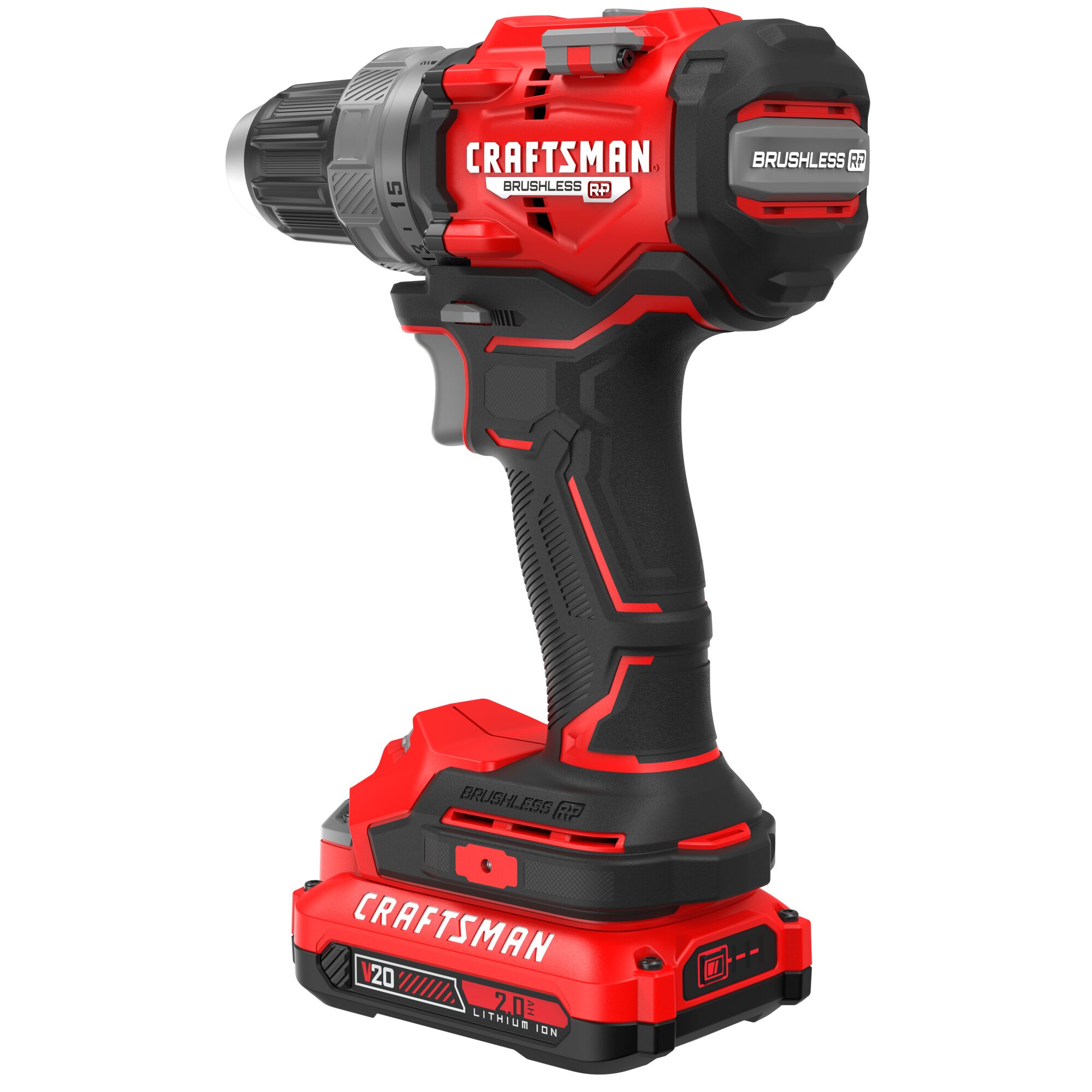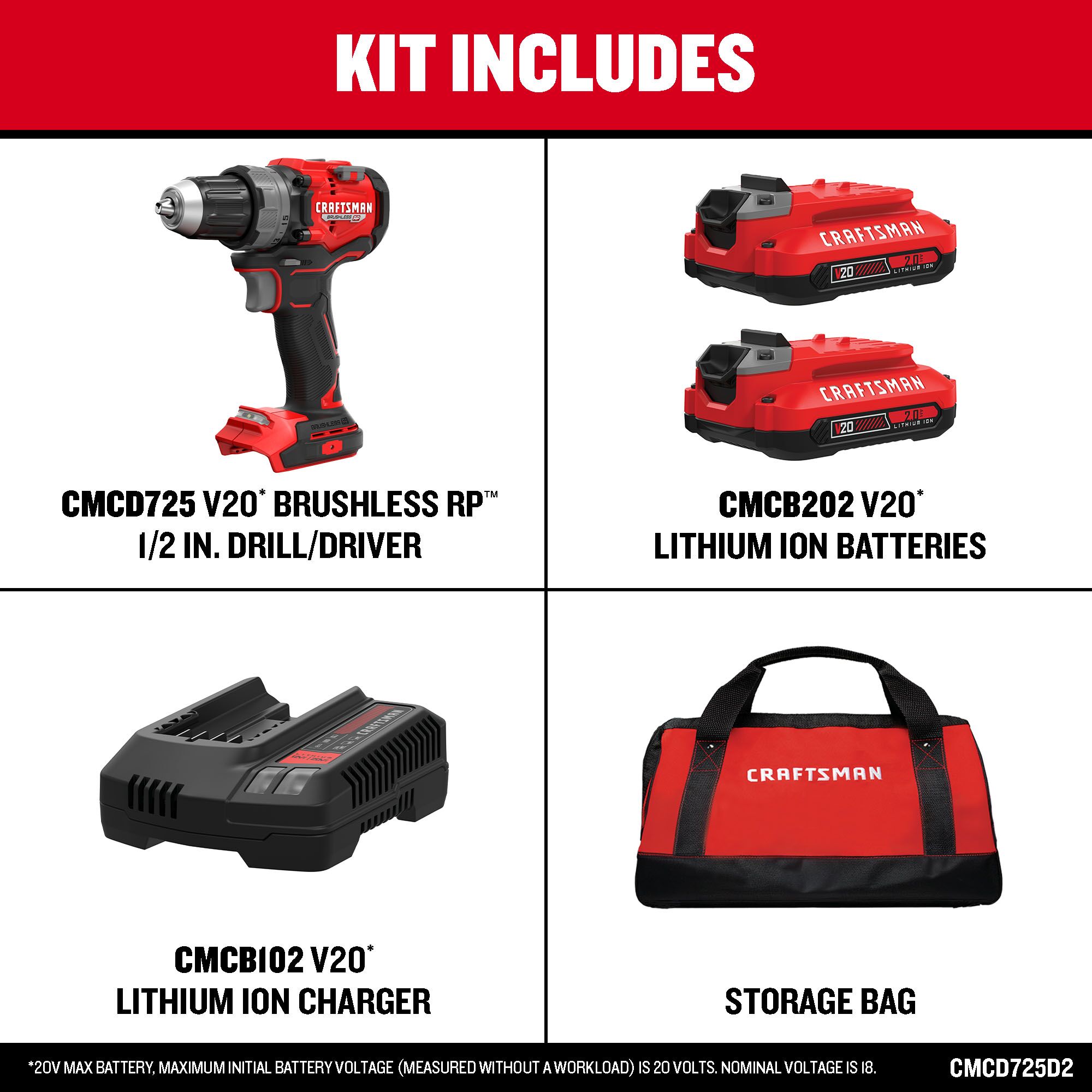 Step up to More Runtime and Better Performance™ with the V20* BRUSHLESS RP™ Cordless 1/2 in. Drill/Driver that offers up to 60% more power** and 34% faster drilling†. Work for extended periods of time with a brushless motor that has a 2 speed gear box and drills up to 2,000 no-load RPM and 130 holes per charge†. The convenience of an on-board LED, bit holders, and belt hook allow you to focus on the task at hand. With 2 included V20* 2Ah batteries and a charger, this kit is ready for all your drilling and fastening needs.