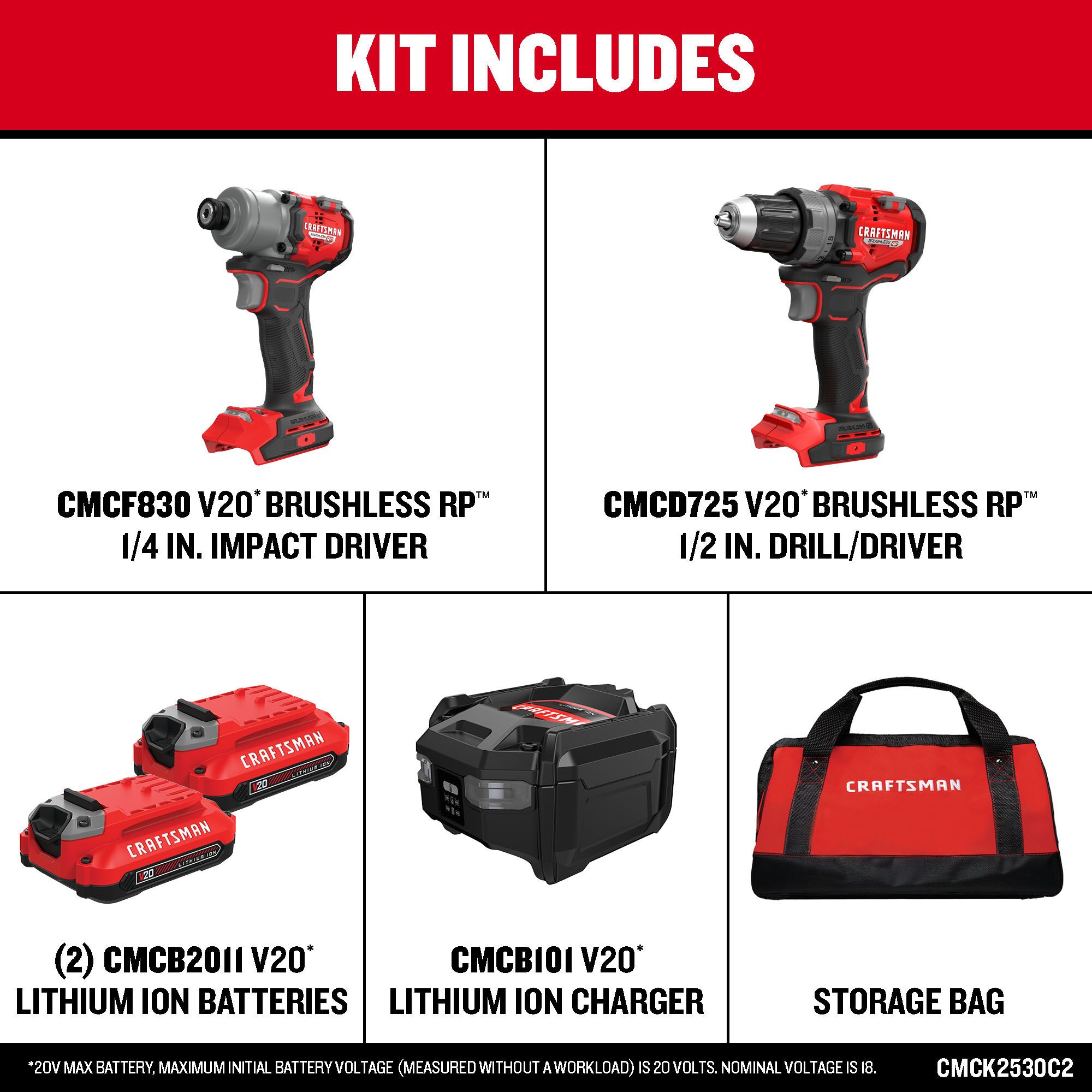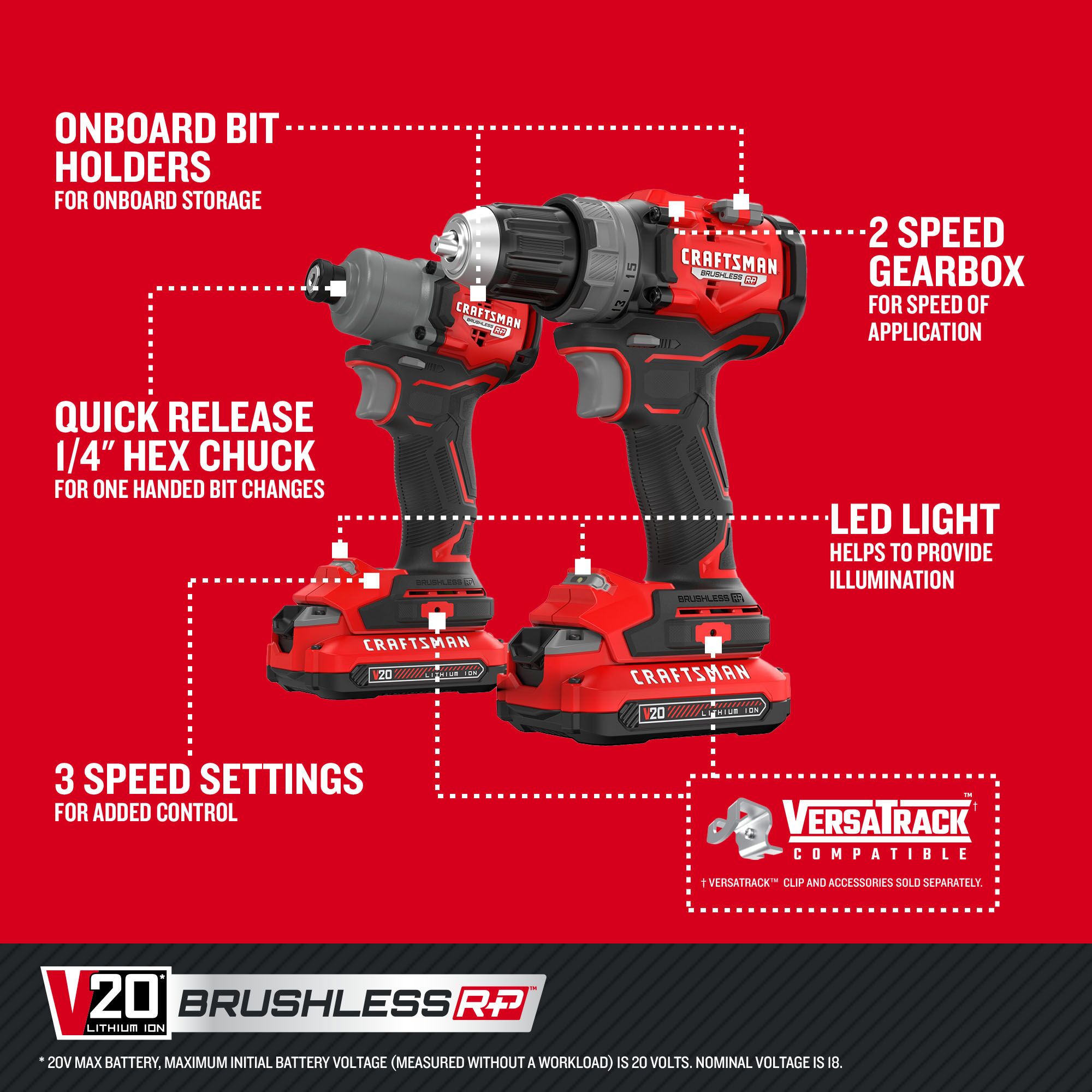 Step up to More Runtime. Better Performance™ with the V20* BRUSHLESS RP™ 2 Tool Combo Kit, ready for all your drilling and fastening needs. Both cordless tools are equipped with powerful BRUSHLESS RP™ motors that can take on a variety of applications. The 1/2 in. Drill/Driver has up to 60% more power†† and features a 2 speed gear box that drills up to 2,000 no-load RPM. The 1/4 in. Impact Driver has up to 23% More Max Torque with 1800 in-lbs of max driving toque, as well as 3 speed settings and a max speed of up to 3,200 no-load RPM. Each tool features built-in functionality with an on-board LED, bit holder, and belt hook. Complete with two batteries, this kit has the power to do it all: Build. Repair. Restore. Maintain.