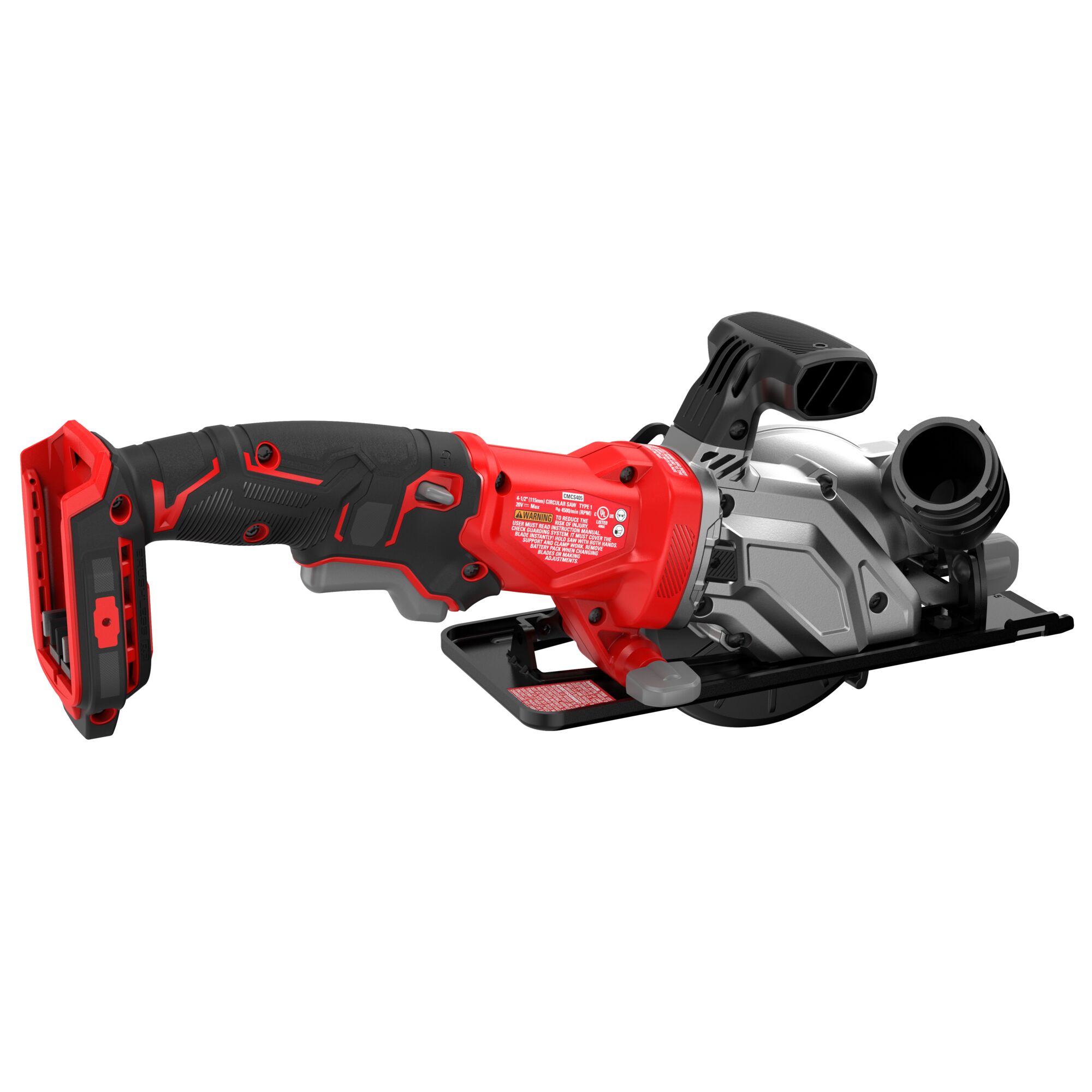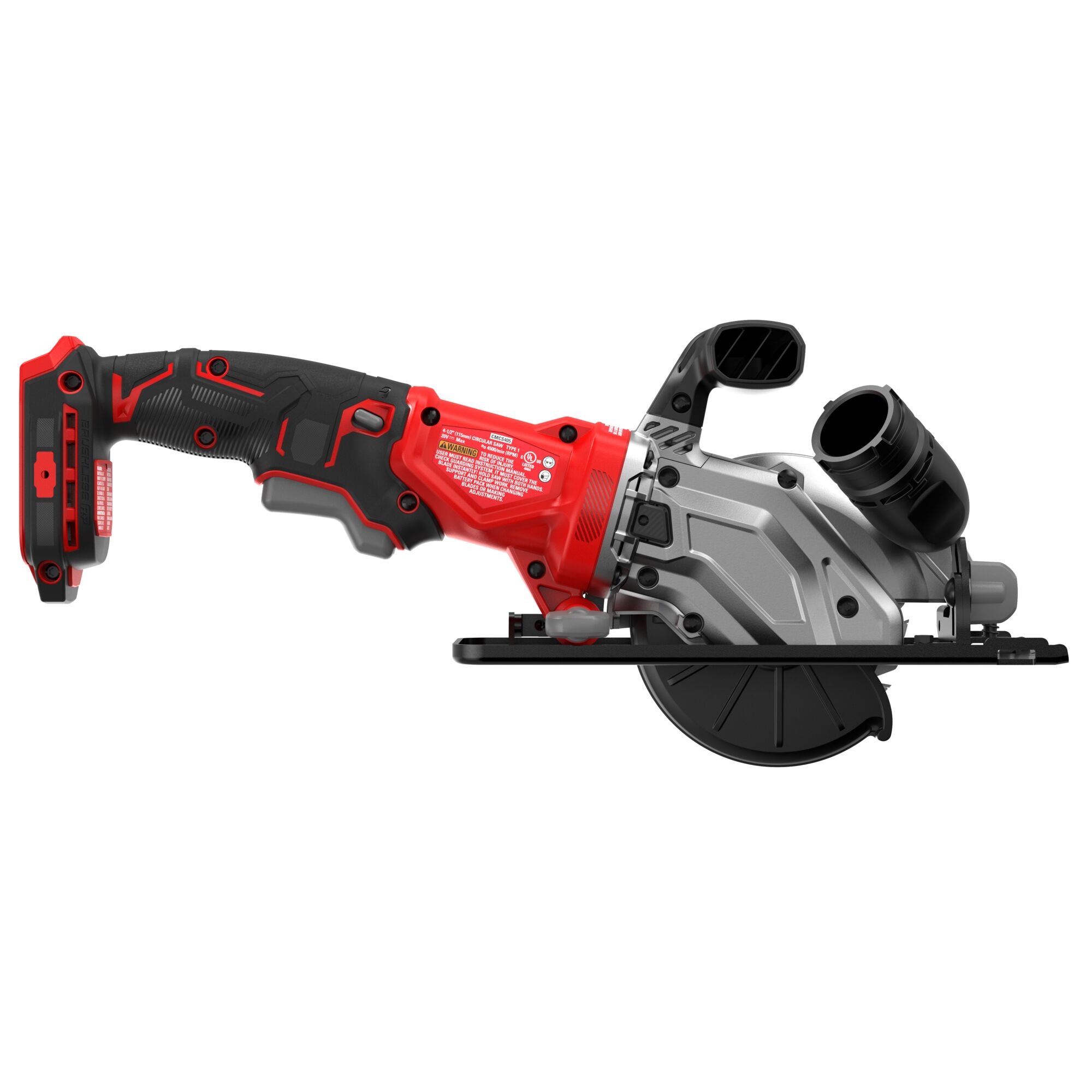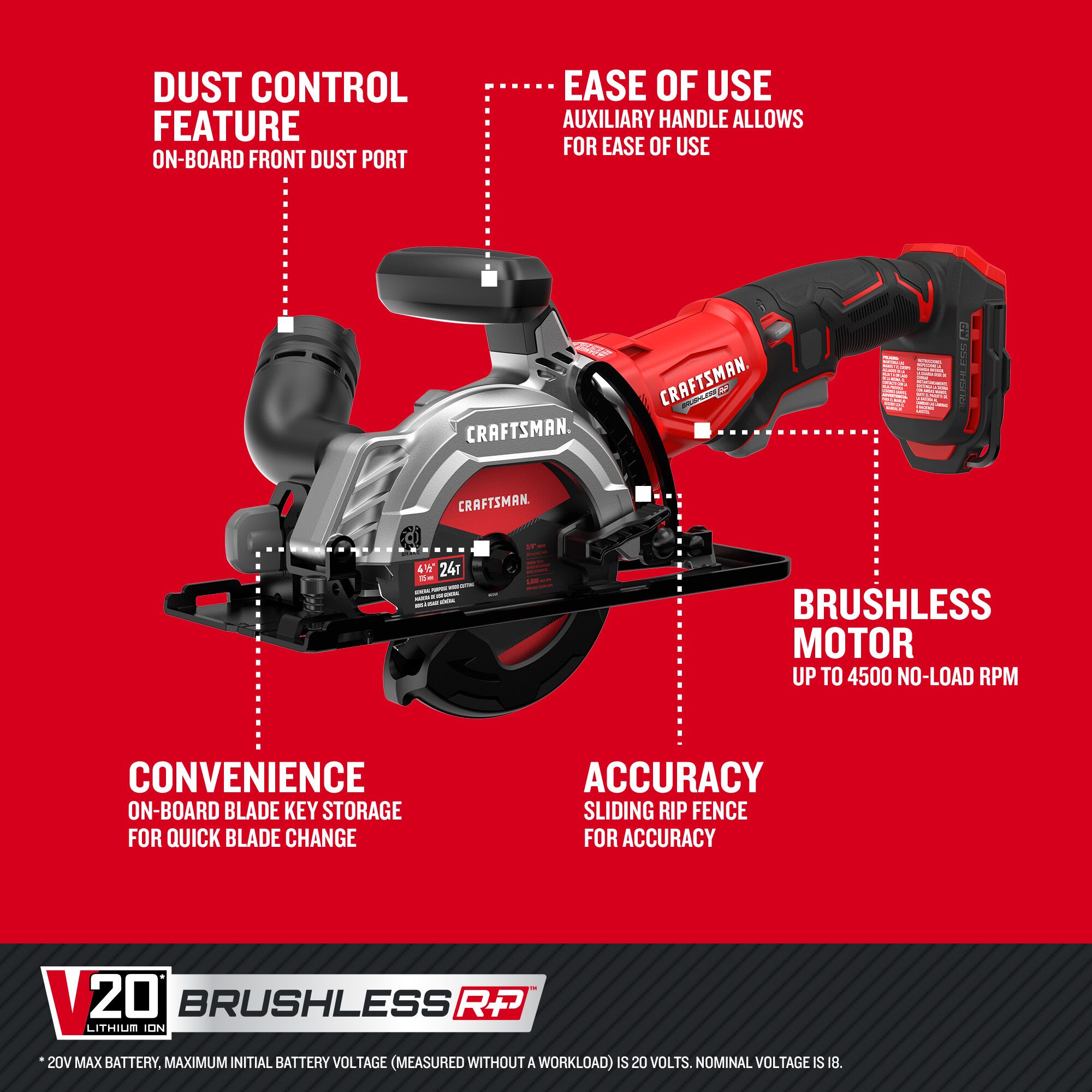 Step up to More Runtime and Better Performance™‡ with the V20* BRUSHLESS RP™ Cordless 4-1/2 in. Circular Saw. Its lightweight design makes it perfect for tight spaces and extended-reach applications. The brushless motor delivers up to 4,500 no-load RPM for efficient cutting through various materials. With a 4-1/2” blade, you can cut 2x material at 90° and 1x at 45°. The auxiliary handle enables one-handed operation and easy use. (Battery and Charger sold separately)