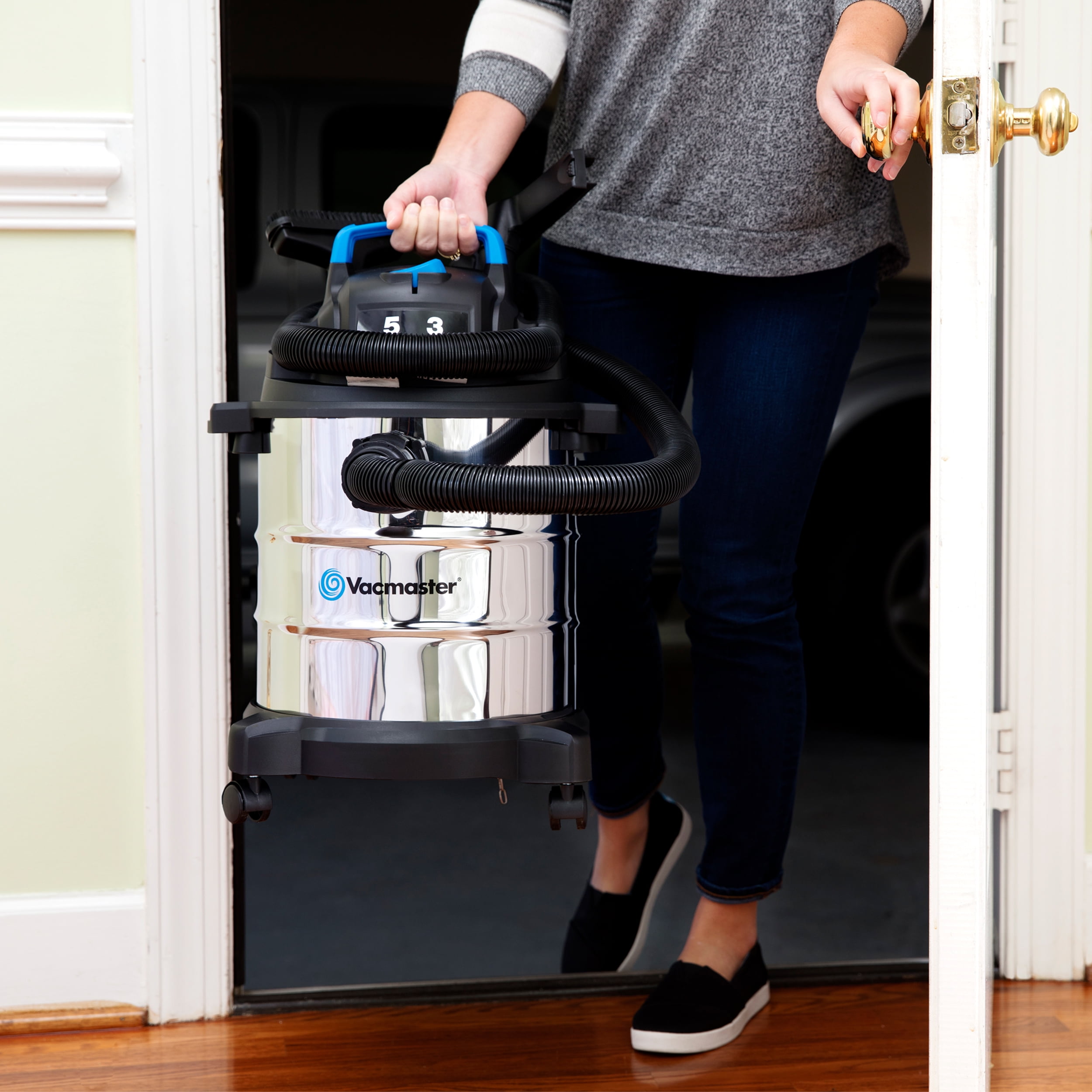 5 Gallon Stainless Steel Tank Powerful 3 Peak HP Motor Integrated Onboard Accessory and Hose Storage 8-Foot Cord and 6-Foot Hose Allow for 14-Feet of Cleaning Reach Durable Casters for Easy Transport Easily Converts to Blower Balanced Top Handle Design Large On/Off Switch 1-1/4” Hose and Attachments Includes: 6′ X 1-1/4″ Hose, (3) Extension Wands, Floor Brush/Squeegee Nozzle, 3-In-1 Utility Nozzle/Brush/Pet Hair Rake, Reusable Cloth Filter, Foam Wet Filter Manufacturer Model Number: VOC507S 2 Year Limited Warranty Tank Size refers to the actual tank volume, and does not reflect capacity available during operation Peak Horsepower is a term used in the wet-dry vac industry for consumer comparison purposes. It does not denote the operational horsepower output of a wet-dry vac, but rather the horsepower output of a motor, including the motor’s inertial contribution, achieved in laboratory testing. In actual use, motors do not operate at the peak horsepower shown.