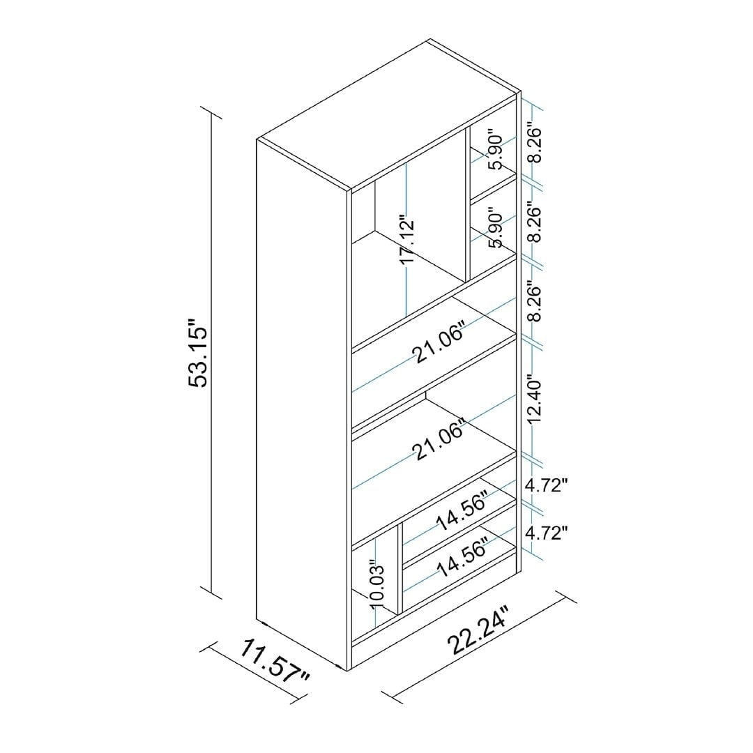 Mid-Century – Modern Bookcase for Living Room and Office Use. * Upon Assembly, Measures: 22.24 in. Length, 53.15in. Height, 11.57 in. Depth. * Includes all different sizes and shapes * Includes 8 Shelves * Space for books, photos, trophies and/ or collector items * Mix and Match with the Valenca Bookcase 1.0, 2.0 and 4.0 * Home Assembly Required. All Hardware Included *